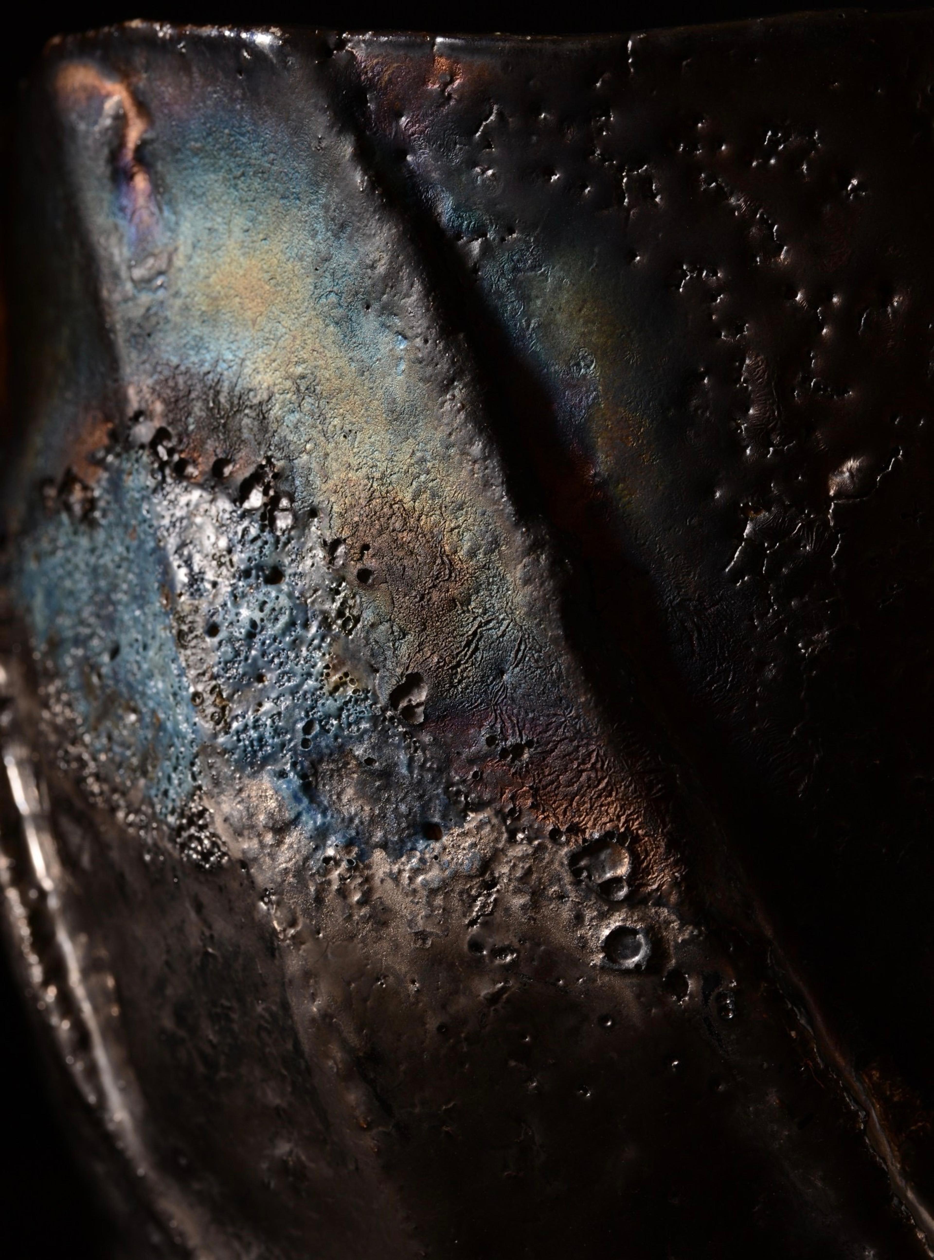 His ongoing body of work embodies the cultural heritage of Bizen, one of Japan’s Six Ancient Kilns, as well as Ishii-san’s contemporary perspective. The artist's use of layered, metallic glazes and asymmetrical forms draws inspiration from the sixteenth-century Oribe ceramic traditions. Oribe was a type of Mino ware first created during the Azuchi-Momoyama period (1573–1603). It is said that this, then new, type of ceramics reflected the taste of Oribe Furuta, a celebrated master of the Japanese tea ceremony. The introduction of Oribe marked a dramatic visual departure from the more monochrome and quieter forms most commonly found in Raku vessels of the time.