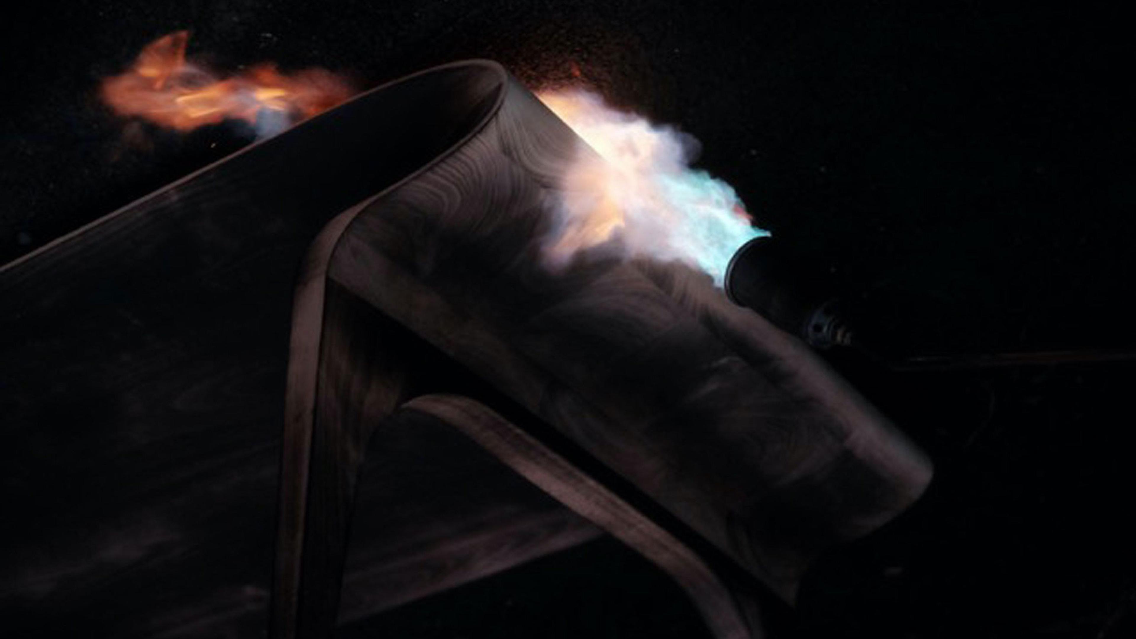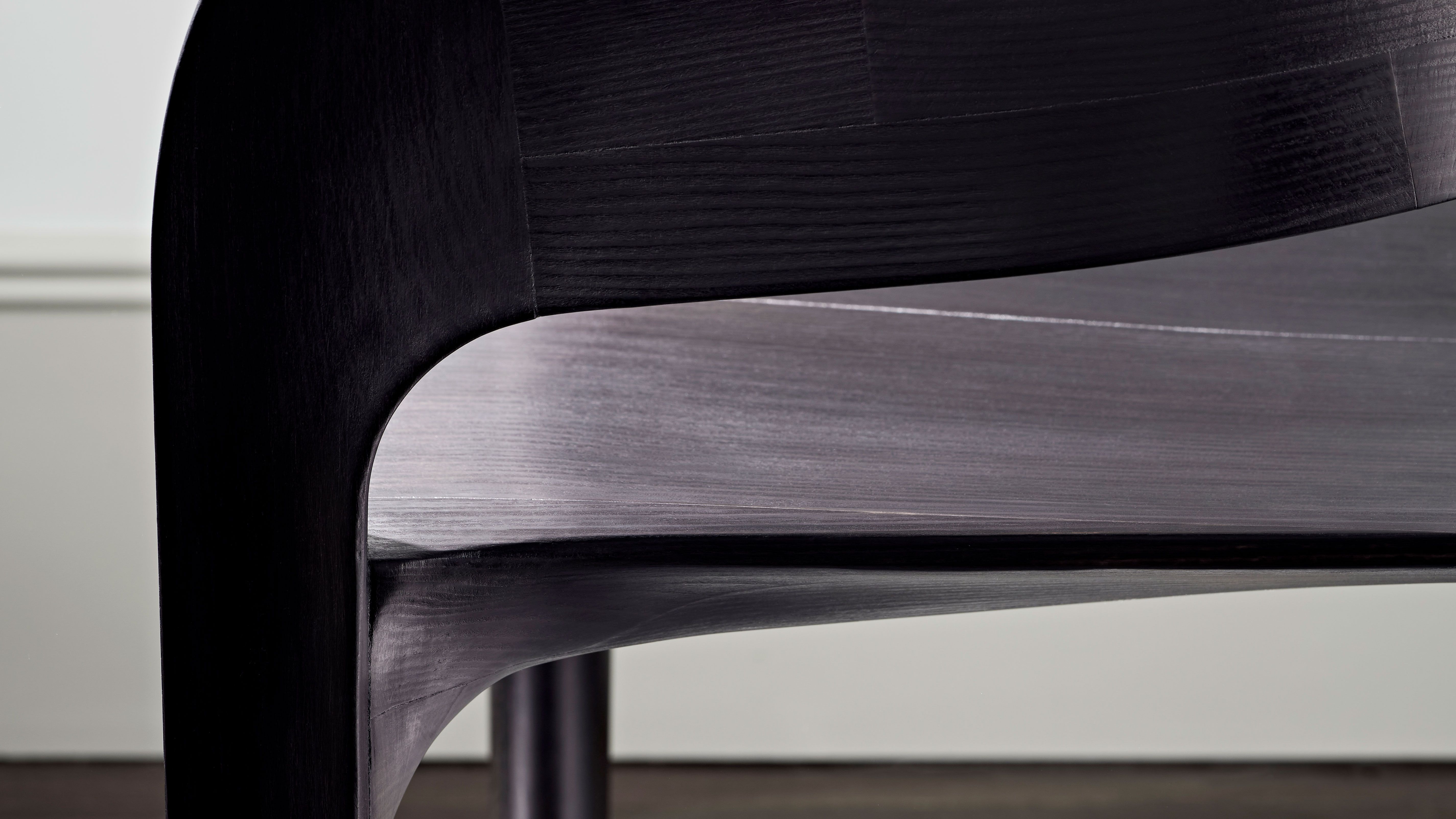 German designer Bodo Sperlein revisits the curves and organic lines of the 20th-century Art Nouveau with a contemporary twist, refining the silhouettes to its bare contour. The designer introduced the first Contour series in 2009. The fluidity and elegant simplicity of the curves result from the painstaking work of master artisans in northern Italy. The Contour chair featured here was carved in solid beechwood, charred with fire using the traditional Shou Sugi Ban technique, highlighting the textures and details of the wood.