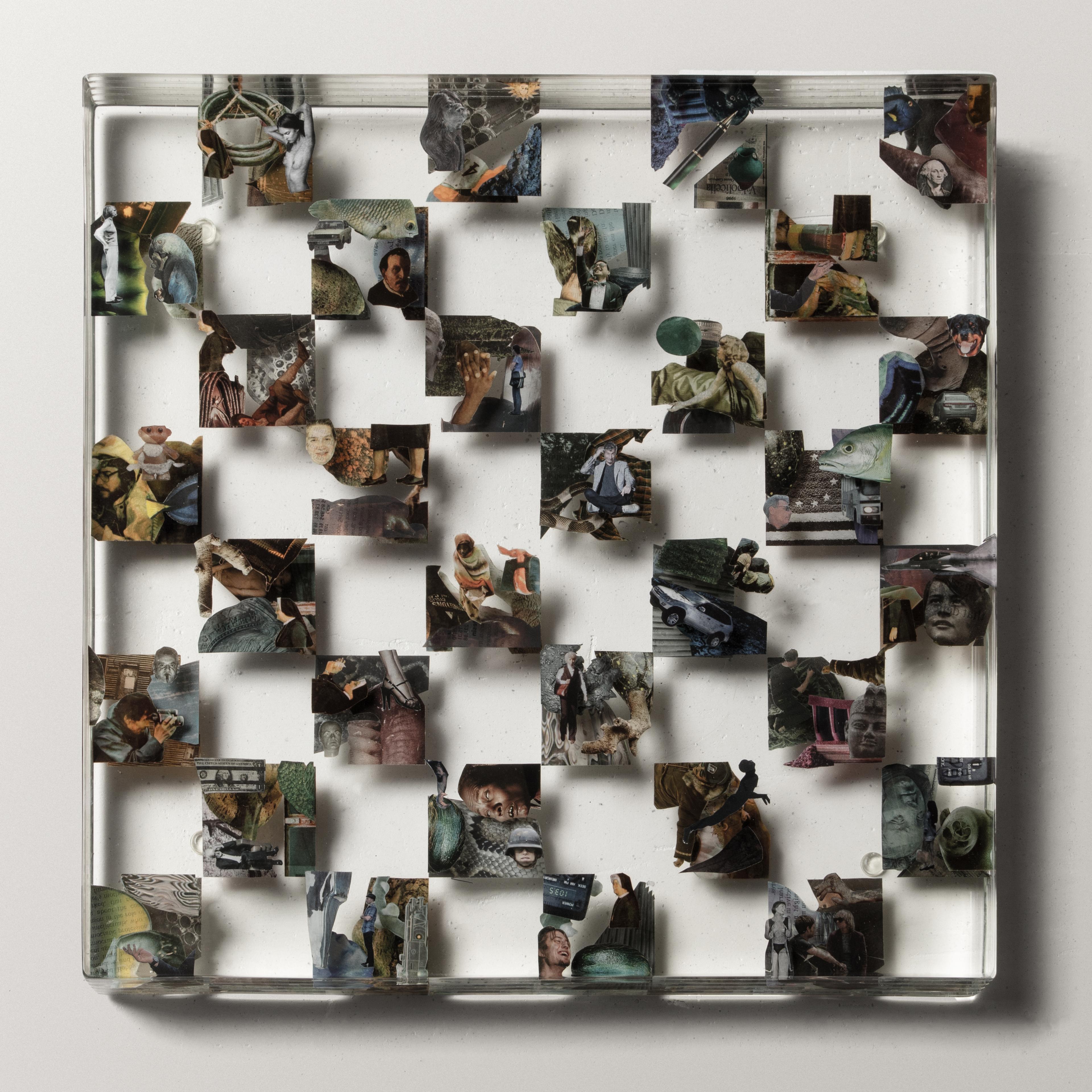 Dustin Yellin (B. 1975, California) is an artist who lives in Brooklyn, New York, and is the founder and director of Pioneer Works, a multidisciplinary cultural center in Red Hook, Brooklyn that builds community through the arts and sciences to create an open and inspired world. In tandem with his institution-building social practice, Yellin’s artwork makes the hidden forces of nature and commerce legible. Drawing on both modernism, and the sacral tradition of _Hinterglas _painting, Yellin primarily works through a unique form of 3-dimensional photomontage, in which paint, and images clipped from various print media are embedded within laminated glass sheets to form grand pictographic allegories, which the artist calls “frozen cinema”.