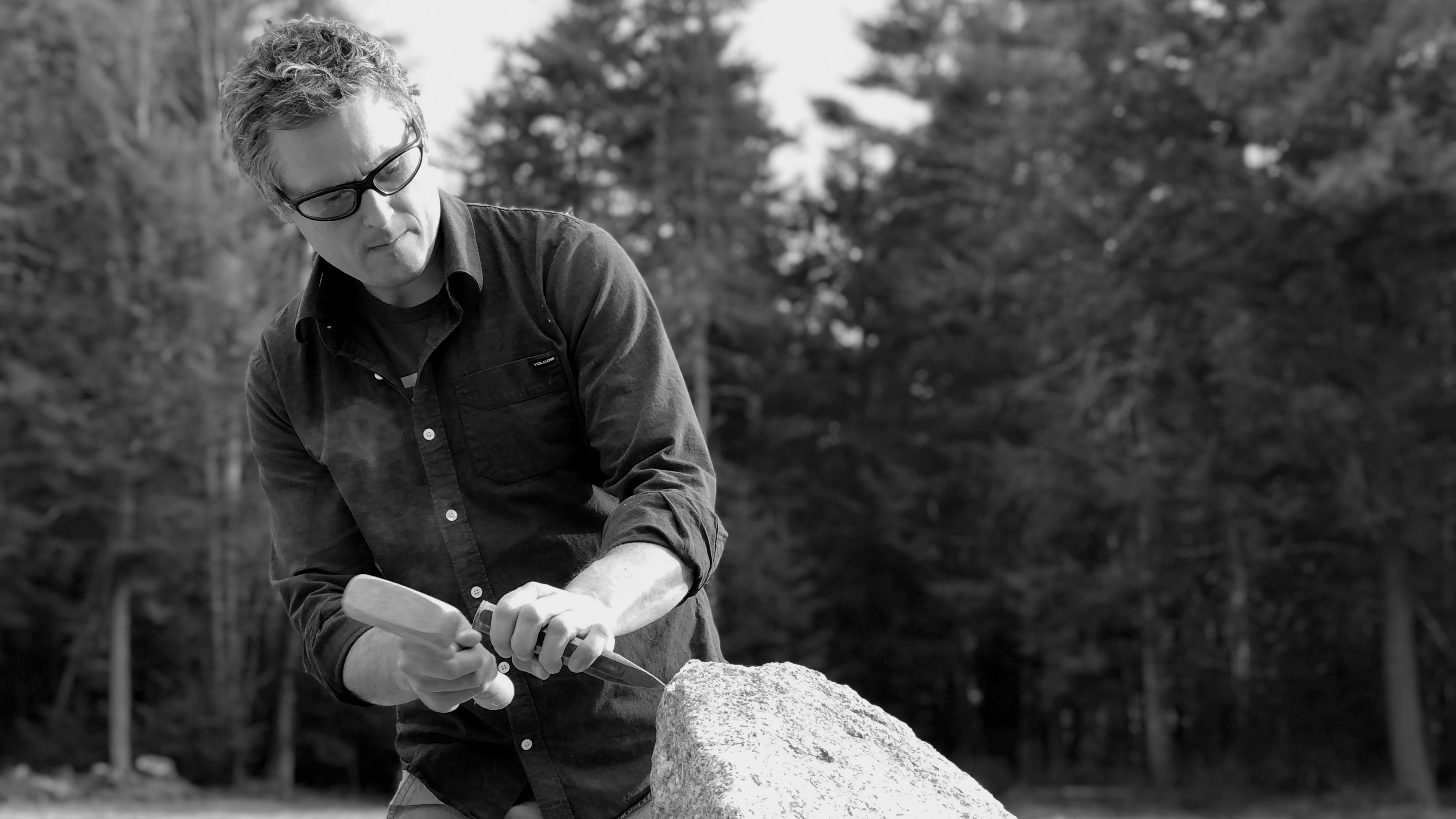 Inspired by the natural landscape and surroundings of his studio in coastal Maine, Stebbins carefully selects tumbled stones from the rocky coast to hand-cut and chisel while emphasizing their natural surfaces. His work draws inspiration from the Japanese culture of appreciation and humility, as well as the Wabi-Sabi philosophy, with instinctual techniques that embrace the natural edge and textures of the material; the simple forms of his designs place the unworked, raw material at the center.