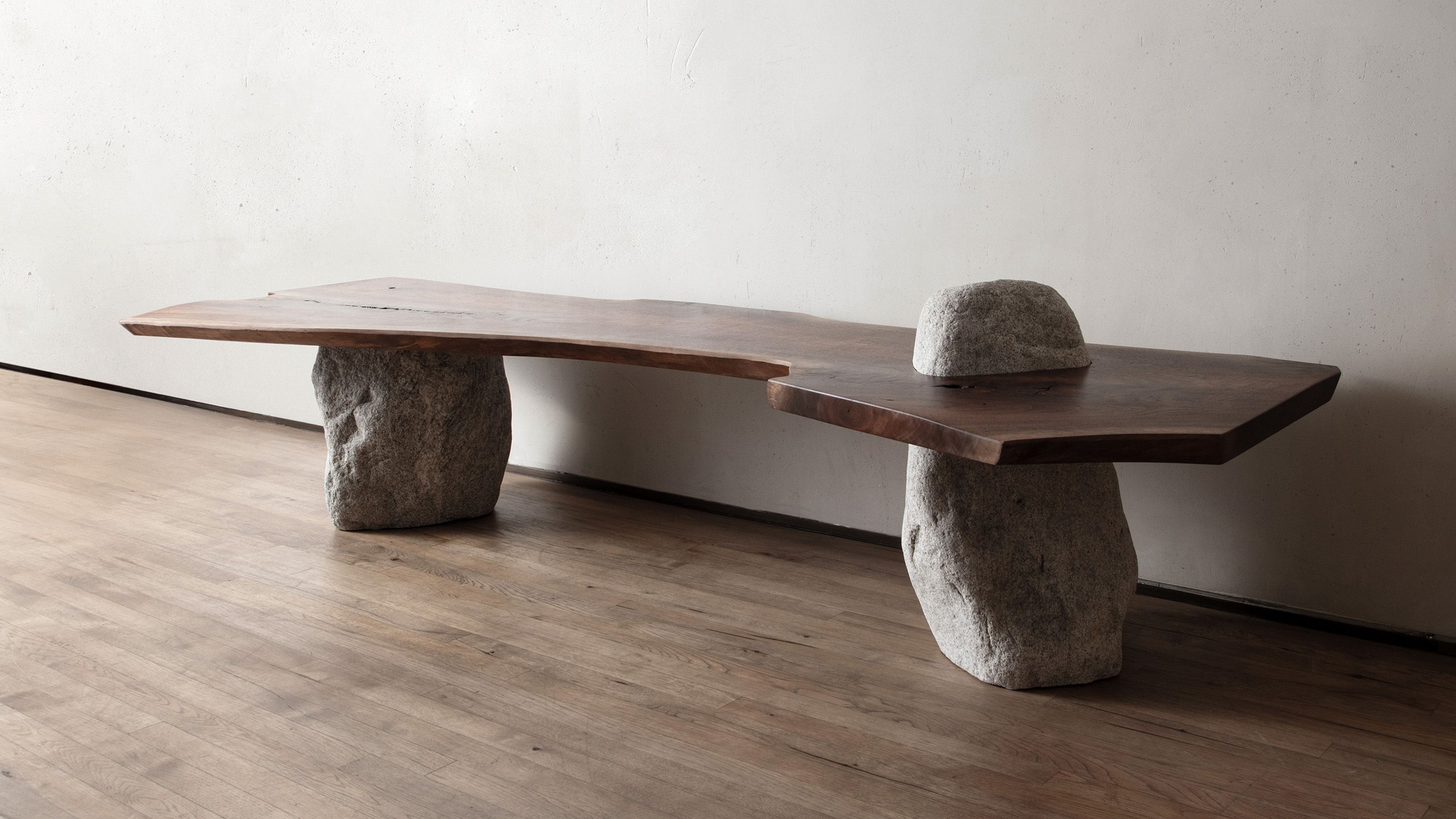 Inspired by the Japanese craftsmanship traditions and ethos, the Wabi-Sabi bench was created and hand-crafted by American stone carver Ethan Stebbins. The Maine-based artisan uses the Japanese time-honored techniques of interlocking joinery with local materials he carefully selects in the natural environments neighboring his studio.