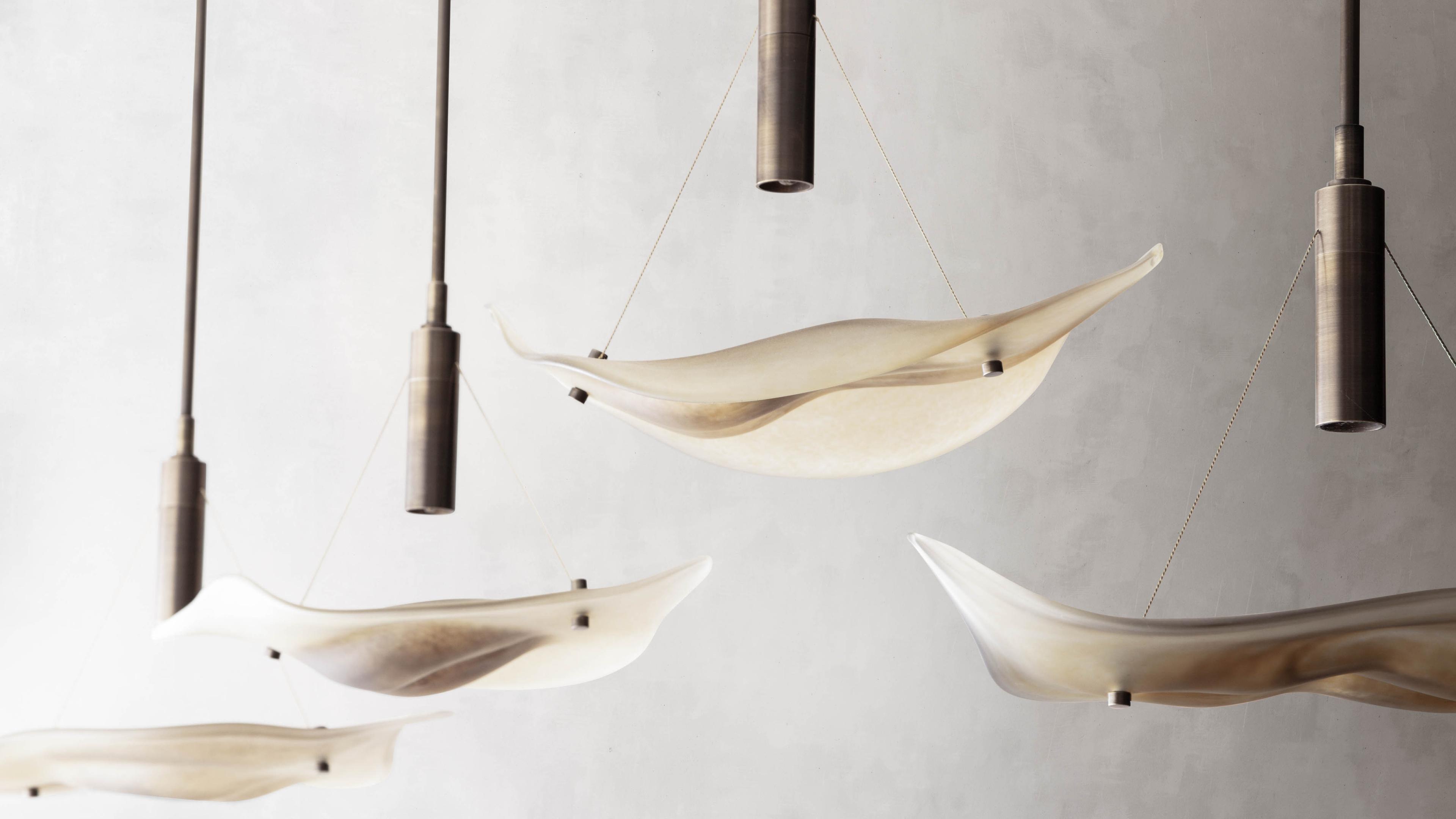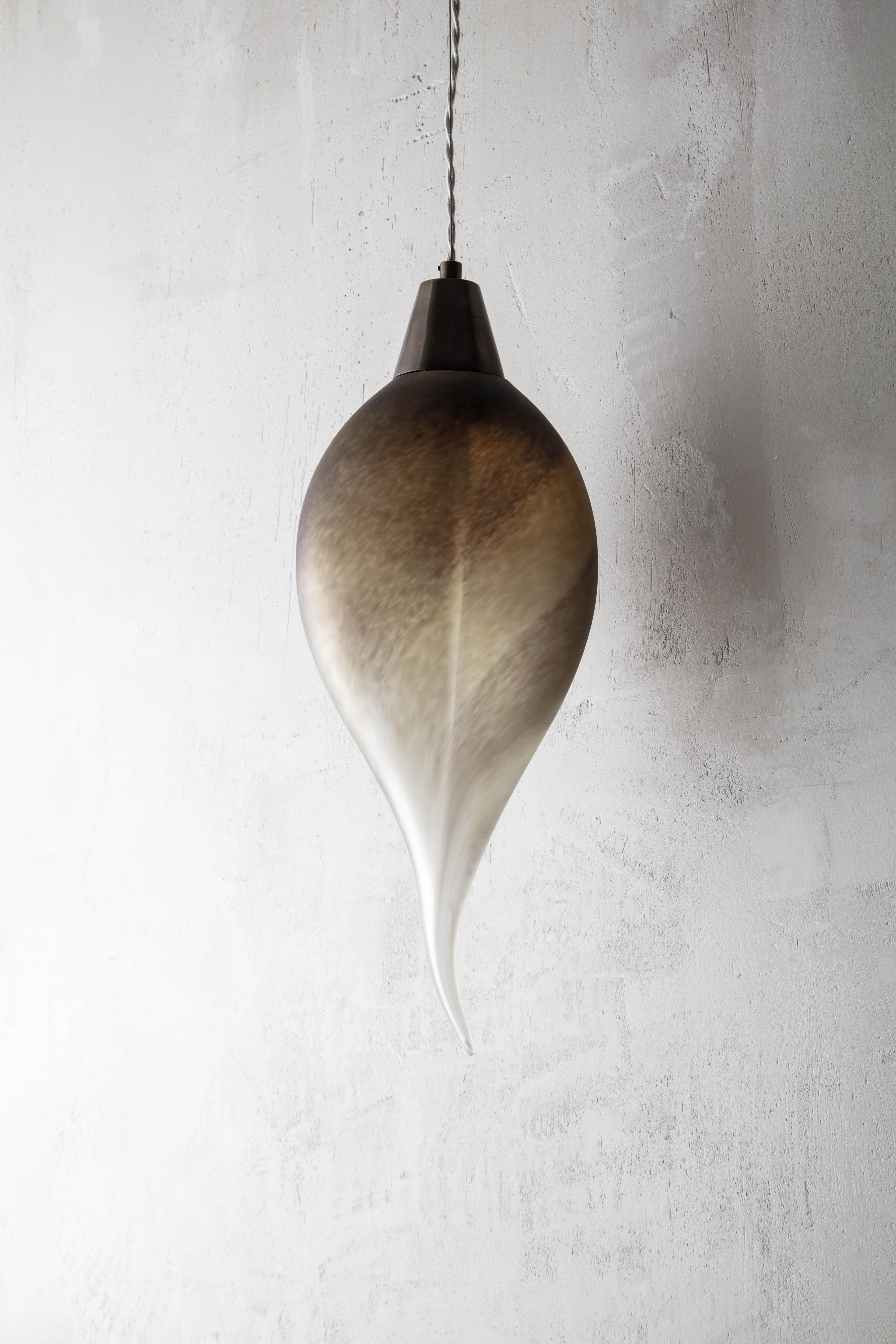 Mouth-blown by the artist in Turkey, the Foresta Drop pendant series are hot-formed sculptures inspired by the drop-shaped Gala leaves
