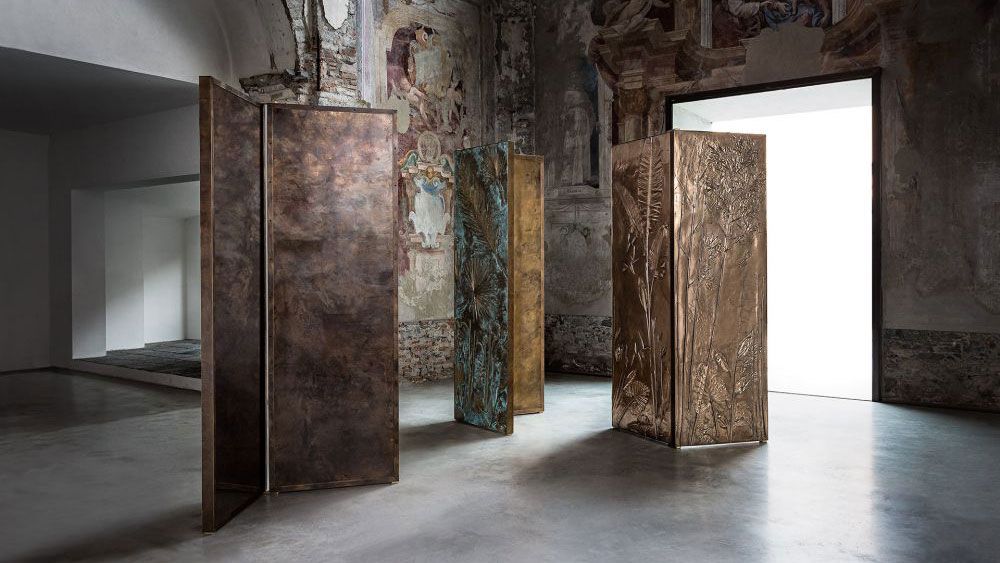 Gianluca Pacchioni, a Milan-based artist, acclaimed for his rigorously sculpted metal objects, began forging metal as a self-taught apprentice in a studio shared with other artists at Quai de la Gare in Paris. After his first exhibition, the Cologni Foundation awarded Pacchioni a Master in Fine Arts & Crafts, an honor that recognizes the most skilled artisans in Italy. Pacchioni’s team fuses his methods with traditional techniques to manipulate metal in new ways. His work has matured into a virtuous fusion of brass, bronze, iron, stones layered with different patinas, and poured liquid metals. These monumental bronze panels are hand-crafted using painstaking techniques that translate the most minute details. A part of the Tropical Fossil series, each panel features unique bas-relief elements formed from leaves and plants grown in the courtyard of Pacchioni's studio. ‘You have the sensation that the plants are floating in a bath of gold mud, while the other side is blank and smooth, focused on the classification of patinas,’ Pacchioni says. ‘There are two souls in every panel.’