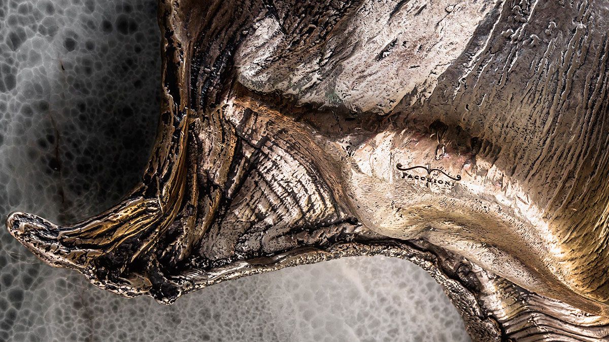 The artist then returned to his native Milan, opening his own studio in an eyedrops factory from the 1930s, working in tandem with Italian master craftsmen with whom he learned and honed his expertise. Pacchioni never ceases to explore new techniques and new materials. Today his work has matured into a virtuous fusion of brass, bronze, iron, stones layered with different patinas, and poured liquid metals.