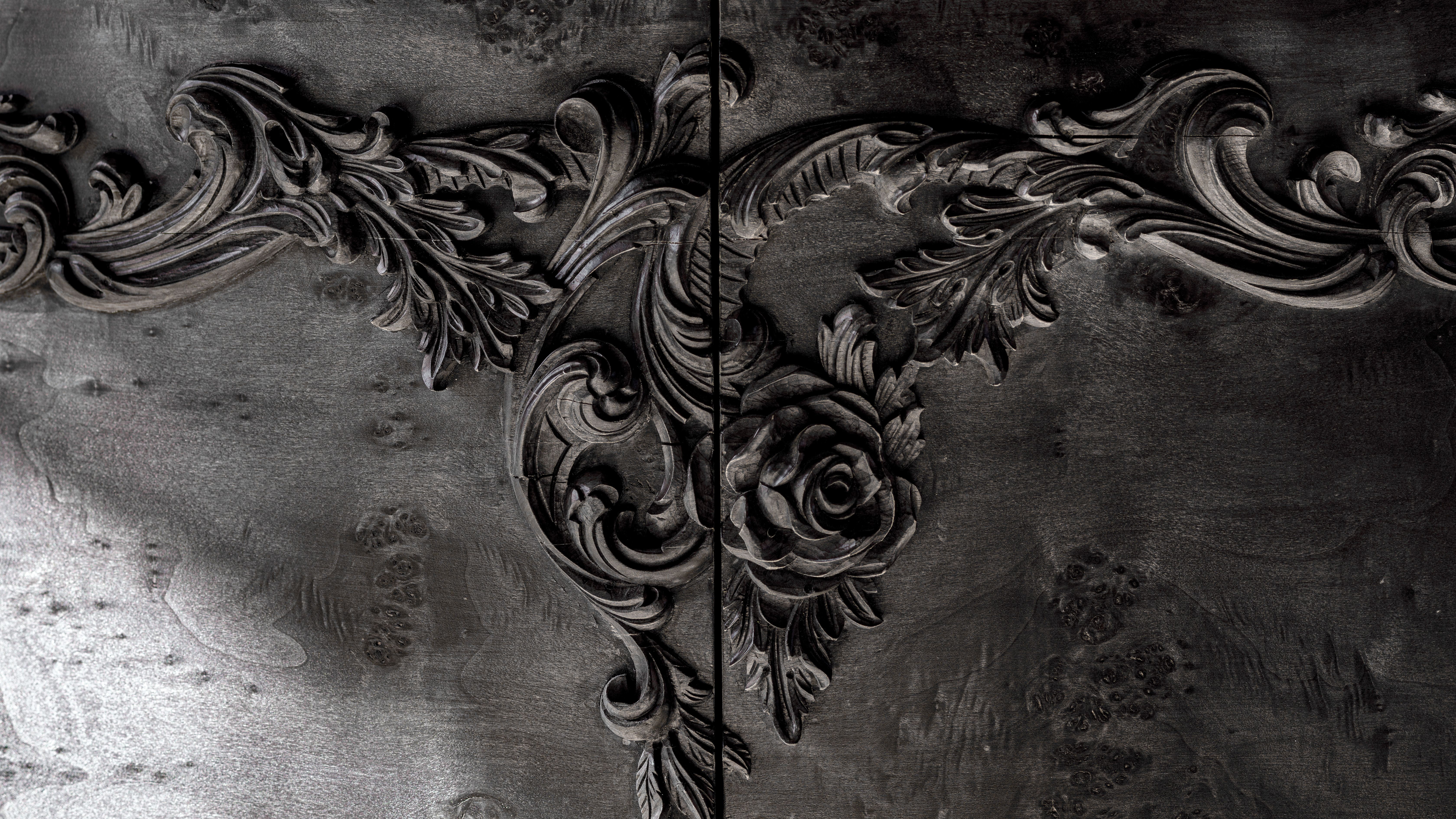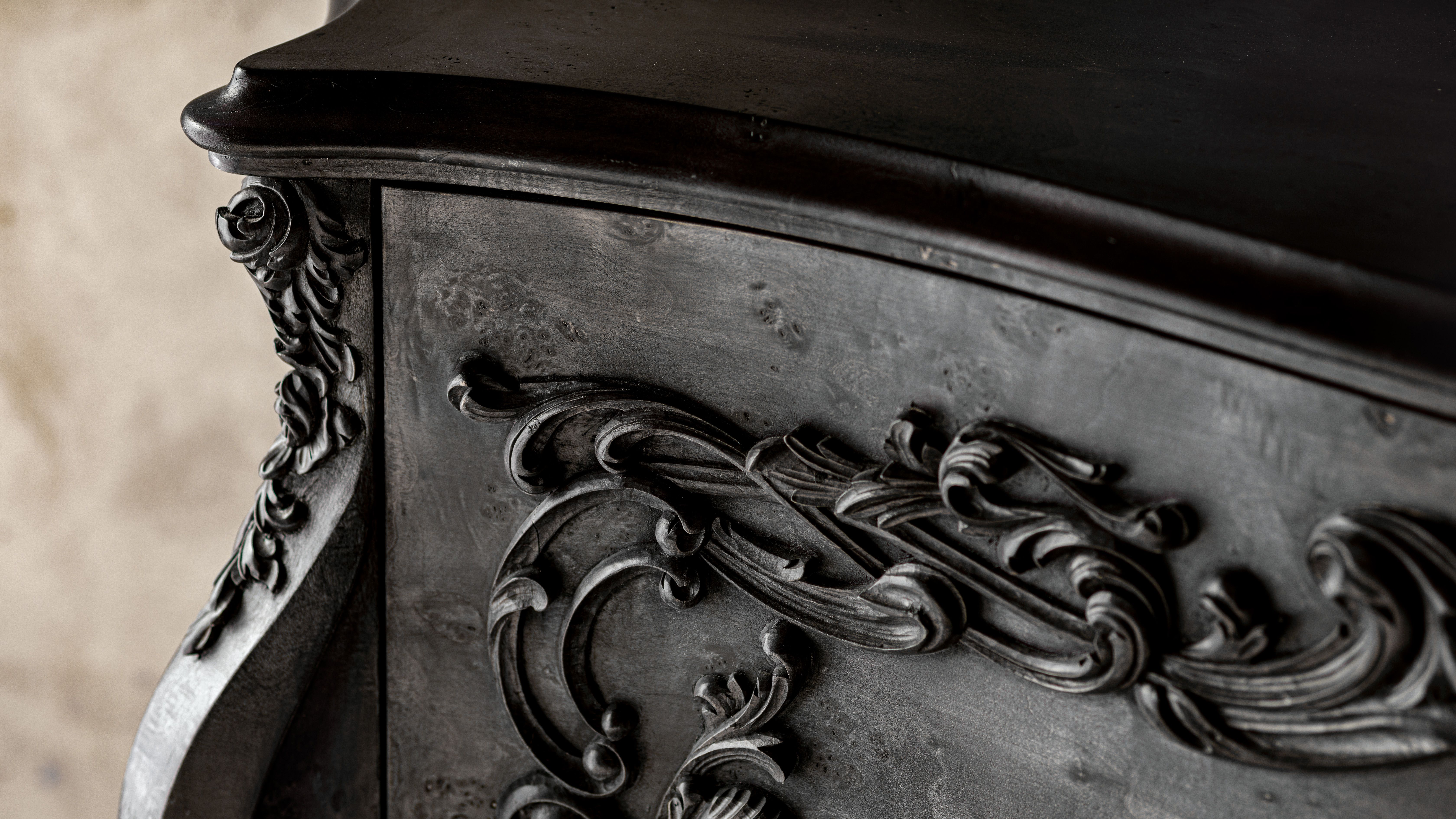 Hand Crafted in blackened Poplar Burl wood, this piece exemplifies Moroccan artist Hamza Kadiri’s mastery of woodcraft. Kadiri’s artistic vocabulary reflects his reverence for the raw material, and is defined by highly textured surfaces and bold forms that emphasize the materiality of the work.