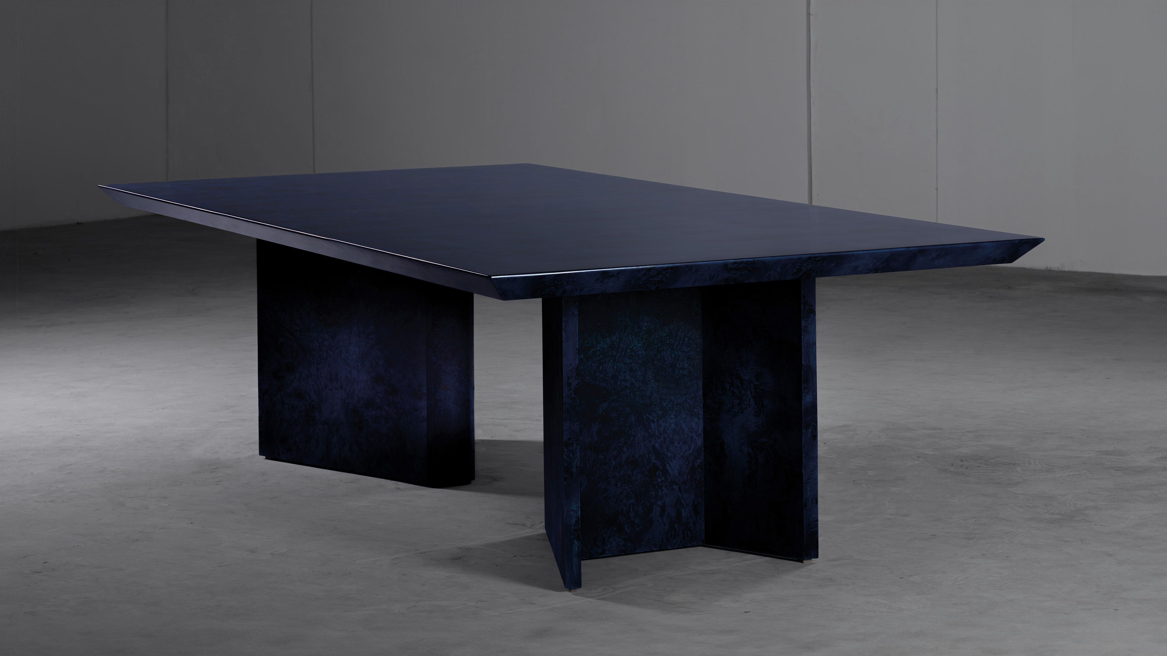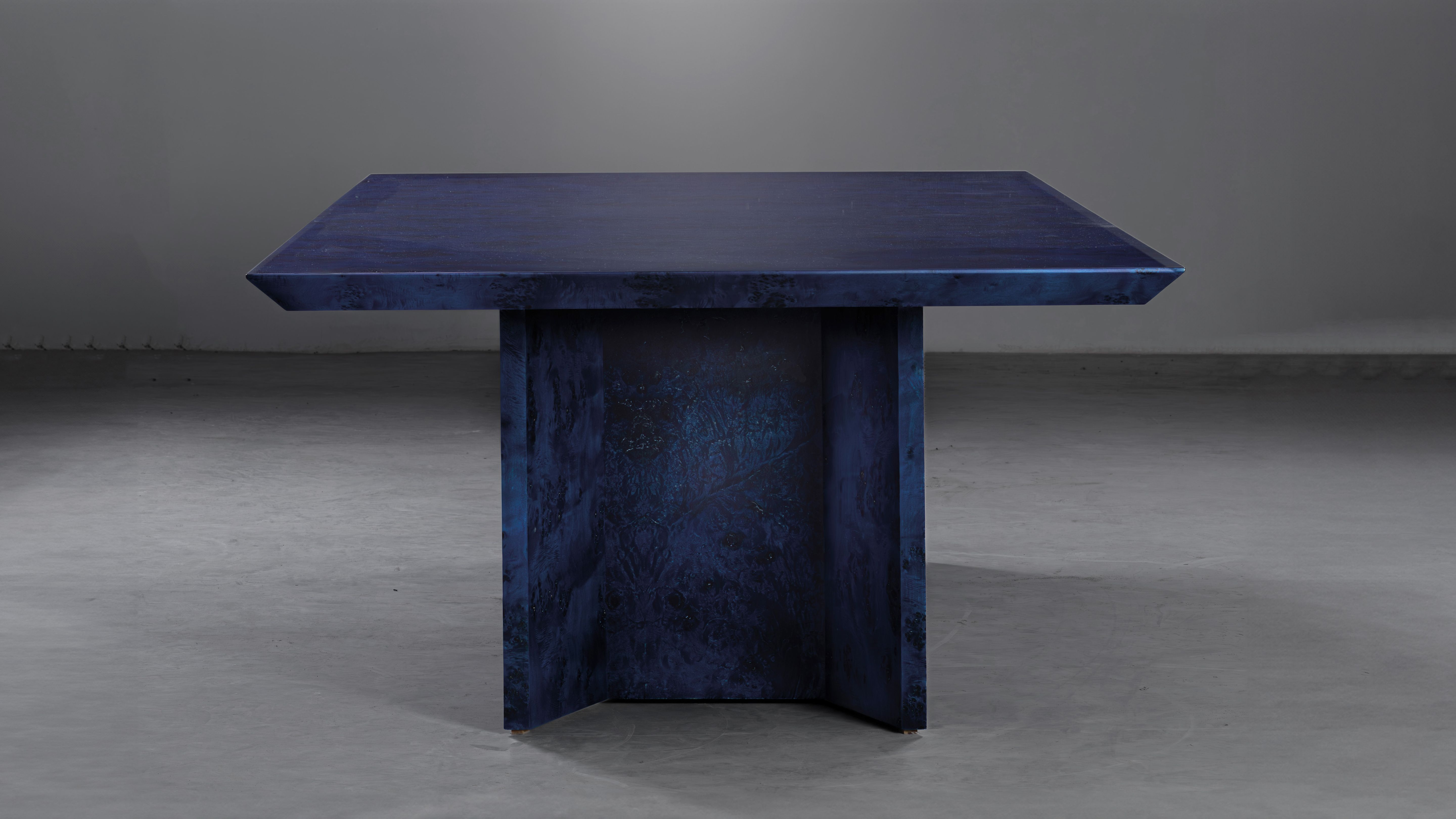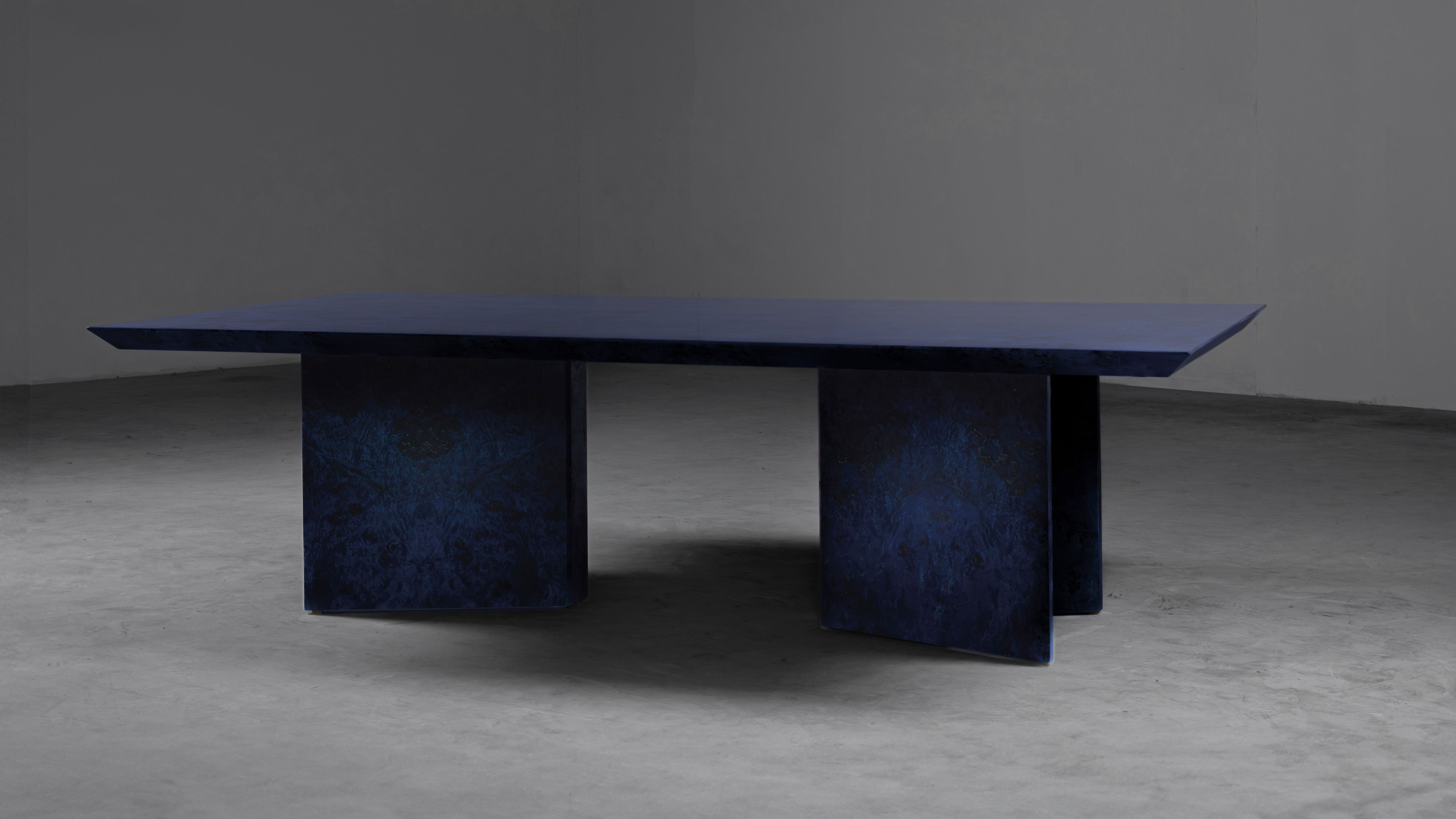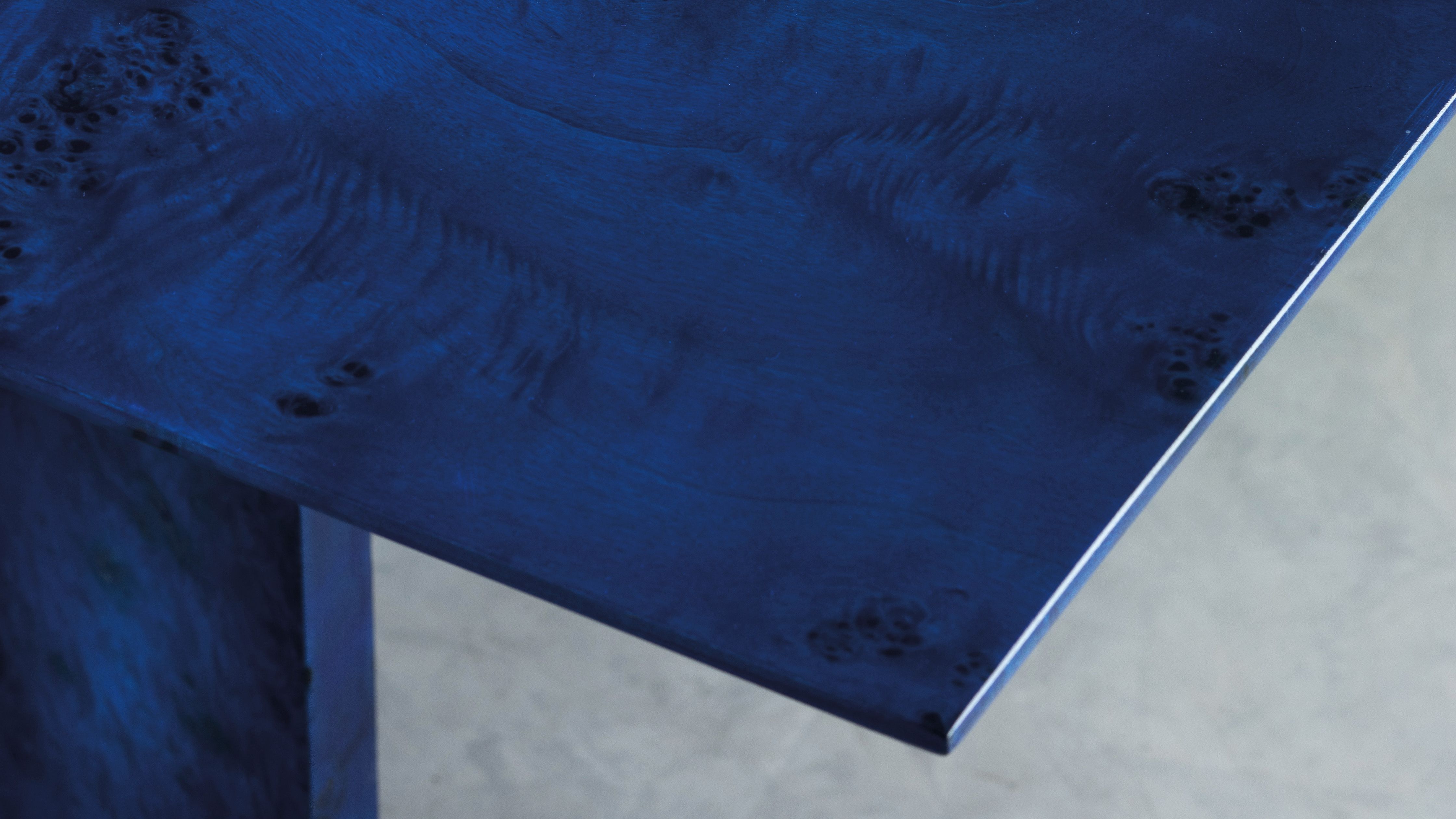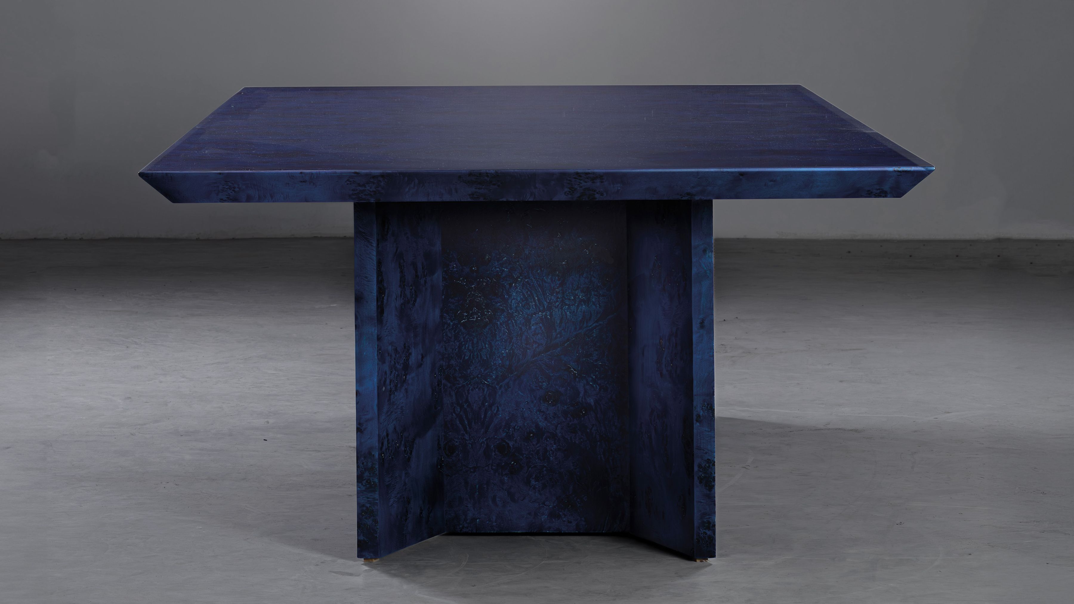 This unique table by Moroccan artist Hamza Kadiri exemplifies the sculptor's dexterity, his unique knowledge and appreciation for the wood material. The seemingly simple silhouette was painstakingly carved in solid poplar burl by the artist. The tabletop was meticulously treated with multiple layers of a highly resistant hybrid coat. Before applying the varnish, Khadiri slightly bevelled the edges. Entirely veneered by hand, the piece subtly reveals the character of the raw material underneath its deep blue lacquer coat.