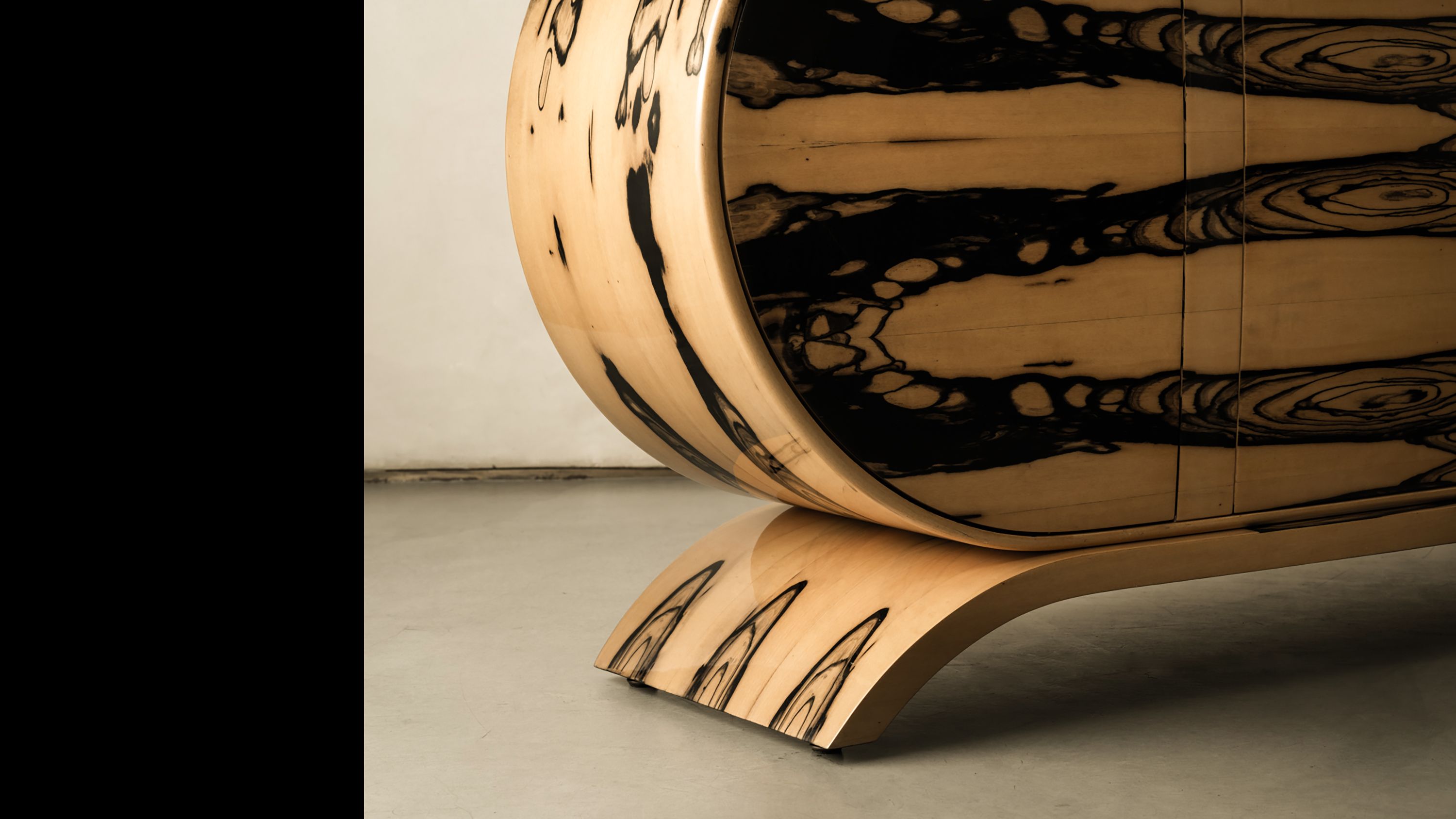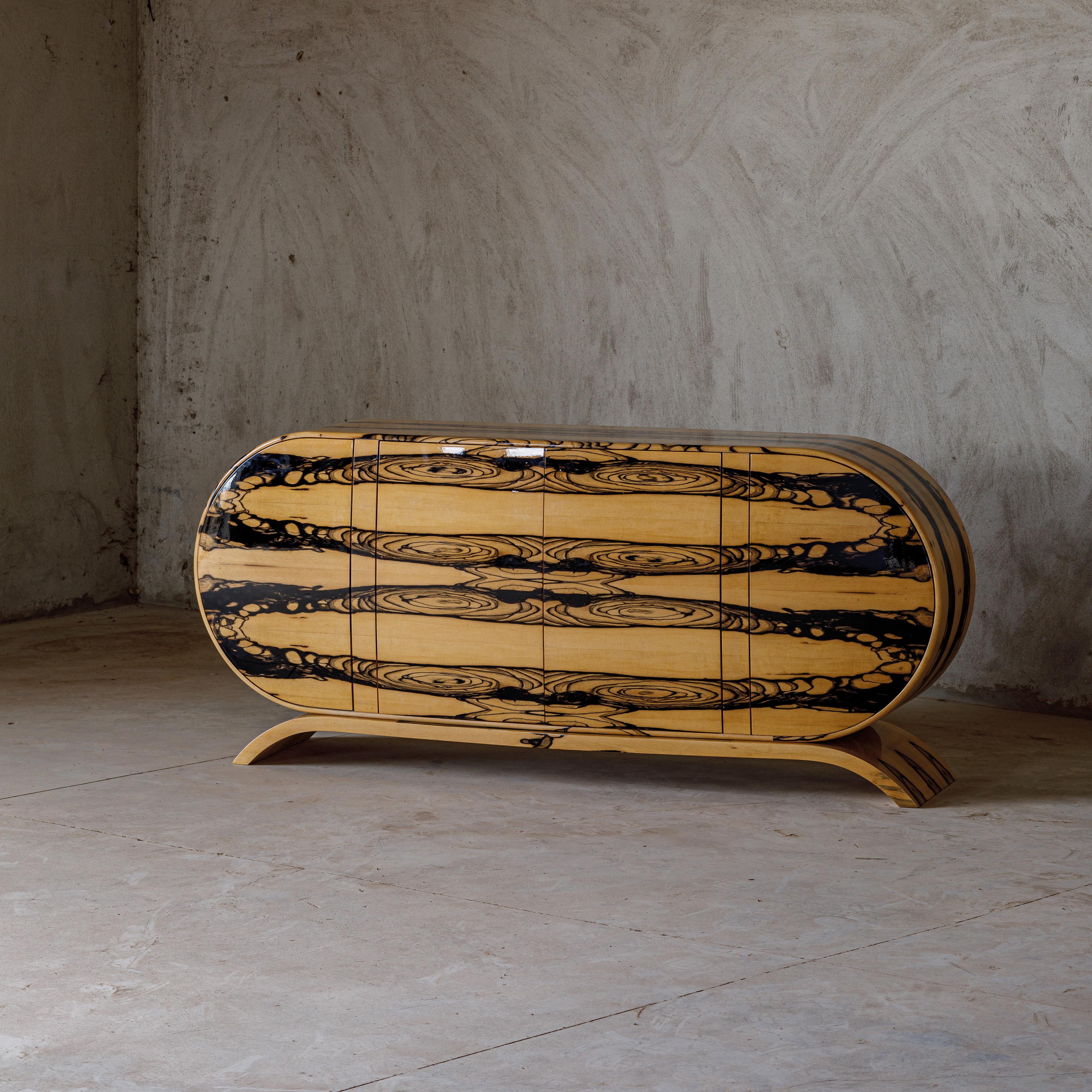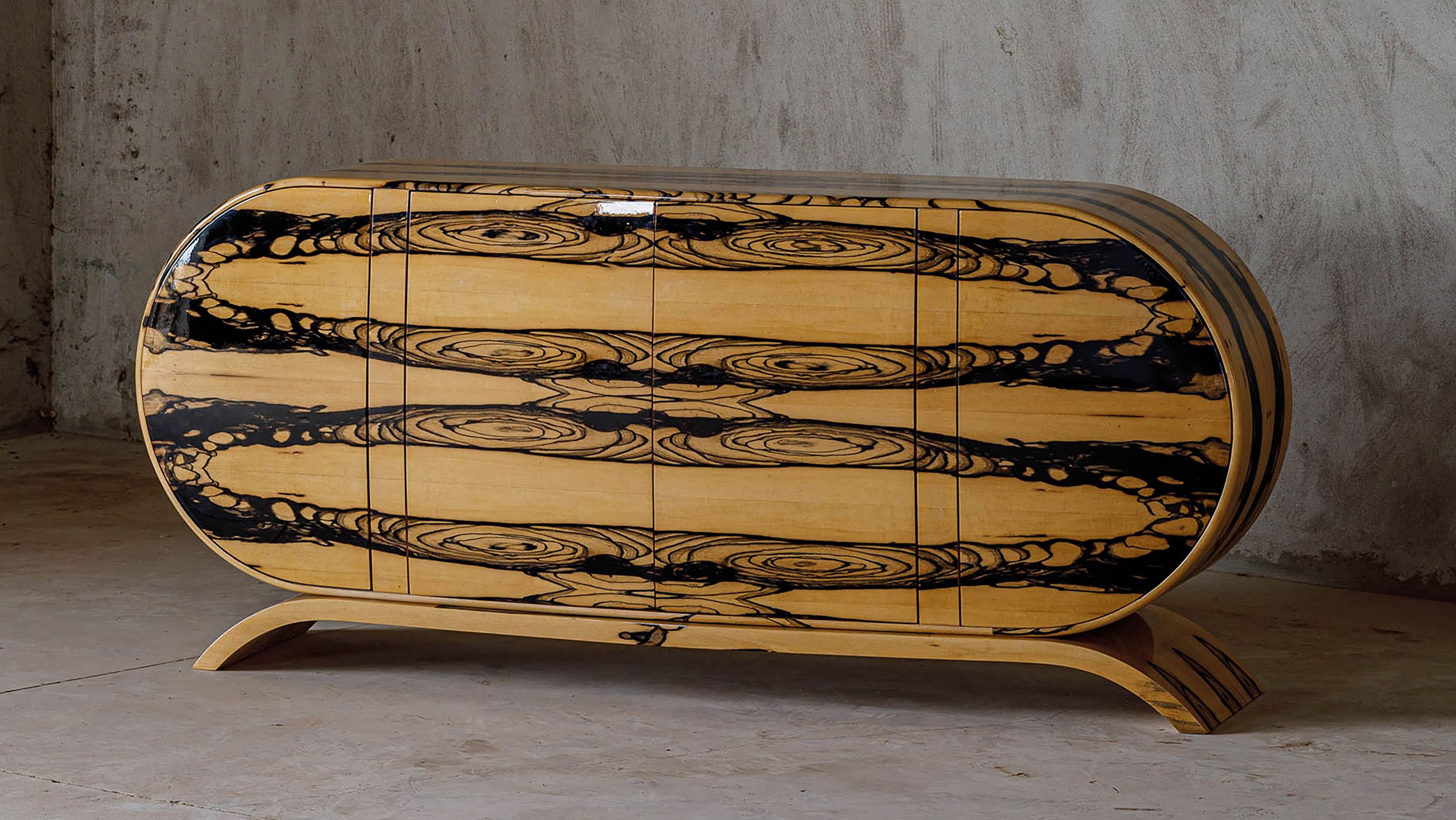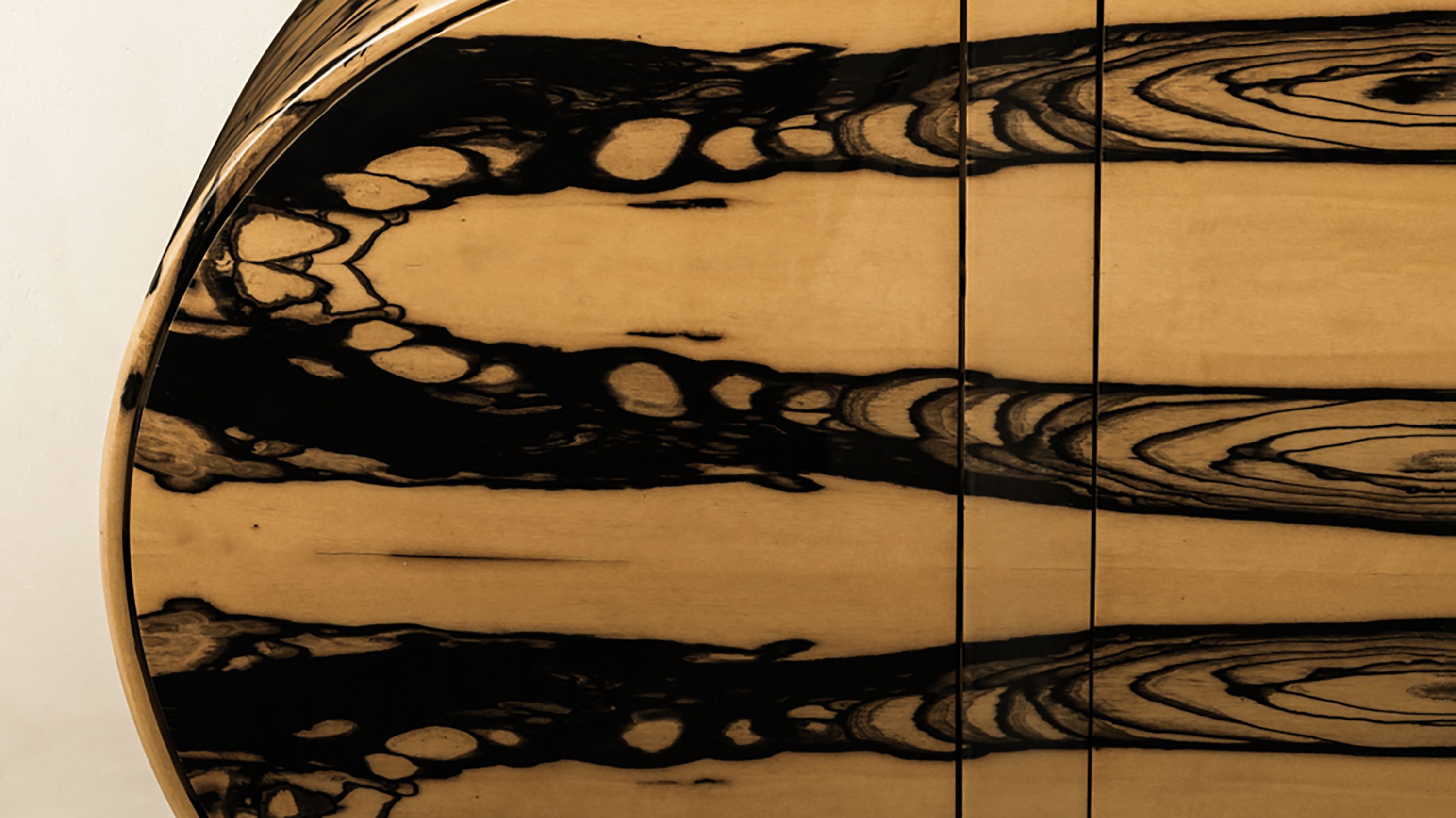 The flawless Royal Laos Ebony veneer following the curves of this oblong credenza, exemplifies Moroccan artist Hamza Kadiri’s mastery of woodcraft. Kadiri’s artistic vocabulary reflects his reverence for the raw material, and is defined by highly textured surfaces and bold forms that emphasize the materiality of the work.
