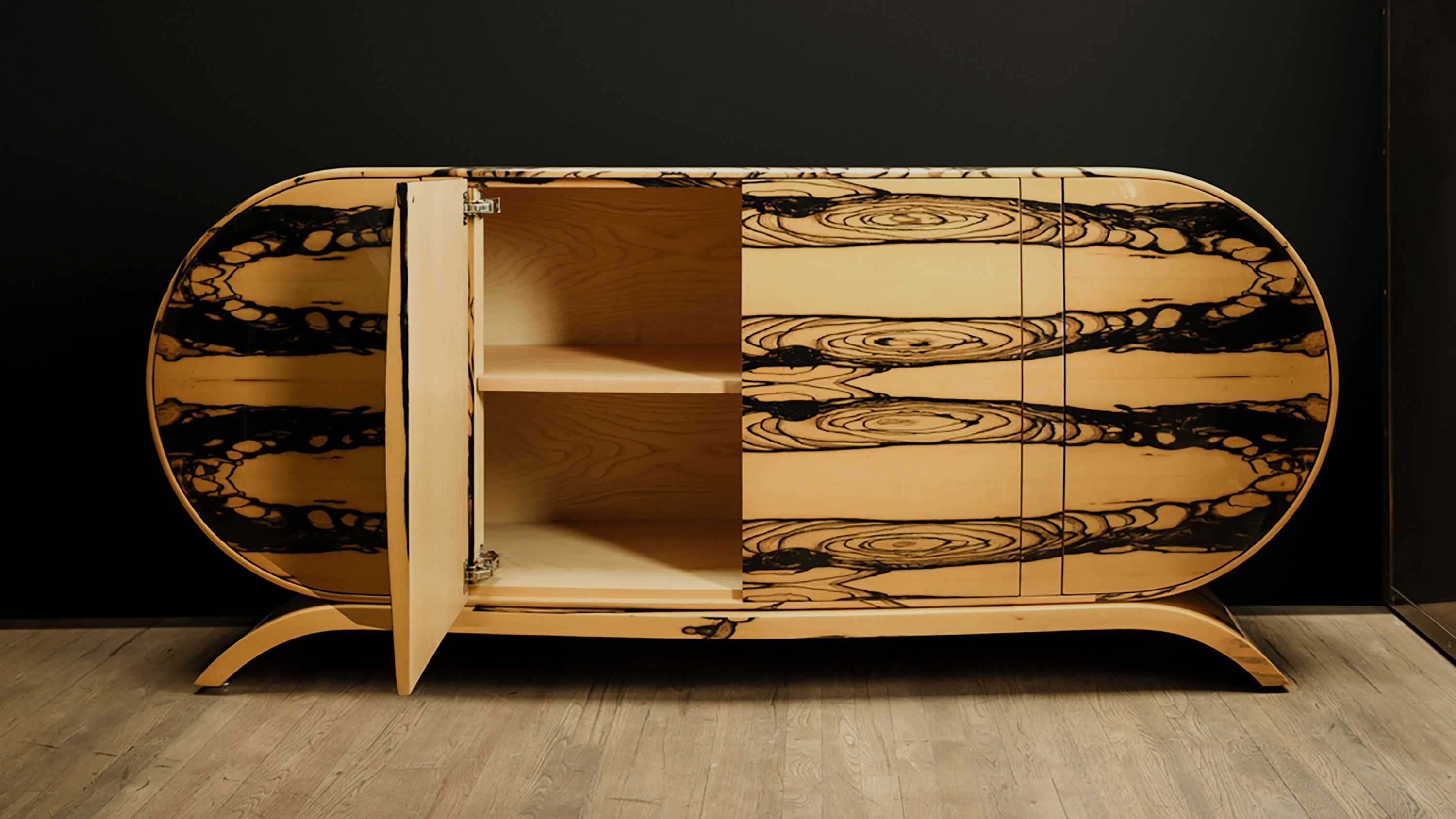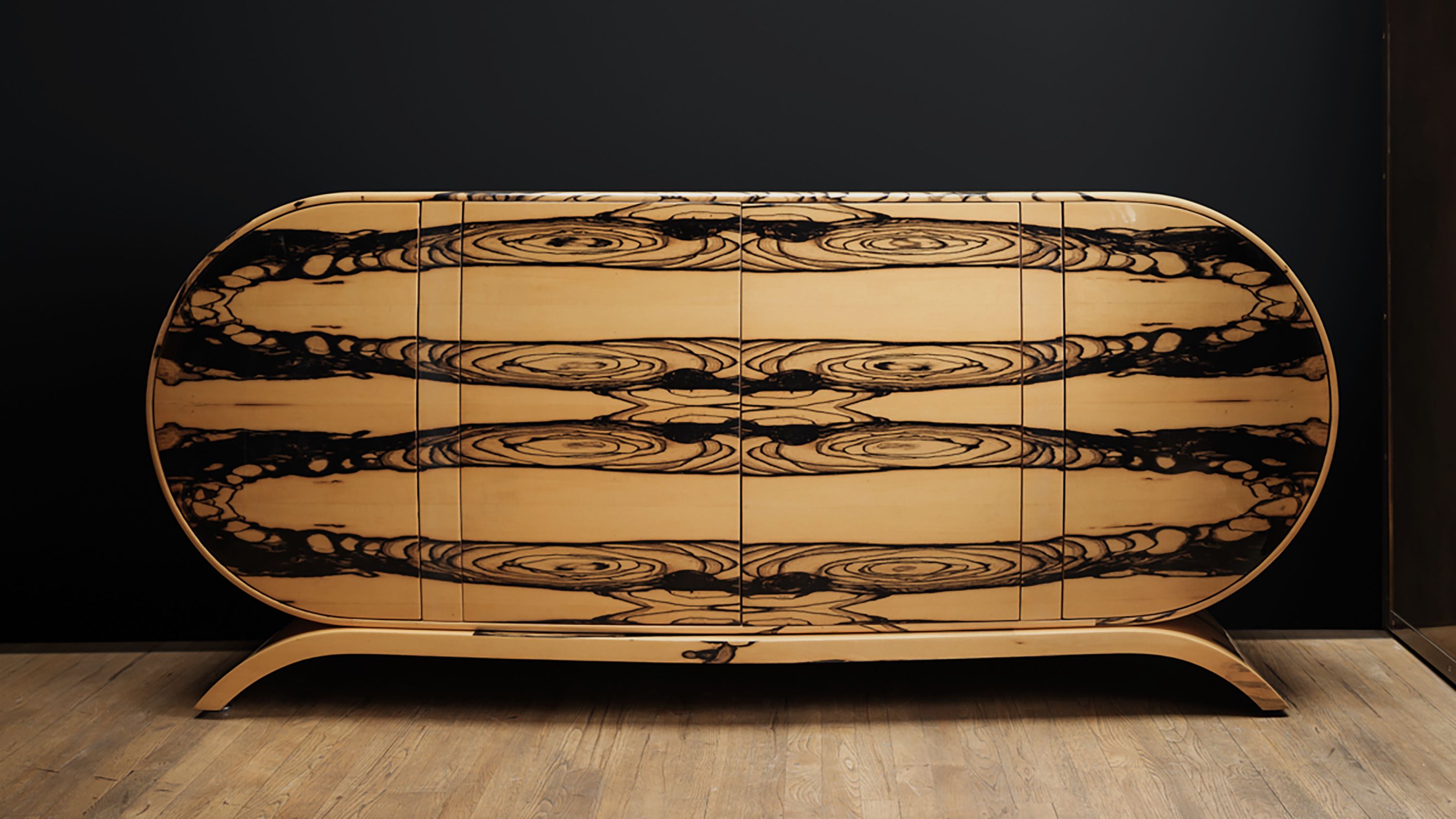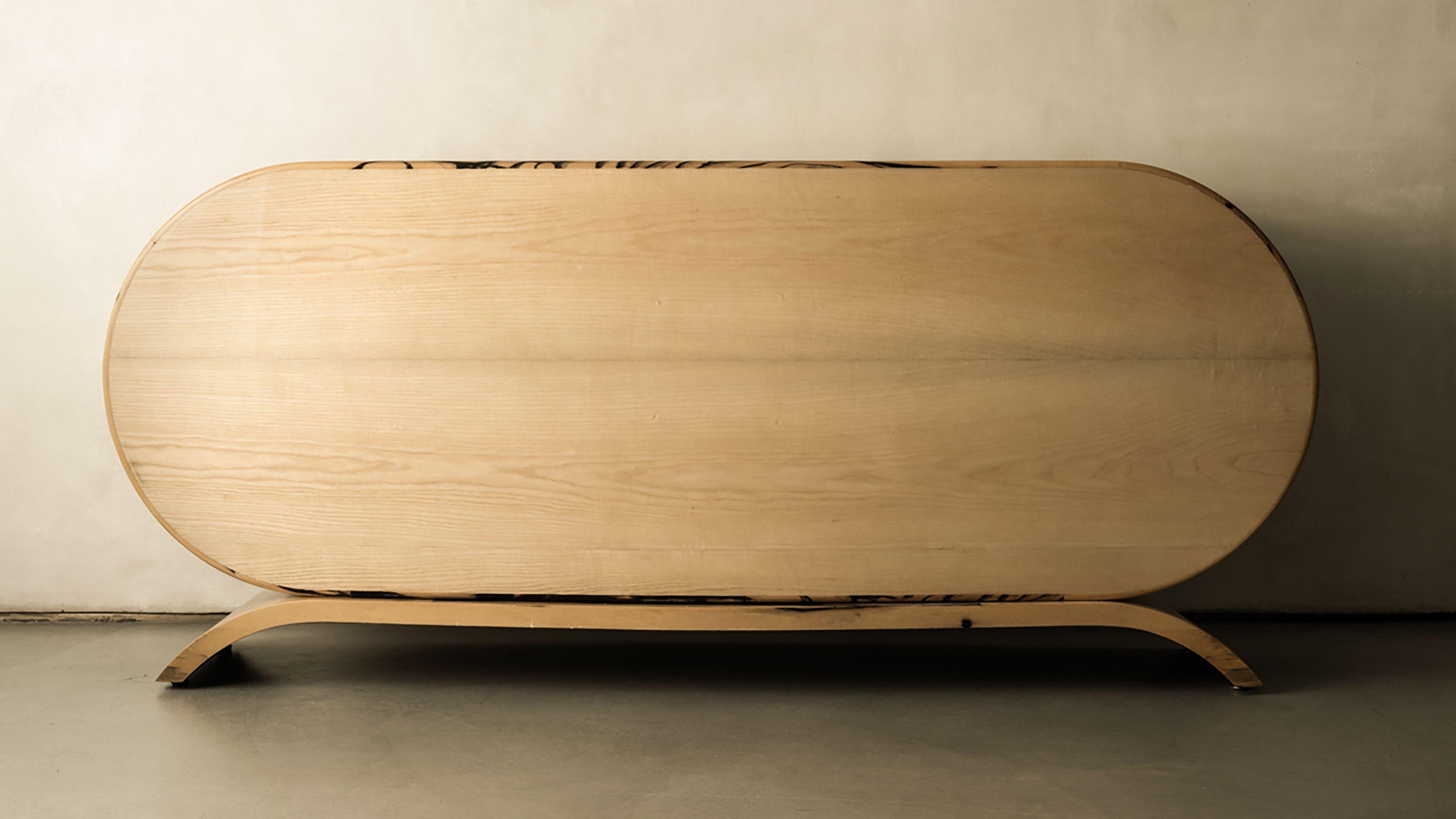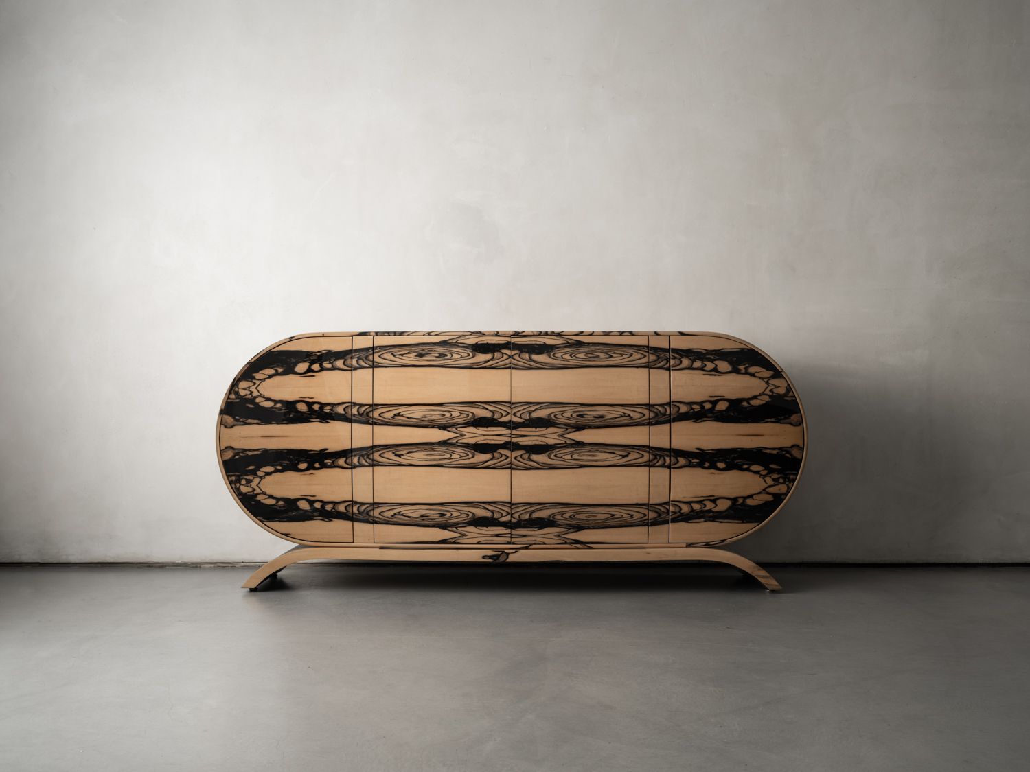 The flawless Royal Laos Ebony veneer following the curves of this oblong credenza, exemplifies Moroccan artist Hamza Kadiri’s mastery of woodcraft. Kadiri’s artistic vocabulary reflects his reverence for the raw material, and is defined by highly textured surfaces and bold forms that emphasize the materiality of the work.
