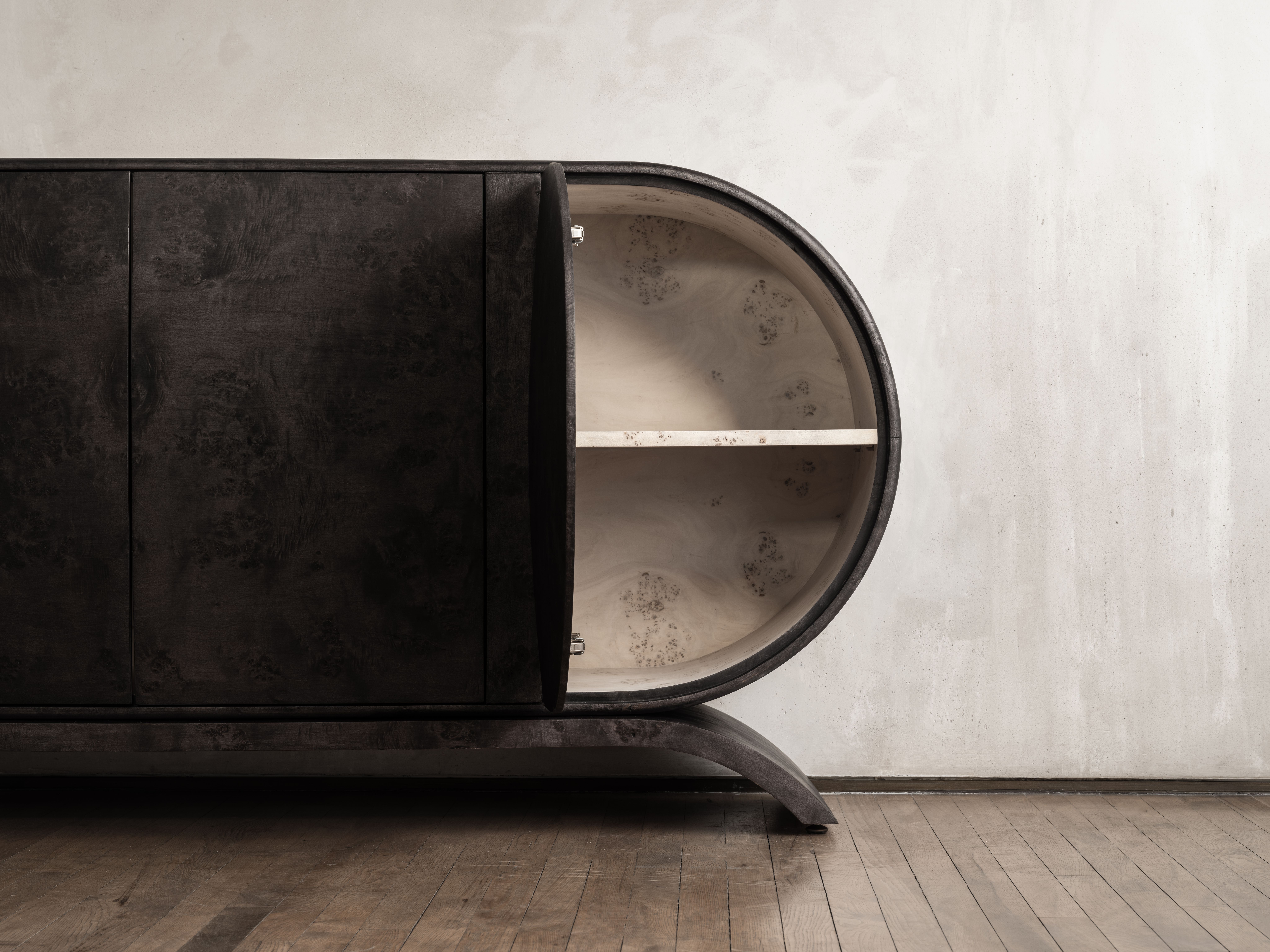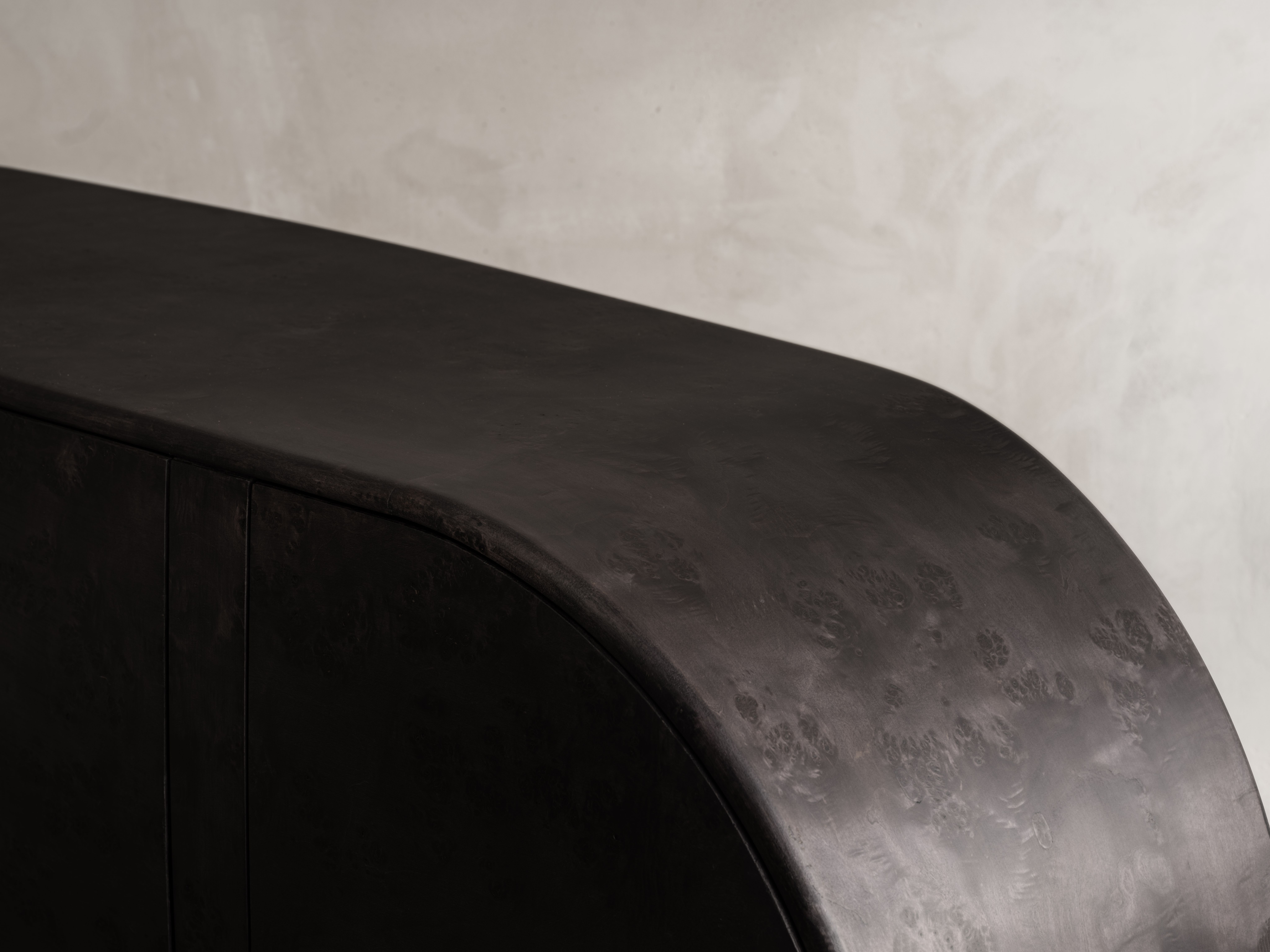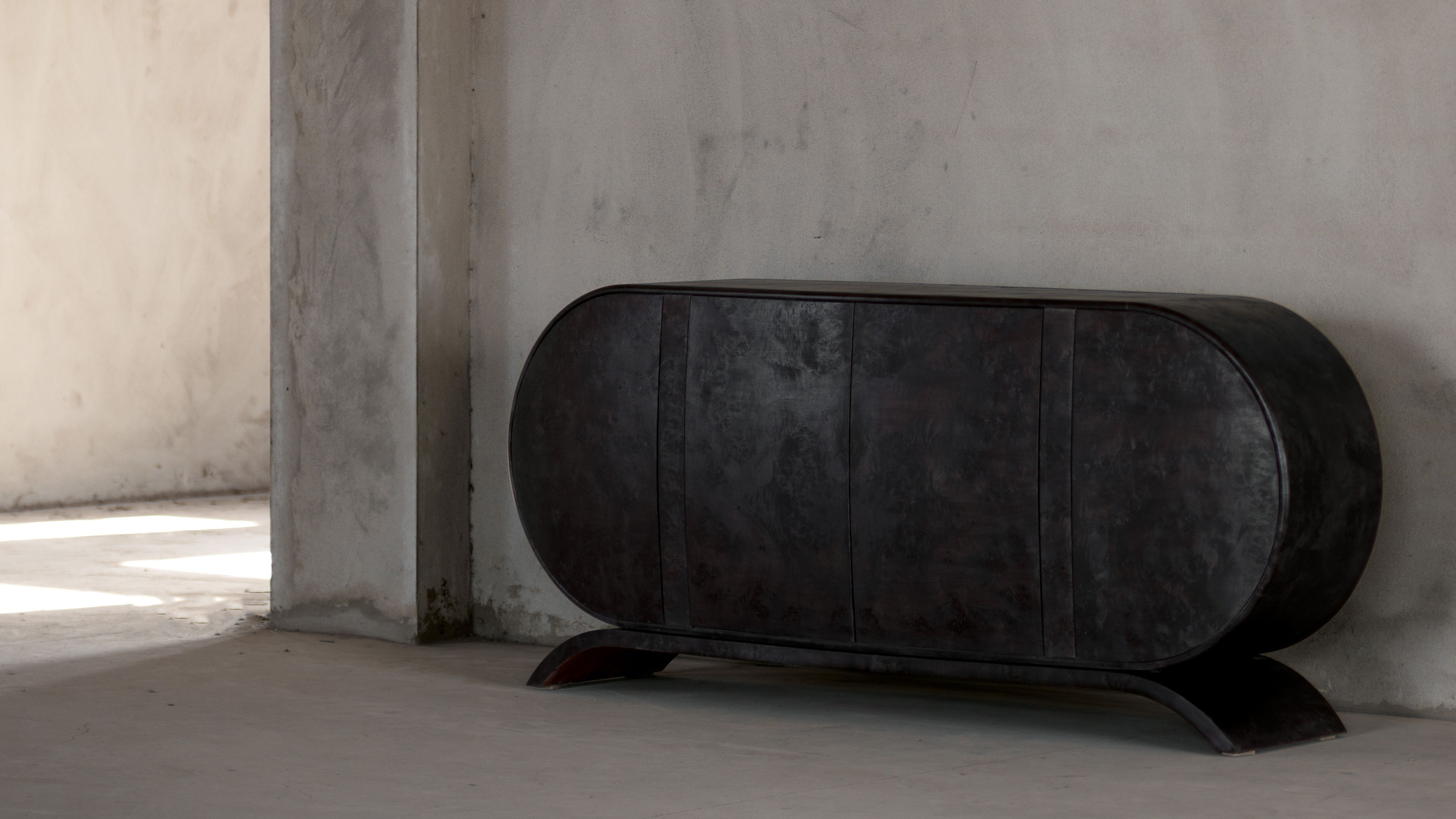 Hand-crafted in blackened Poplar Burl wood, this piece exemplifies Moroccan artist Hamza Kadiri’s mastery of woodcraft. Kadiri’s artistic vocabulary reflects his reverence for the raw material, and is defined by highly textured surfaces and bold forms that emphasize the materiality of the work.