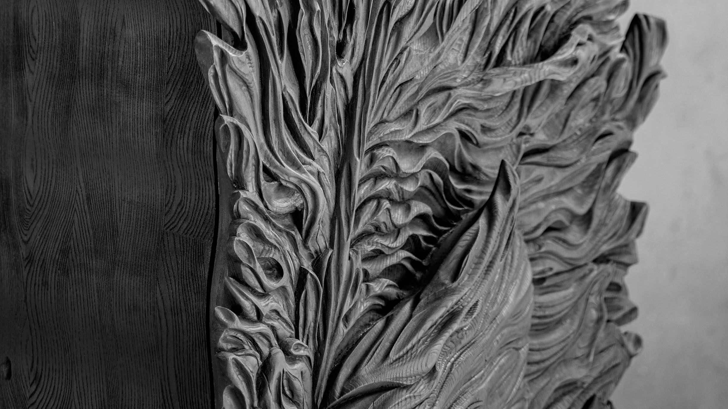 Kadiri’s artistic vocabulary — defined by highly textured surfaces and bold forms that emphasize the materiality of the work — reflects his reverence for the raw material. Kadiri describes his creative process as fundamentally rooted in the material itself. He carefully selects each piece of wood for its singularity, its essence, and its inherent beauty. Each work begins with an intimate dialogue with the wood — an attentive study of its lines, density, and textures. The wood’s personality guides both the form and the ultimate artistic expression.