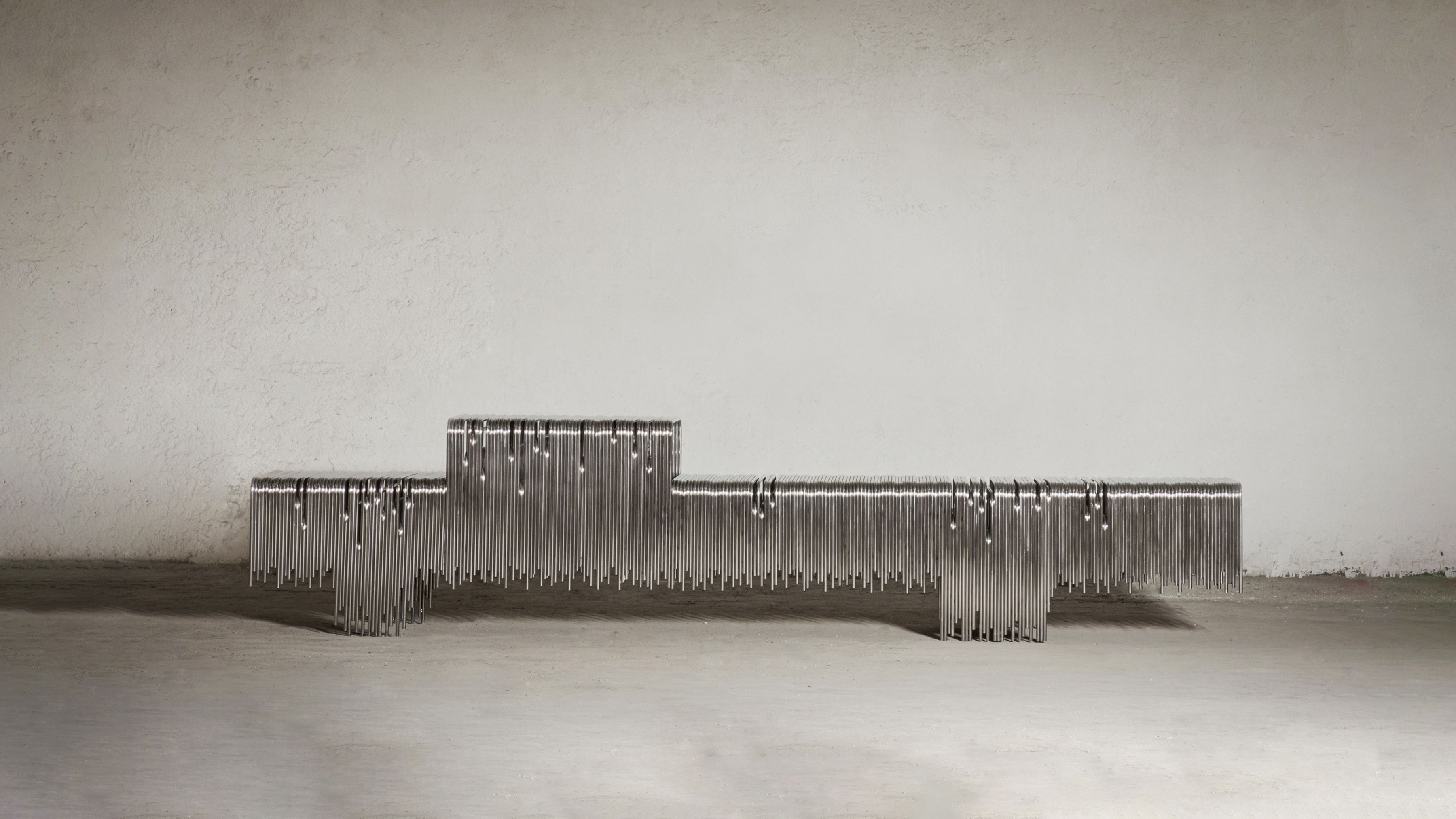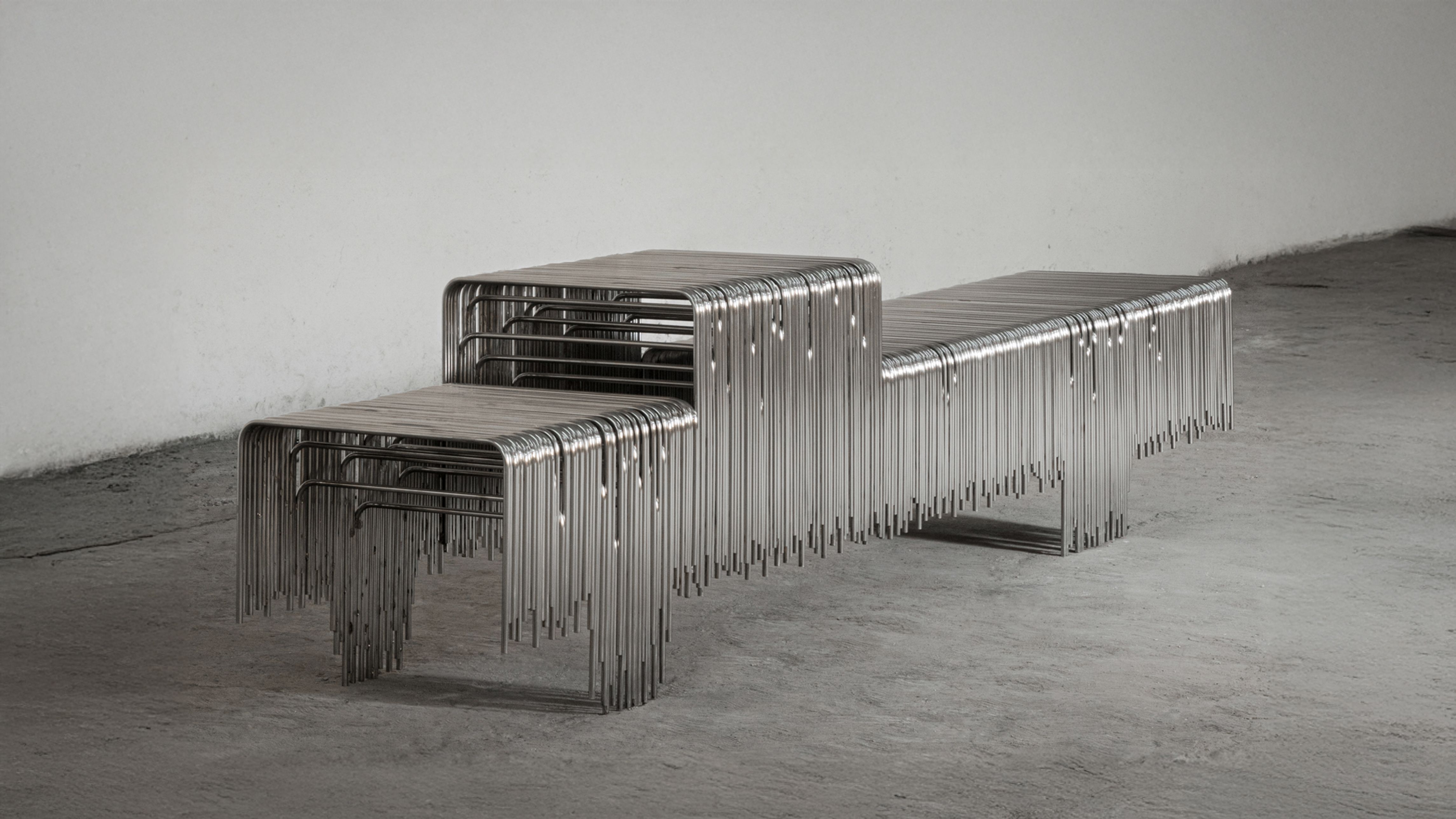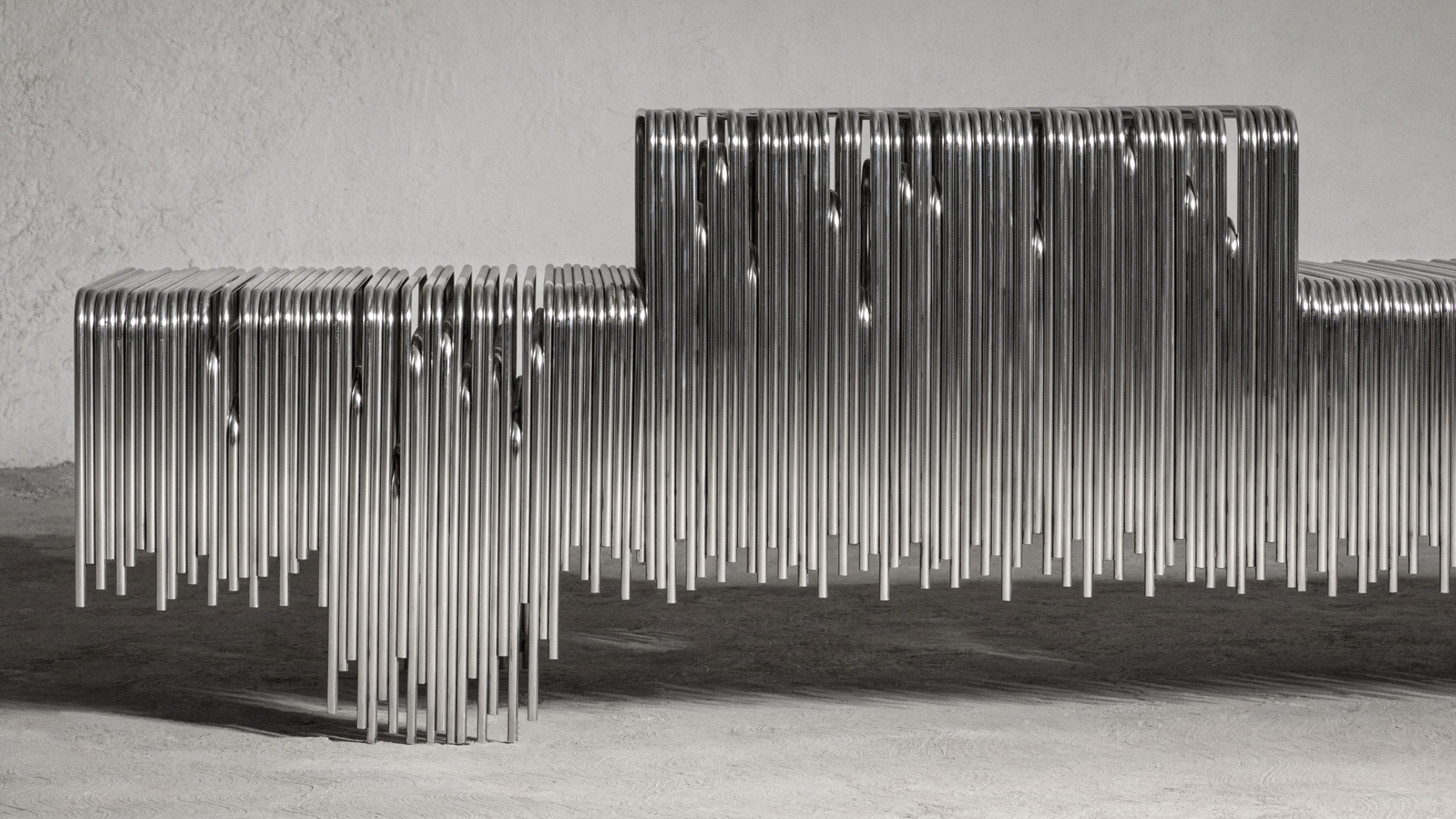 Rooted in the foundational principle of repetition, the Frecuencia series uses bent steel bars—layered with subtle depth and offset—to shape negative space.