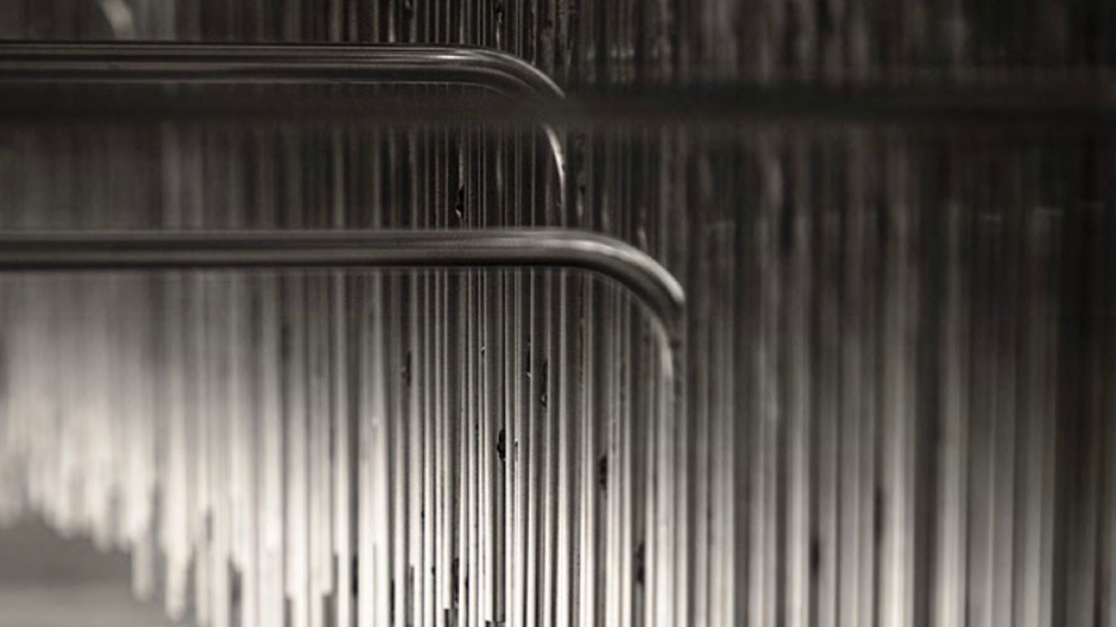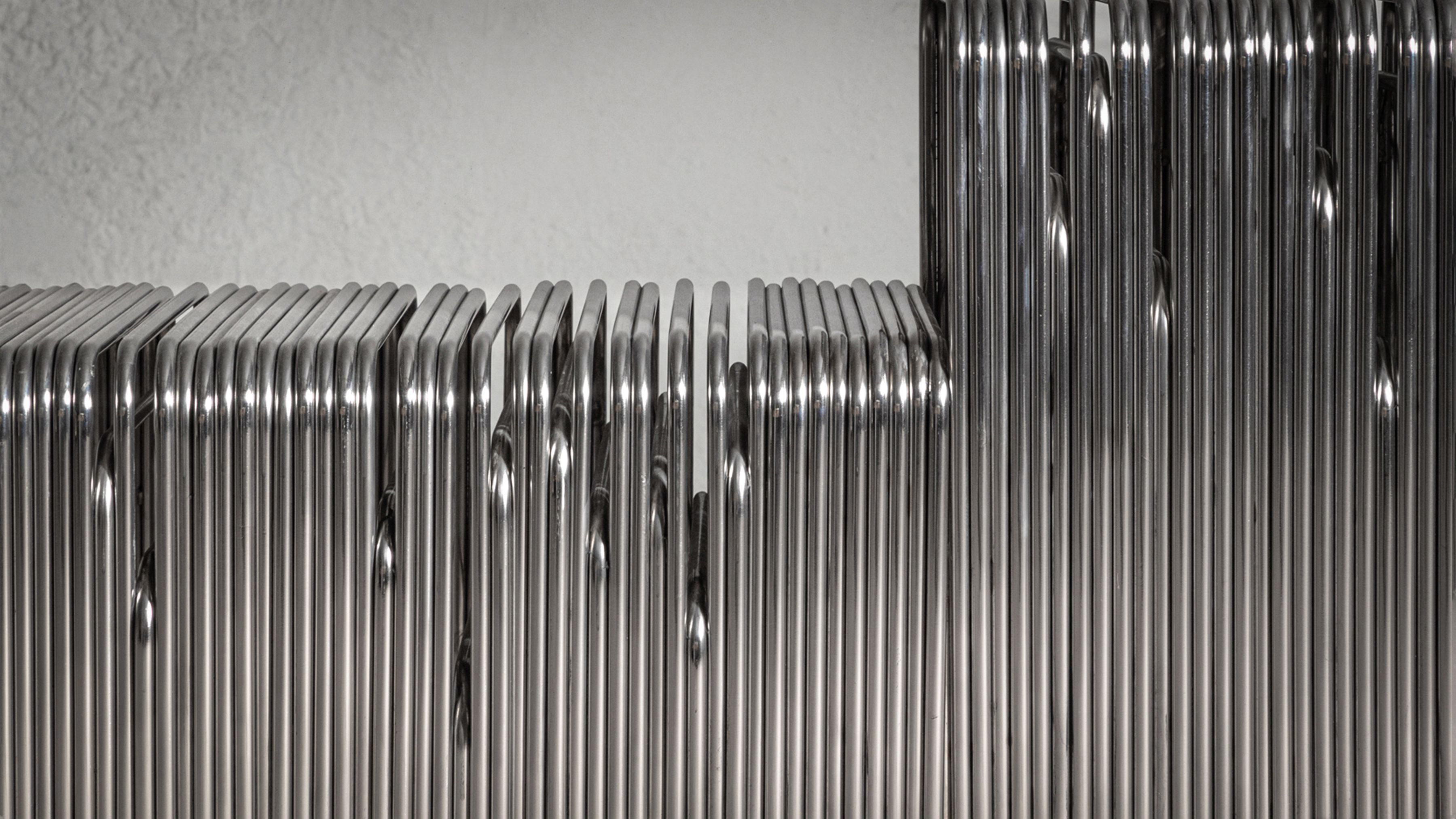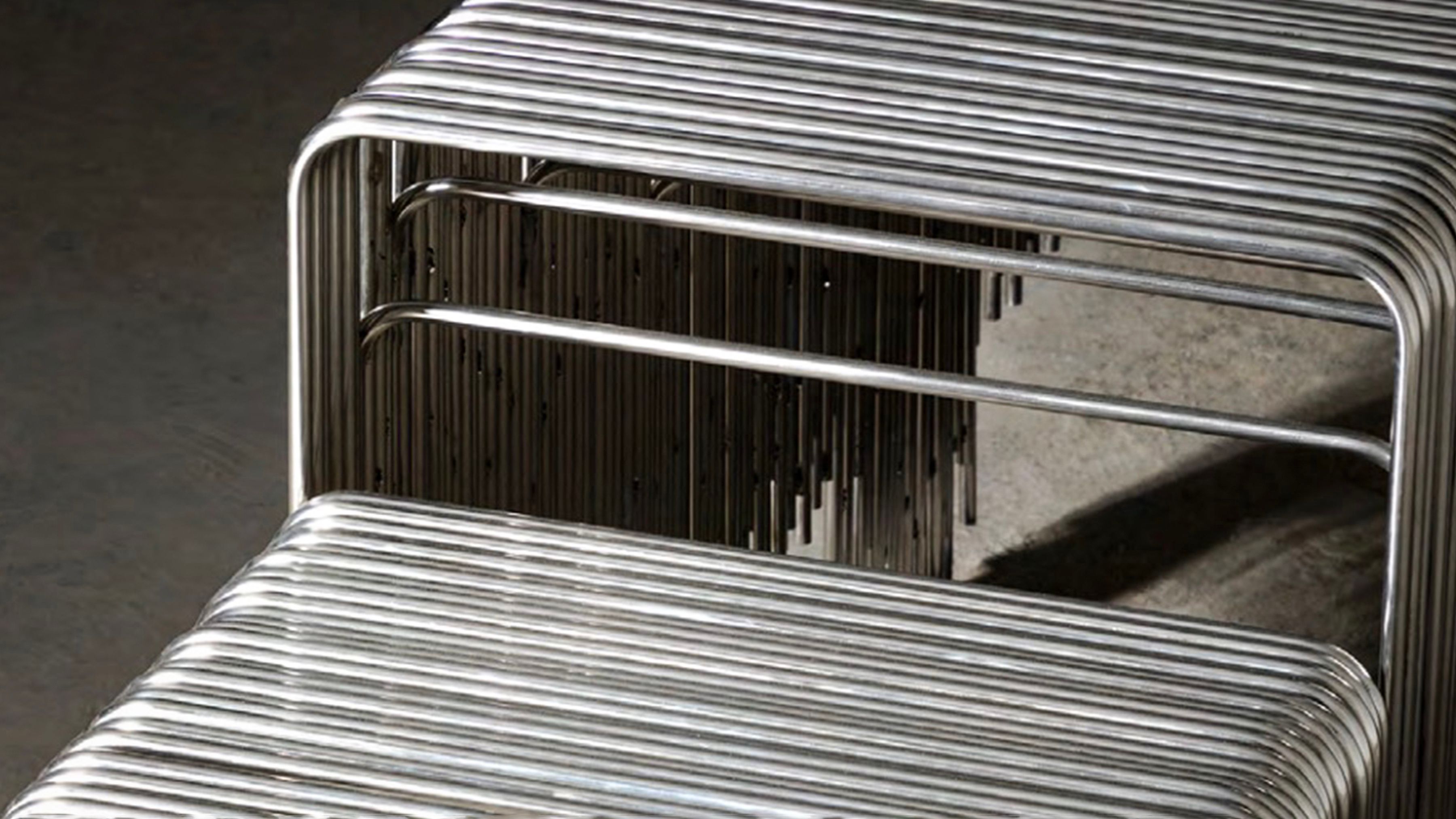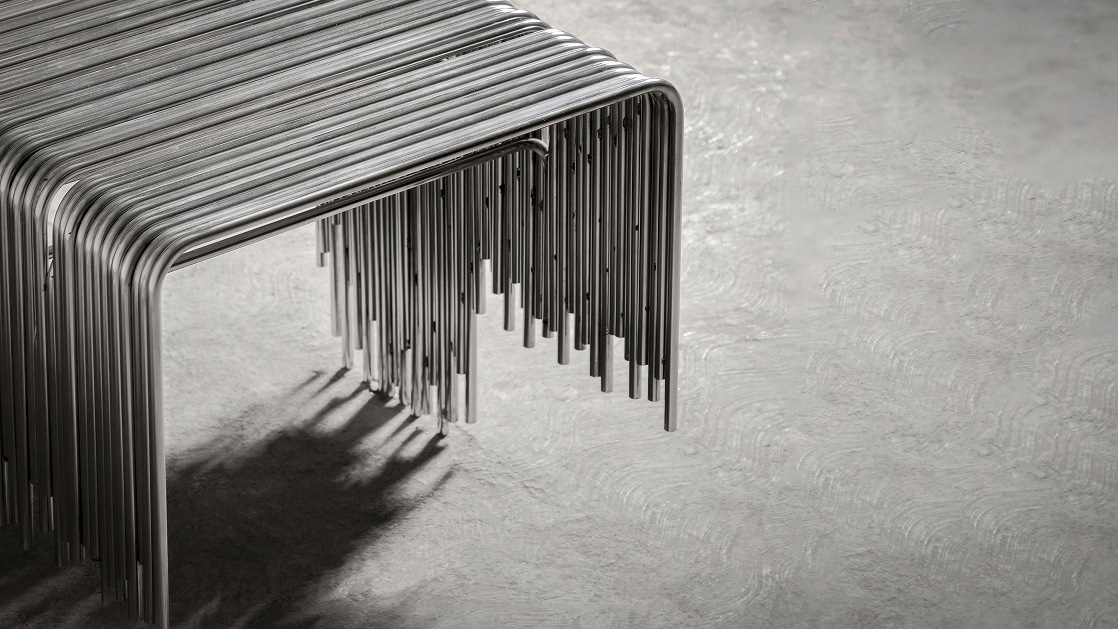 Rooted in the foundational principle of repetition, the Frecuencia series uses bent steel bars—layered with subtle depth and offset—to shape negative space.
