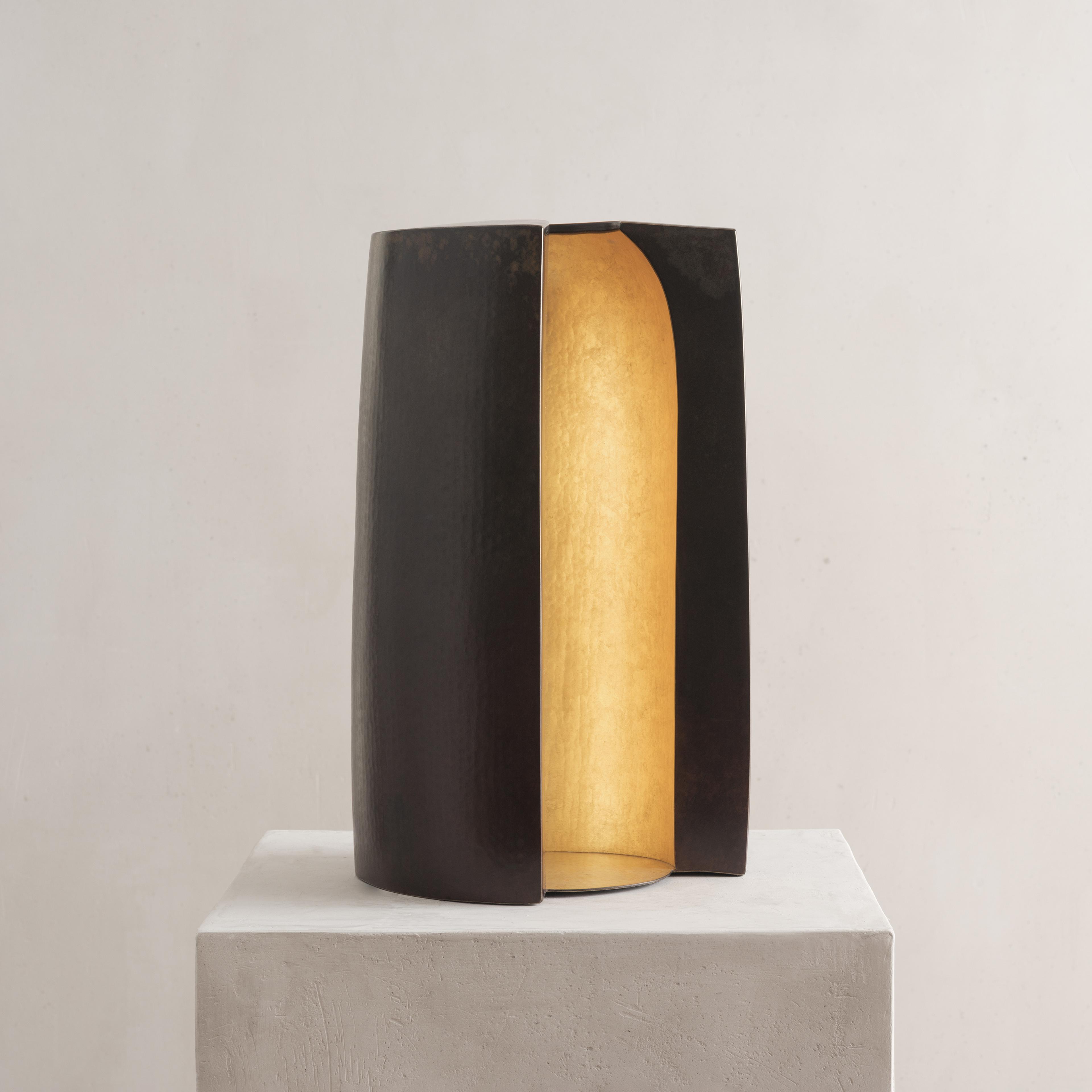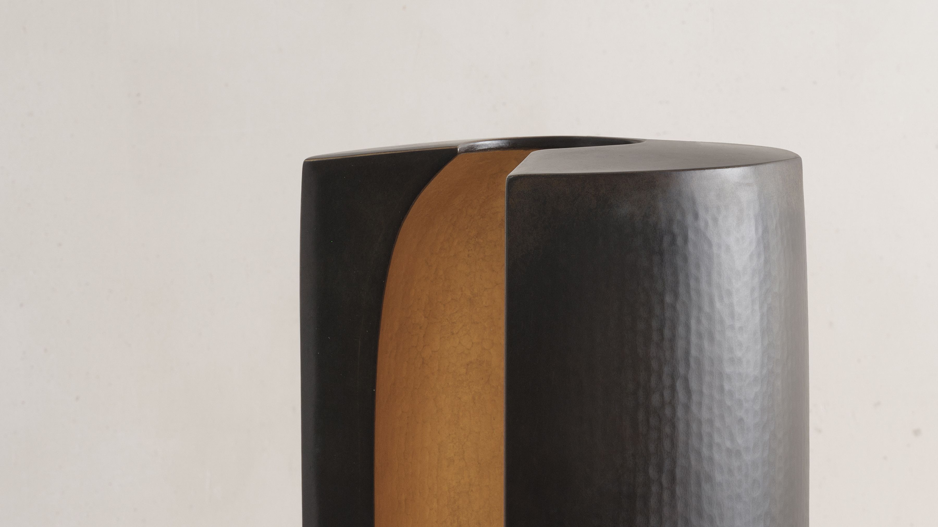 The result is an array of illusive organic forms with highly tactile skins patinated and buffed with beeswax. His pieces create a cohesive ensemble of works of elegant simplicity that combine a feminine sensuality through lissome forms and a masculine presence through weight and materiality. Often, their dark-skinned bodies open up to reveal an intricately hammered interior gilded in gold leaf. Also part of Wahlen’s artistic vocabulary is the rare, gravity-defying positions that the sculptor achieves through curvature and weight. This sense of balance resonates throughout the artist's versatile sculptures, which embody an elegant equilibrium between art and craft, interior and exterior, concealment and revelation, lightness and substance. Or as Wahlen states, between "my wisdom and my folly, my dreams and reality."