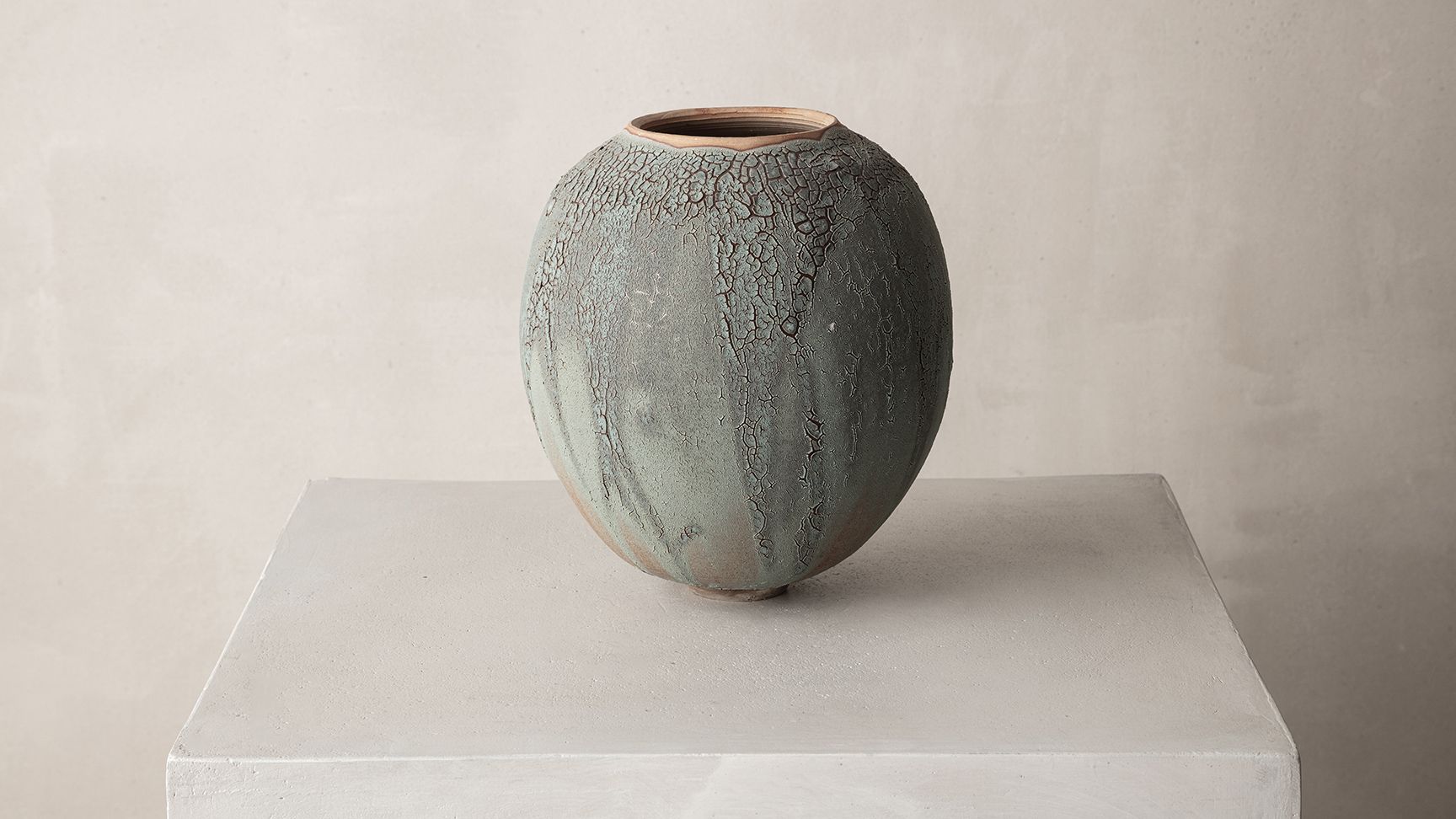 Swami's work is deeply informed by the natural characteristics of the Earth. From its surface down to its deeper stratus, she mimics the parched, cracked, and fractured textures found in nature. The particularity of her work results from the convergence of time-honored techniques from different parts of the world that have inspired the artist; the cobalt blue or celadon-green glazes reveal deep layers of nuanced colors and the simple shapes of her works are reminiscent of Asian and Hellenistic ceramics dating back to the ancient dynasties. To create her unique finish, Swami burnishes each piece with an agate stone, they are then bisque-fired, smoked, waxed, then re-worked often with Urushi lacquer and pure gold in the traditional Japanese Kintsugi technique.