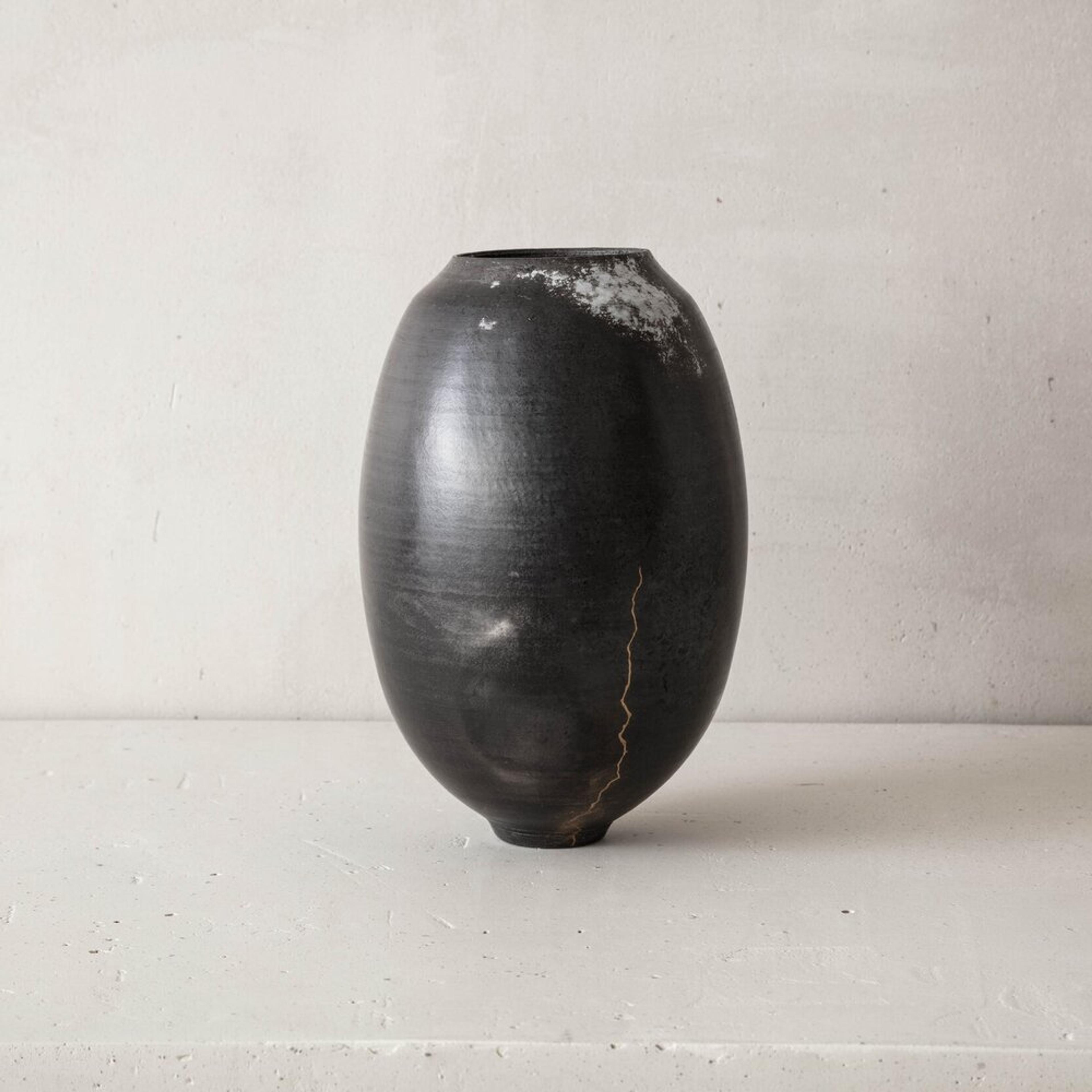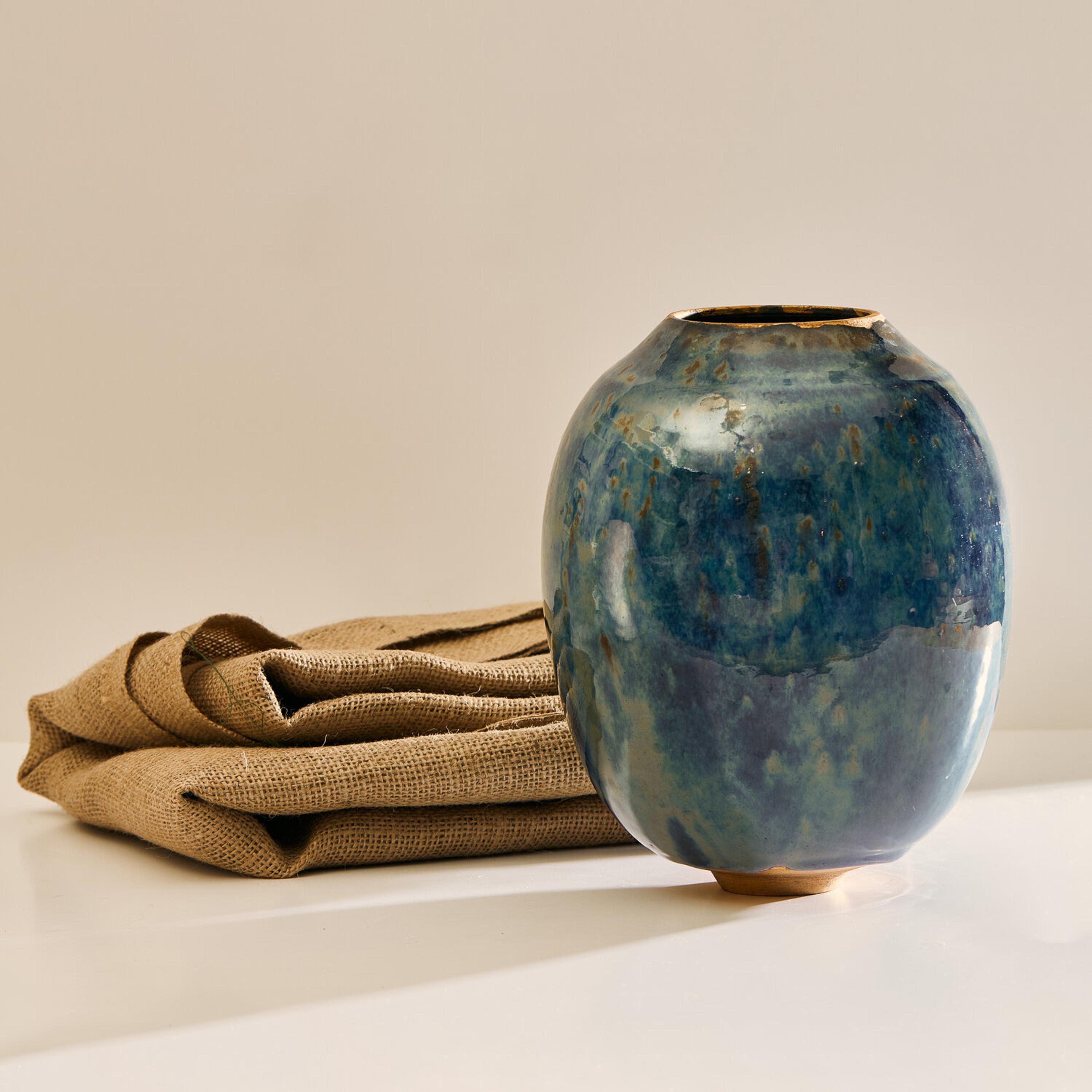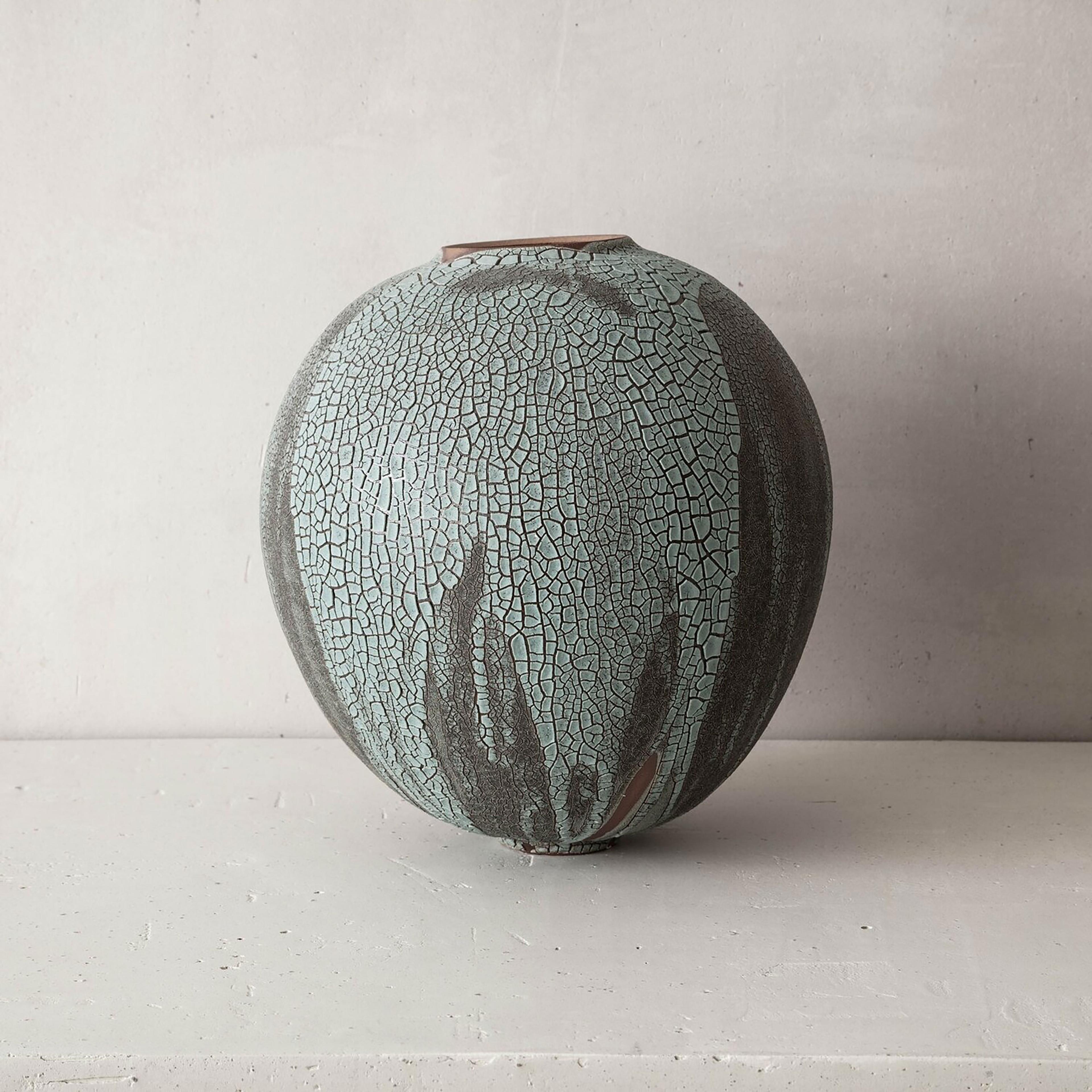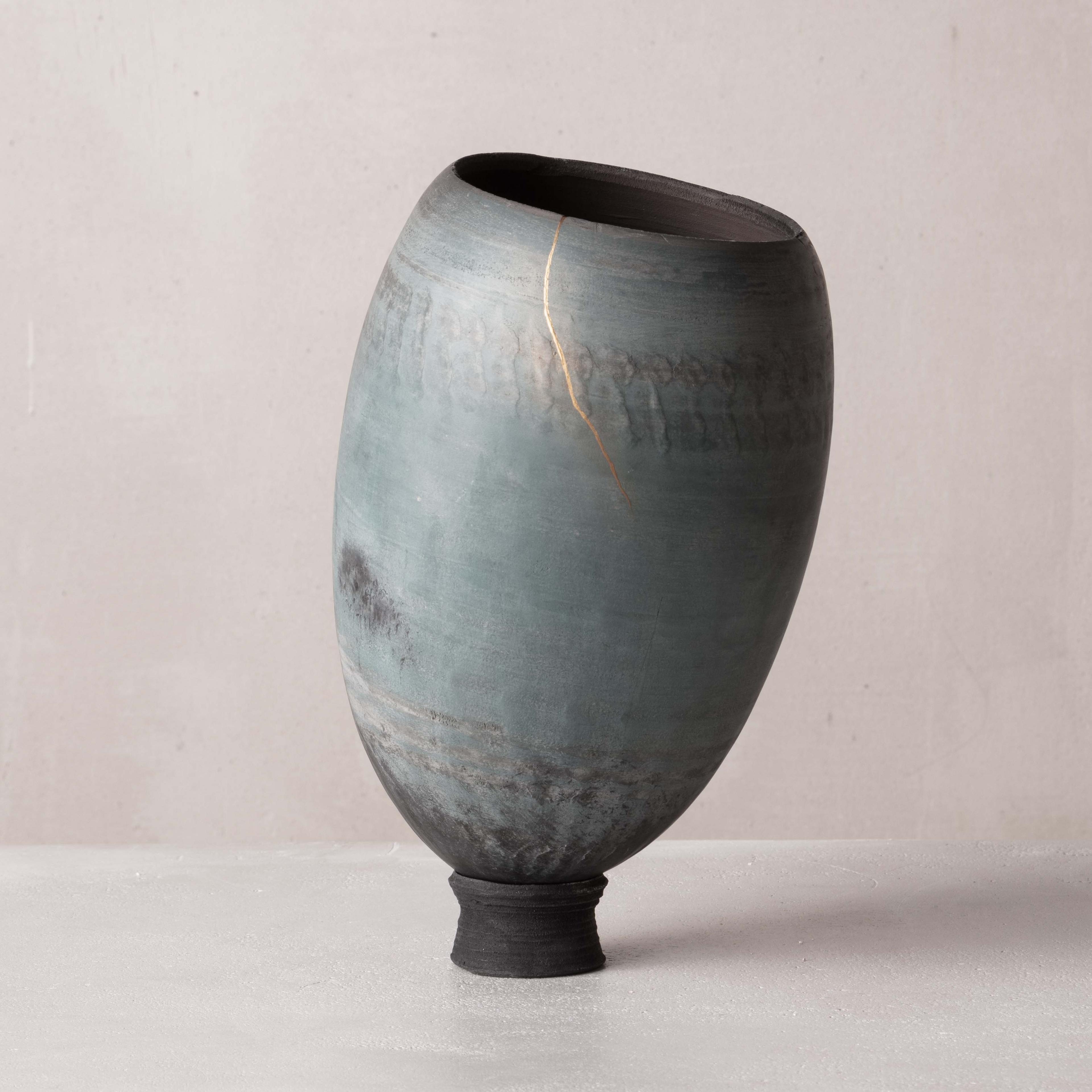 Swami's work is deeply informed by the natural characteristics of the Earth. From its surface down to its deeper stratus, she mimics the parched, cracked, and fractured textures found in nature. The particularity of her work results from the convergence of time-honored techniques from different parts of the world that have inspired the artist; the cobalt blue or celadon-green glazes reveal deep layers of nuanced colors and the simple shapes of her works are reminiscent of Asian and Hellenistic ceramics dating back to the ancient dynasties. To create her unique finish, Swami burnishes each piece with an agate stone, they are then bisque-fired, smoked, waxed, then re-worked often with Urushi lacquer and pure gold in the traditional Japanese Kintsugi technique.