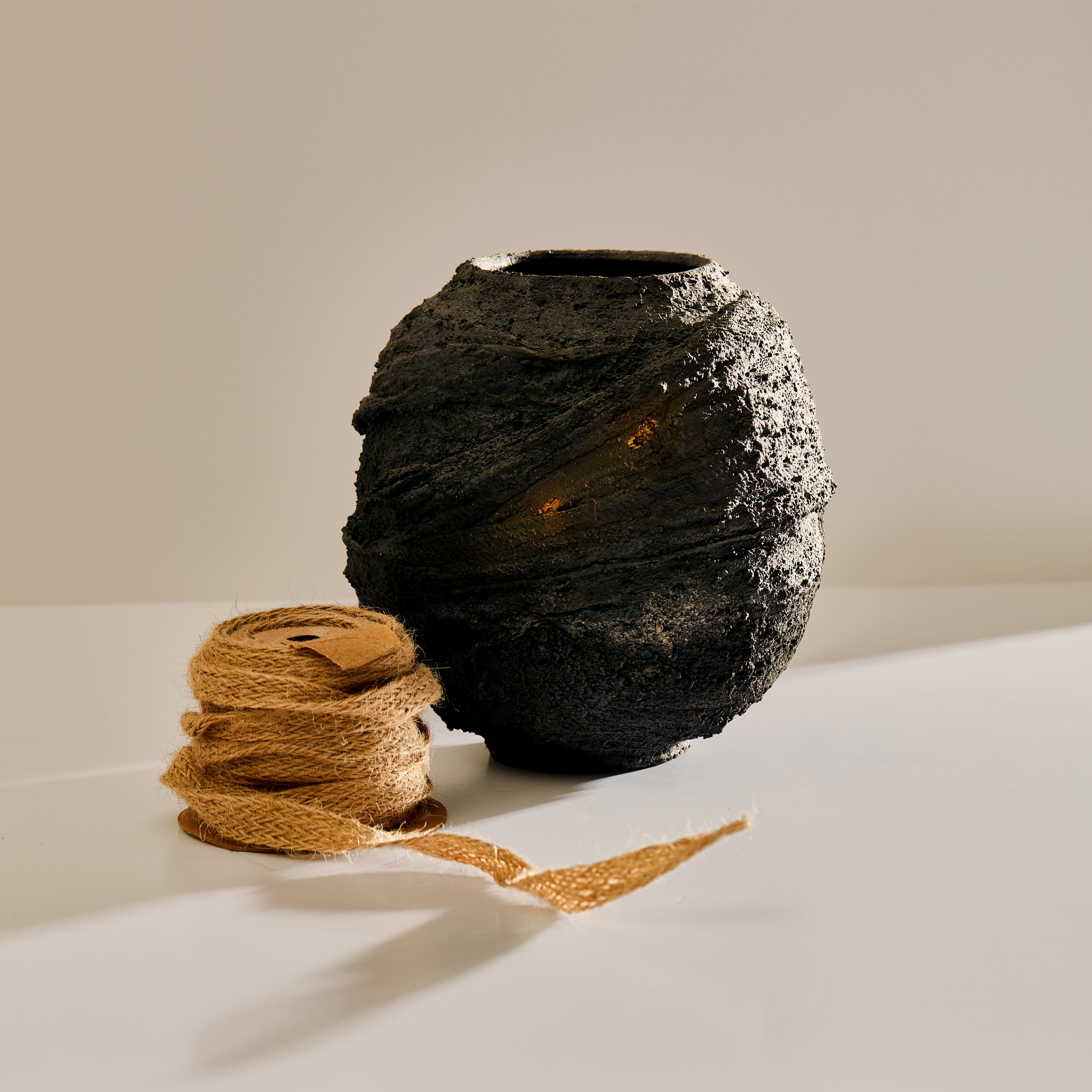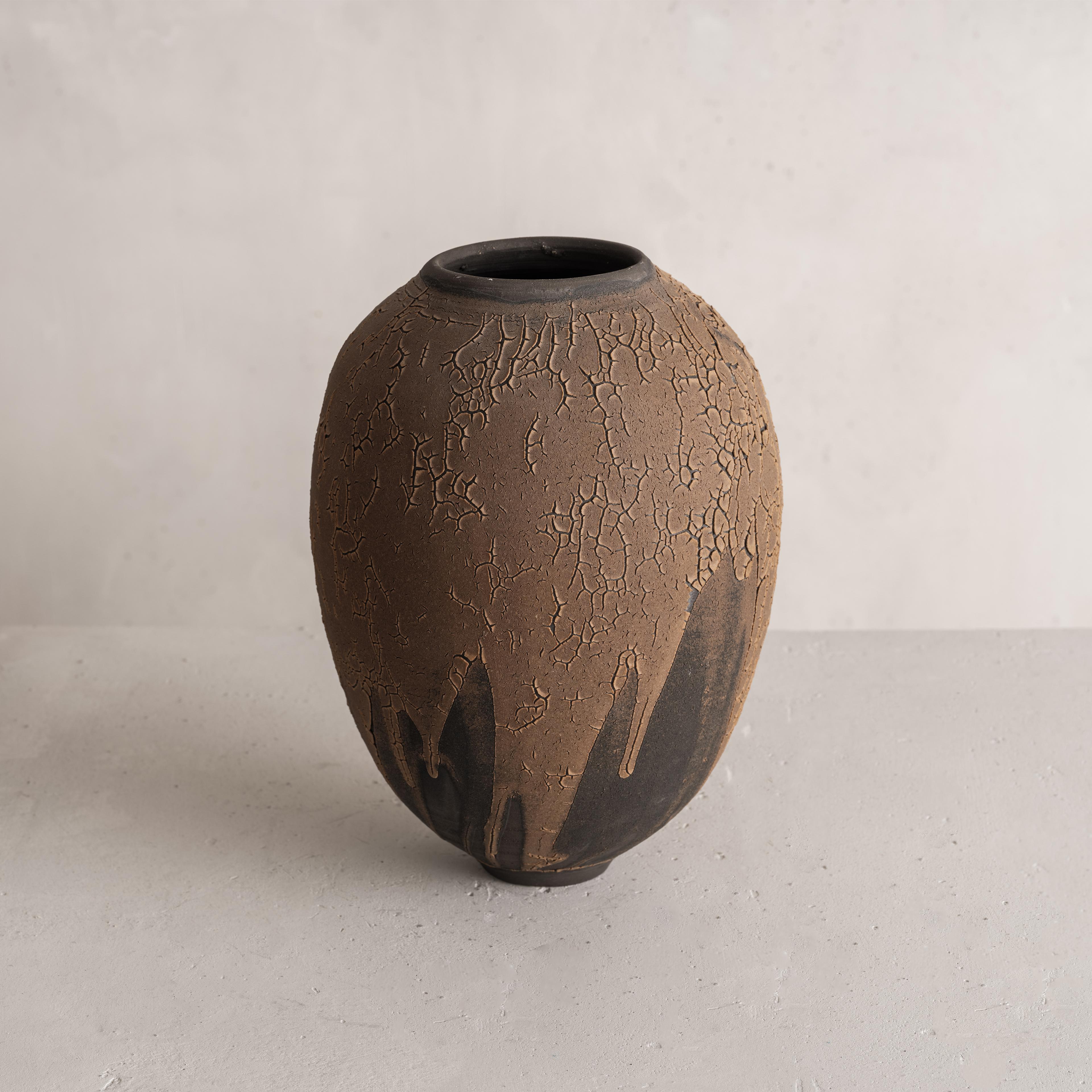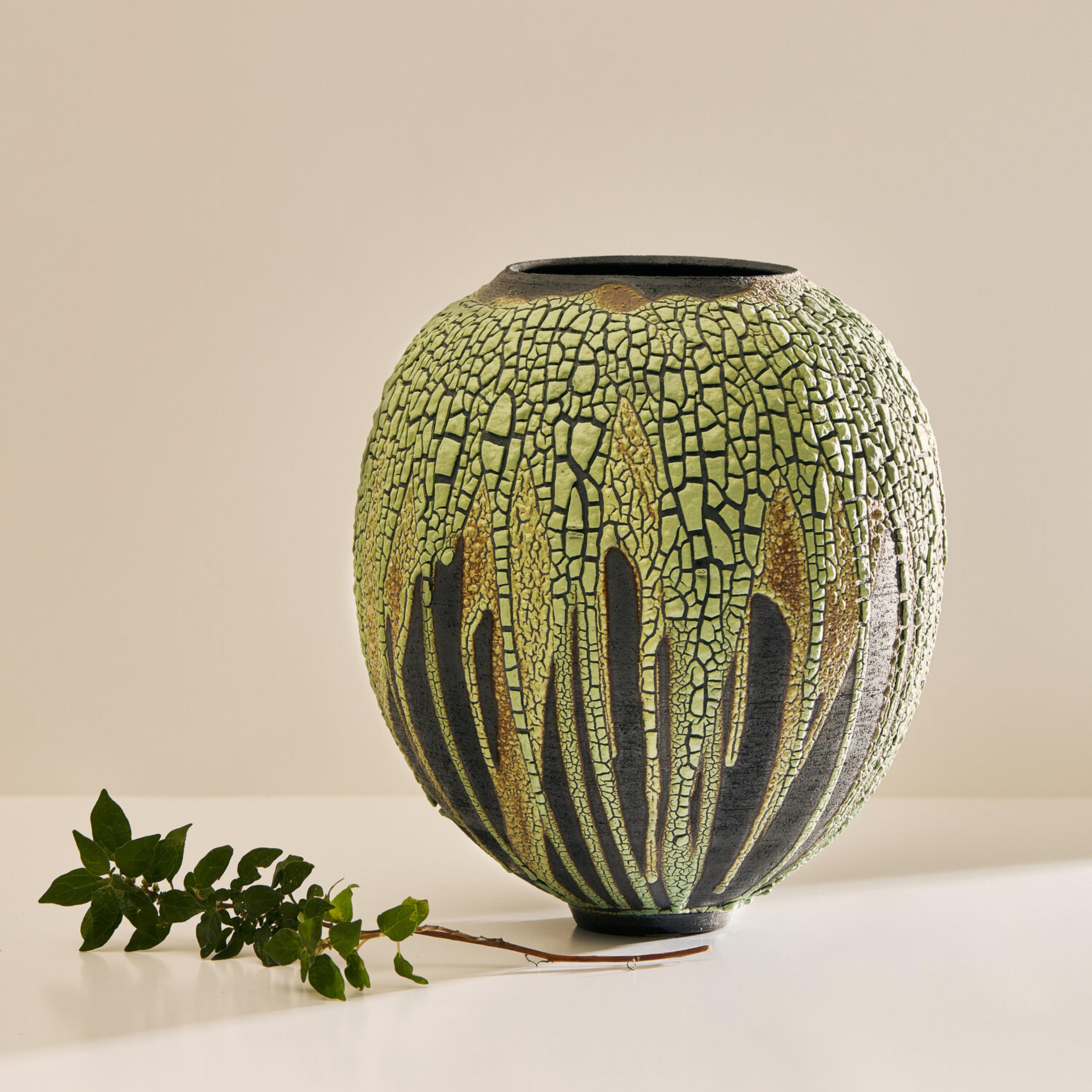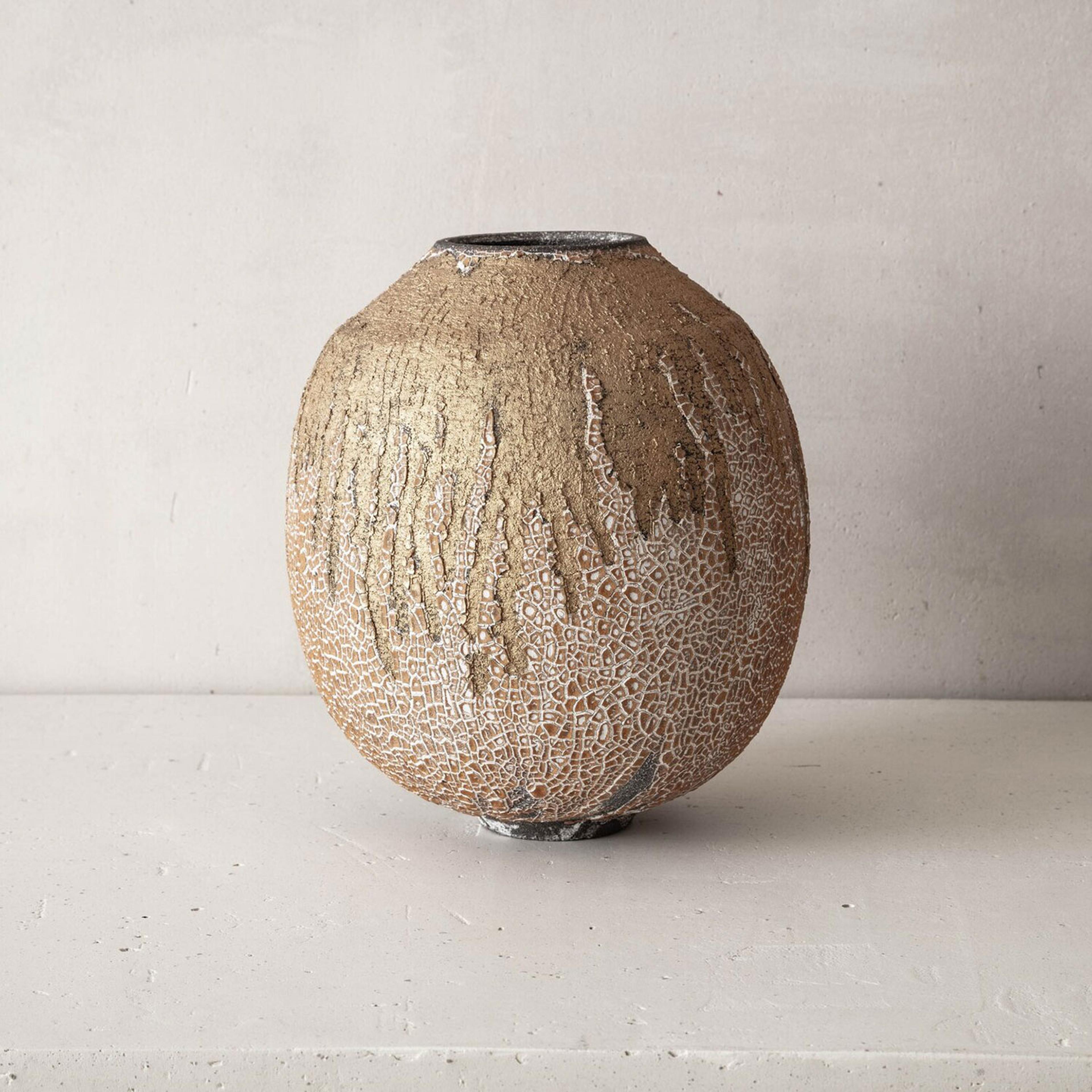 Swami's work is deeply informed by the natural characteristics of the Earth. From its surface down to its deeper stratus, she mimics the parched, cracked, and fractured textures found in nature. The particularity of her work results from the convergence of time-honored techniques from different parts of the world that have inspired the artist; the cobalt blue or celadon-green glazes reveal deep layers of nuanced colors and the simple shapes of her works are reminiscent of Asian and Hellenistic ceramics dating back to the ancient dynasties. To create her unique finish, Swami burnishes each piece with an agate stone, they are then bisque-fired, smoked, waxed, then re-worked often with Urushi lacquer and pure gold in the traditional Japanese Kintsugi technique.