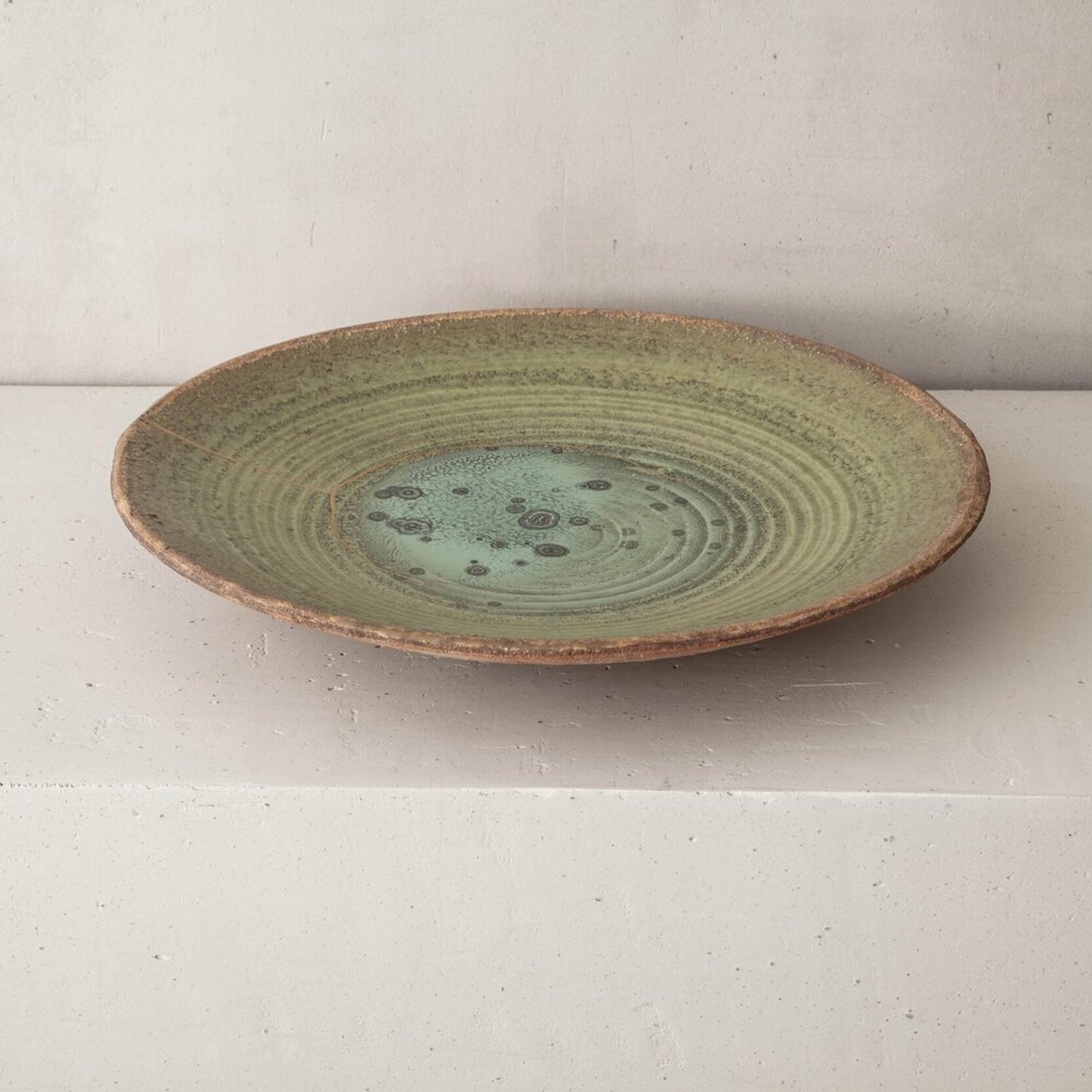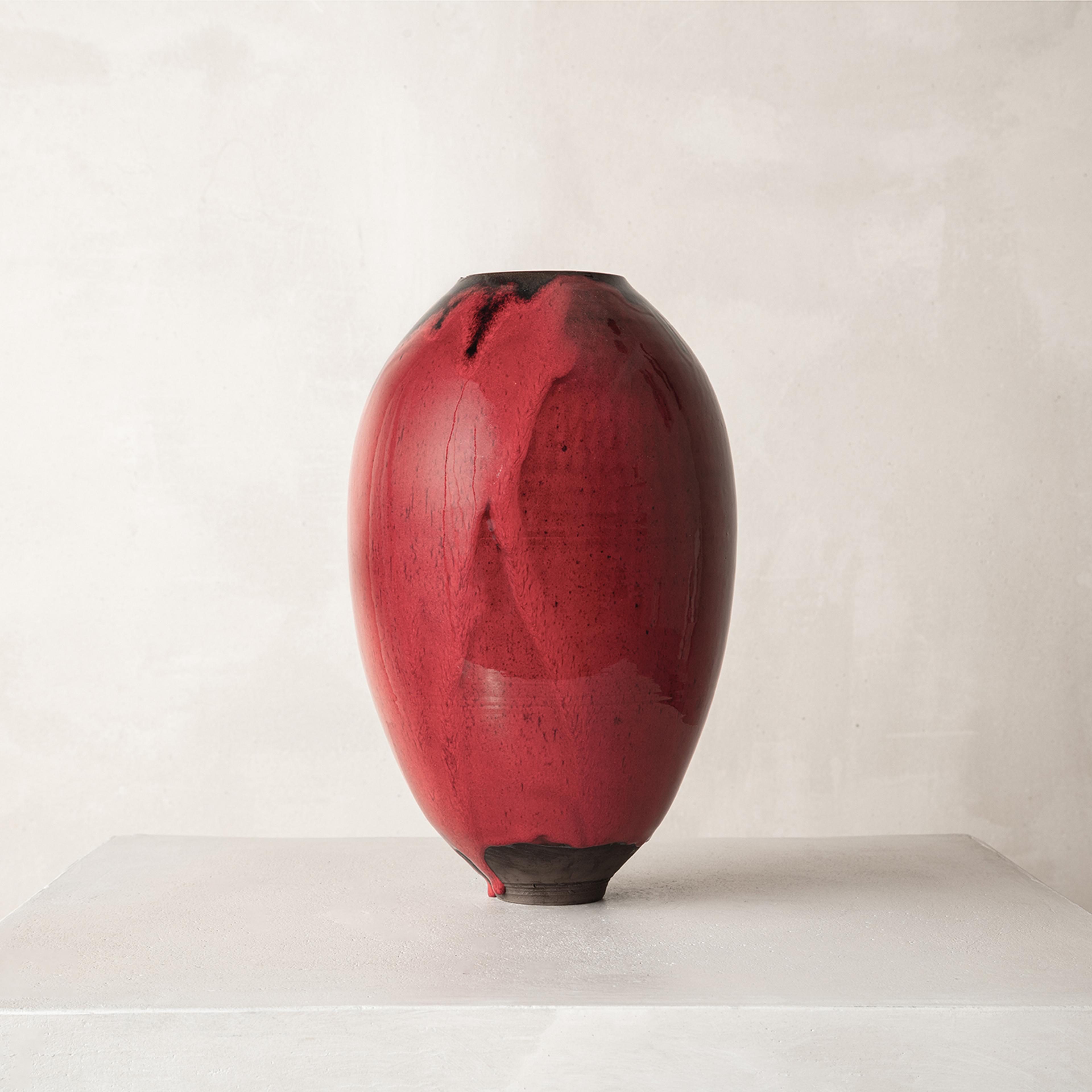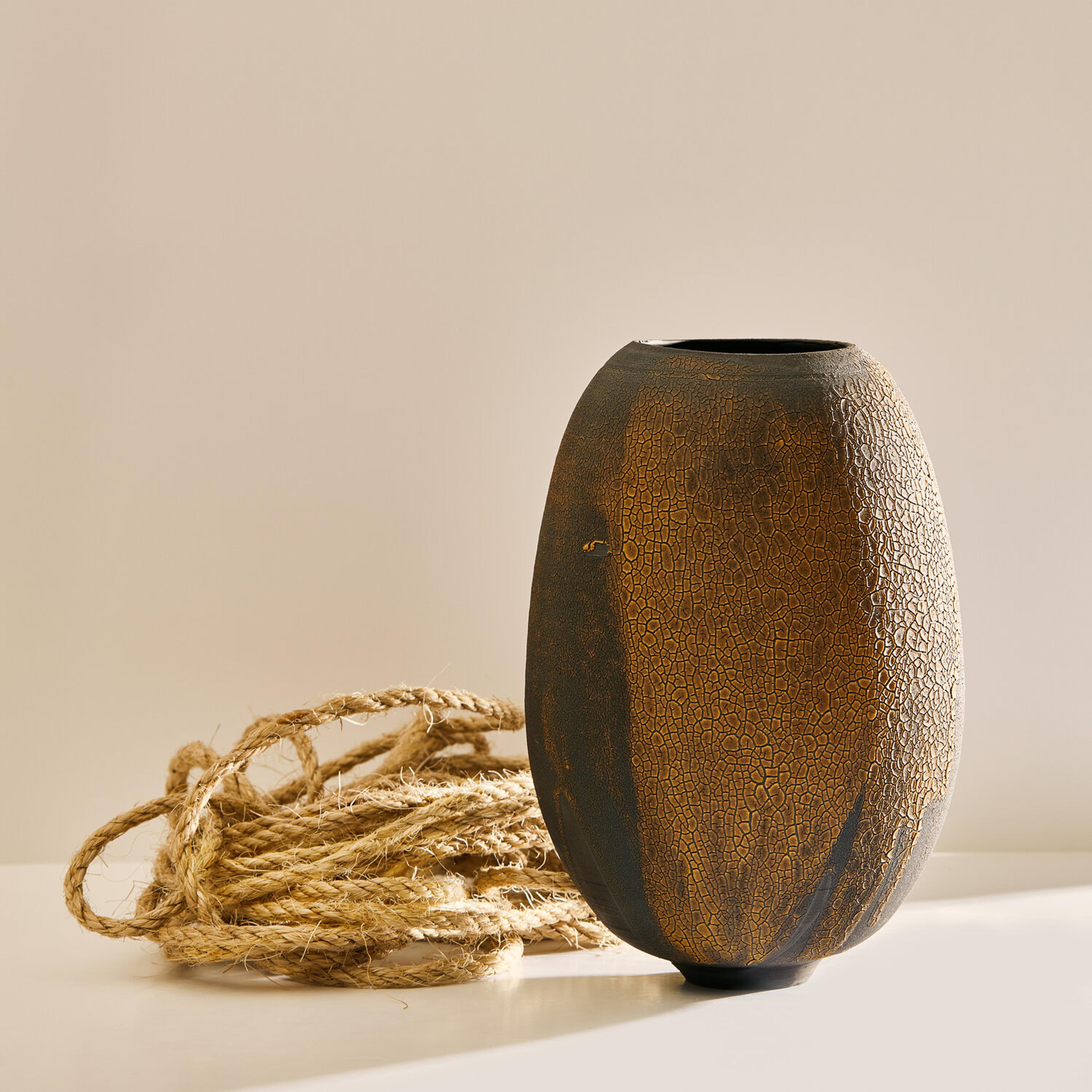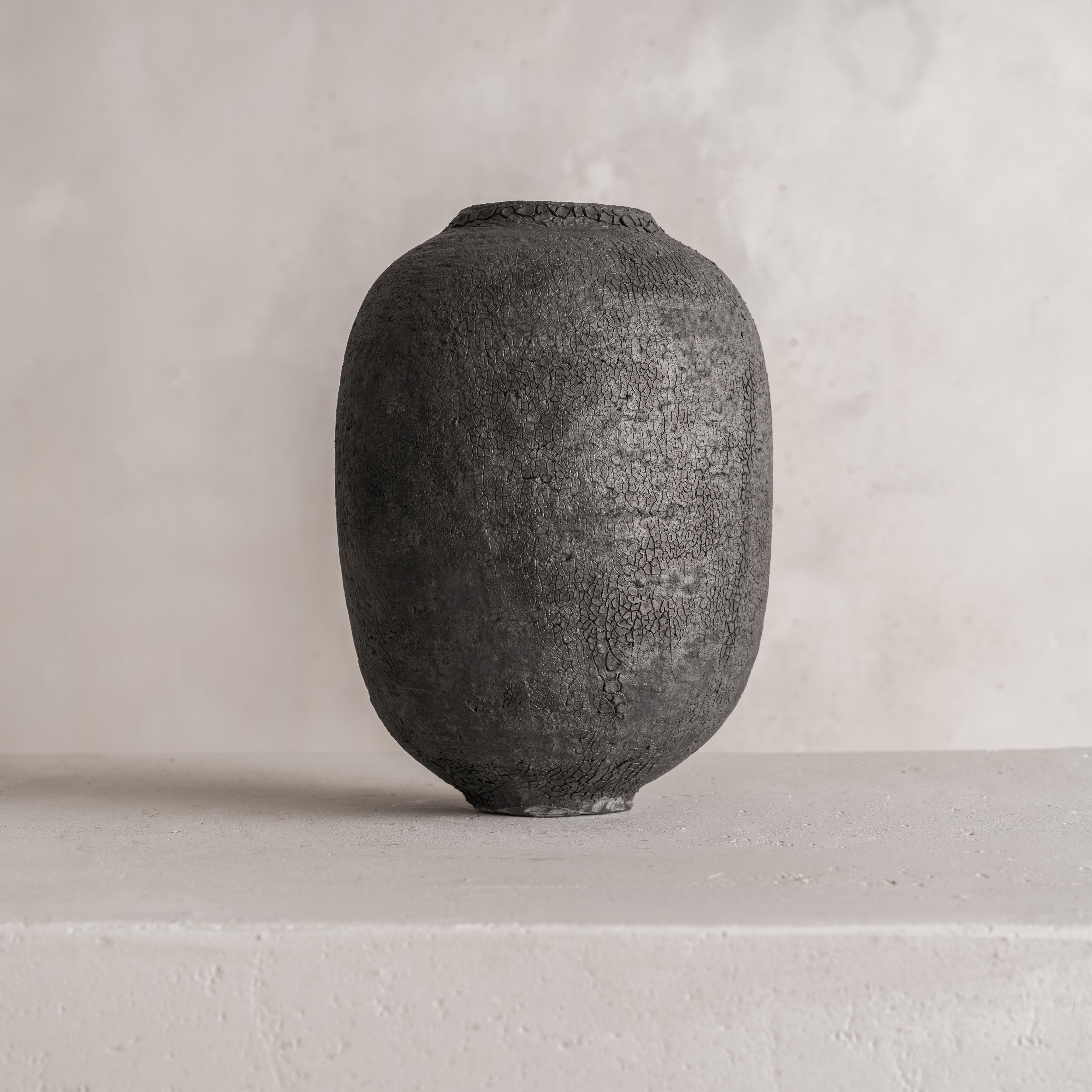 Swami's work is deeply informed by the natural characteristics of the Earth. From its surface down to its deeper stratus, she mimics the parched, cracked, and fractured textures found in nature. The particularity of her work results from the convergence of time-honored techniques from different parts of the world that have inspired the artist; the cobalt blue or celadon-green glazes reveal deep layers of nuanced colors and the simple shapes of her works are reminiscent of Asian and Hellenistic ceramics dating back to the ancient dynasties. To create her unique finish, Swami burnishes each piece with an agate stone, they are then bisque-fired, smoked, waxed, then re-worked often with Urushi lacquer and pure gold in the traditional Japanese Kintsugi technique.