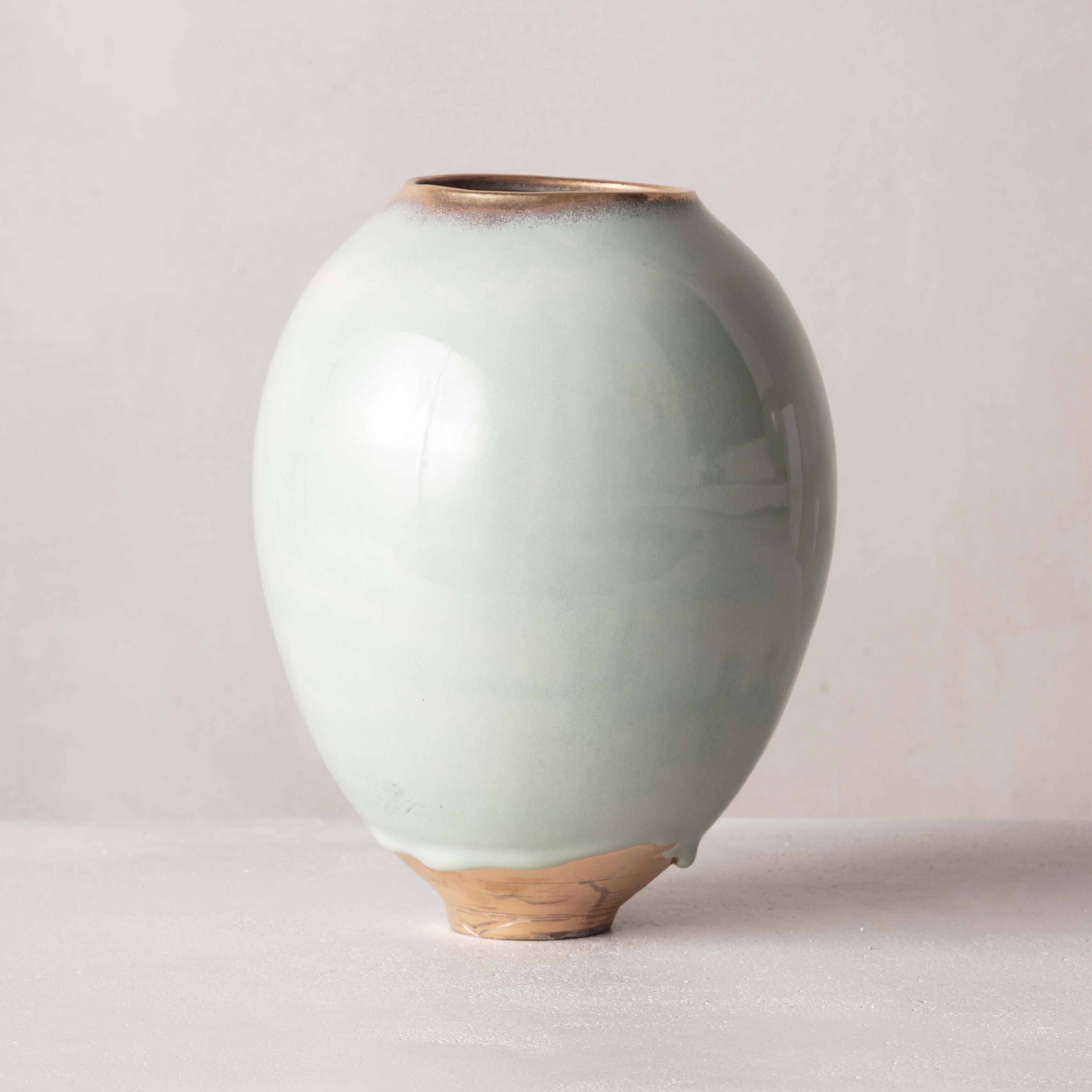The particularity of her work results from the convergence of time-honored techniques from different parts of the world; the cobalt blue or celadon-green glazes reveal deep layers of nuanced colors and the simple shapes of her works are reminiscent of Asian and Hellenistic ceramics dating back to the ancient dynasties. To create her unique finish, Swami burnishes each piece with an agate stone, they are then bisque-fired, smoked, waxed, then re-worked often with Urushi lacquer and pure gold in the traditional Japanese Kintsugi technique.