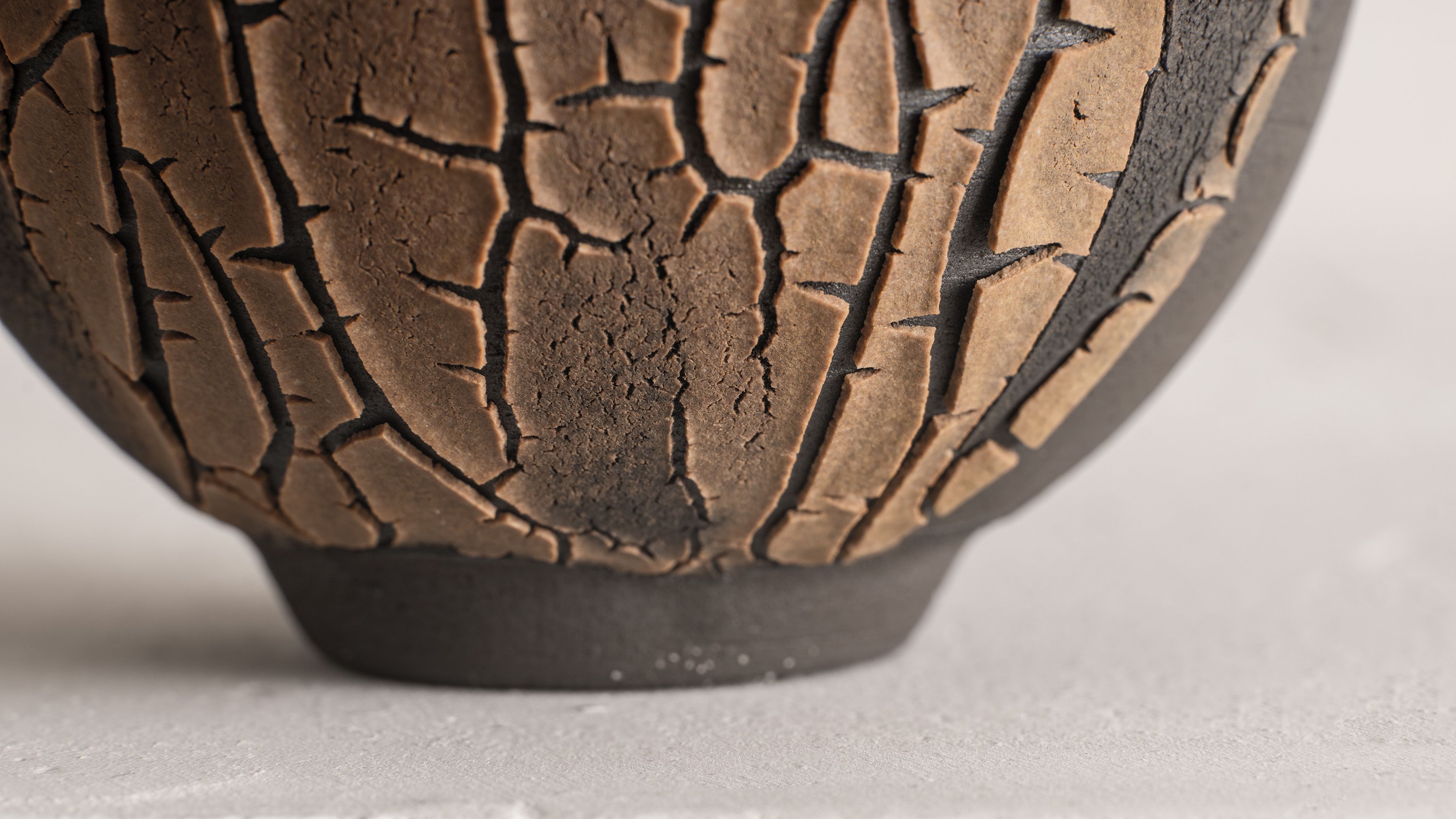 Working between Paris and Brittany, Swami has been drawn to the tactile and visual experience of clay since her early childhood. It was not until 2009 that she chose to dedicate her life to mastering ceramic techniques. In 2010 Swami received her certificate of professional competence in pottery. As she pursues her study of the material through ongoing experimentations at her studio, the artist has since developed an extensive body of work involving various time-honored techniques picked up from ceramic traditions from around the world. Swami embraces the beautiful and poetic imperfections resulting from controlled incidents and weaknesses inherent to the materials. Her work is deeply informed by the natural characteristics of the Earth; from the surface down to its deeper stratus. Swami mimics the parched, cracked and fractured textures found in nature, enabling and emphasizing injured, layered surfaces.