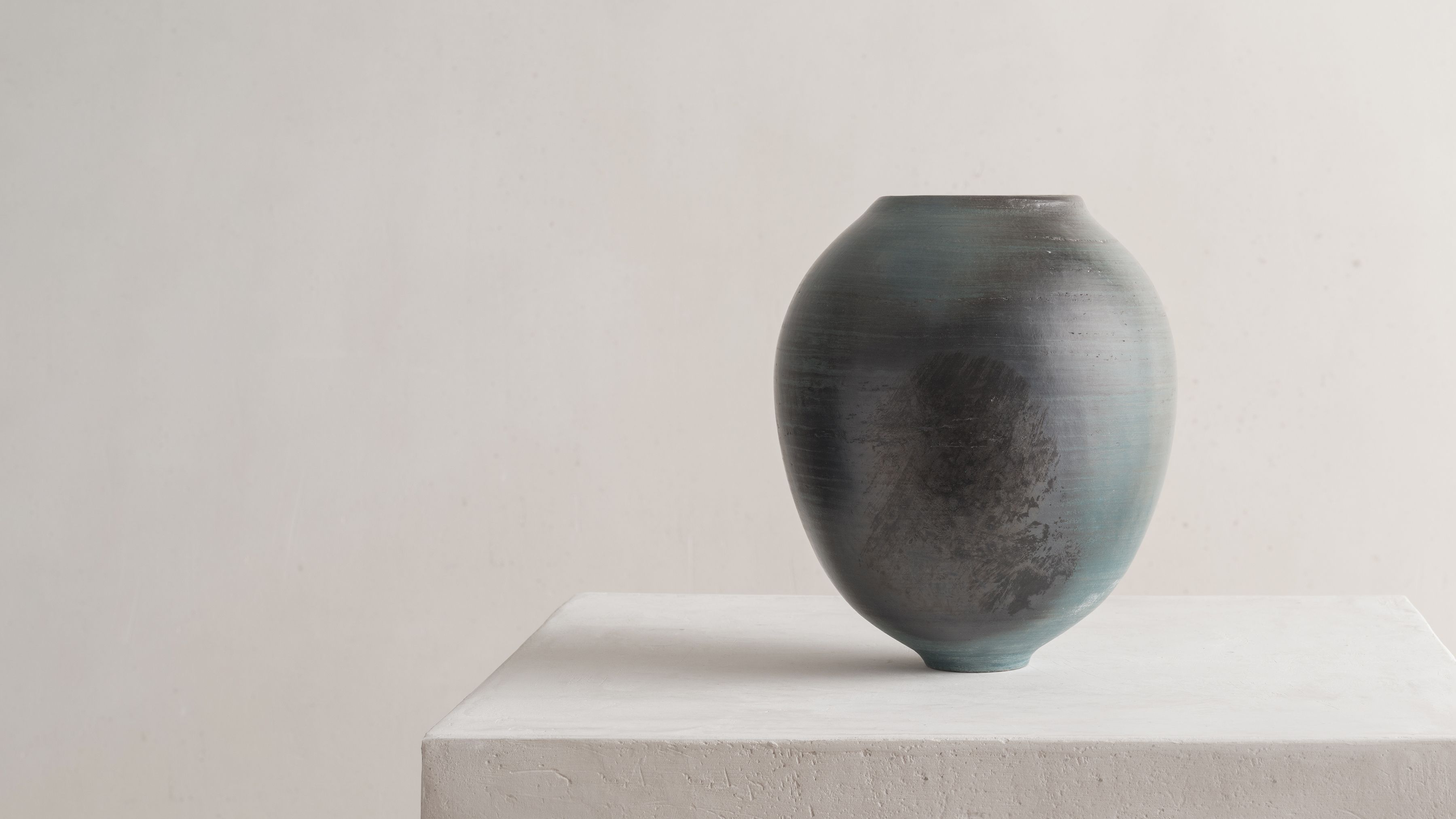 Swami's work is deeply informed by the natural characteristics of the Earth. From its surface down to its deeper stratus, she mimics the parched, cracked, and fractured textures found in nature. The particularity of her work results from the convergence of time-honored techniques from different parts of the world that have inspired the artist; the cobalt blue or celadon-green glazes reveal deep layers of nuanced colors and the simple shapes of her works are reminiscent of Asian and Hellenistic ceramics dating back to the ancient dynasties. To create her unique finish, Swami burnishes each piece with an agate stone, they are then bisque-fired, smoked, waxed, then re-worked often with Urushi lacquer and pure gold in the traditional Japanese Kintsugi technique.