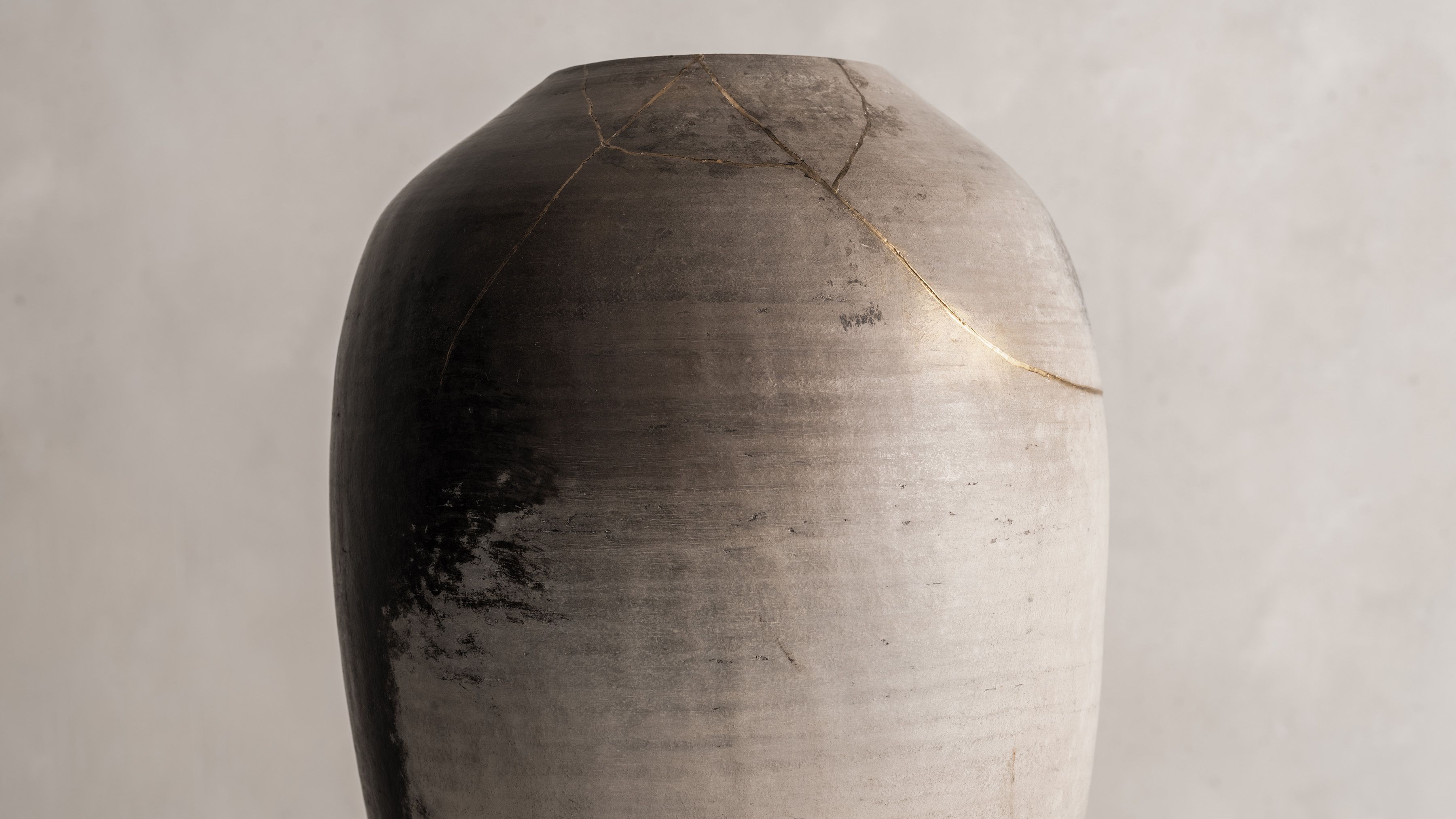 Swami's work is deeply informed by the natural characteristics of the Earth. From its surface down to its deeper stratus, she mimics the parched, cracked, and fractured textures found in nature. The particularity of her work results from the convergence of time-honored techniques from different parts of the world that have inspired the artist; the cobalt blue or celadon-green glazes reveal deep layers of nuanced colors and the simple shapes of her works are reminiscent of Asian and Hellenistic ceramics dating back to the ancient dynasties. To create her unique finish, Swami burnishes each piece with an agate stone, they are then bisque-fired, smoked, waxed, then re-worked often with Urushi lacquer and pure gold in the traditional Japanese Kintsugi technique.