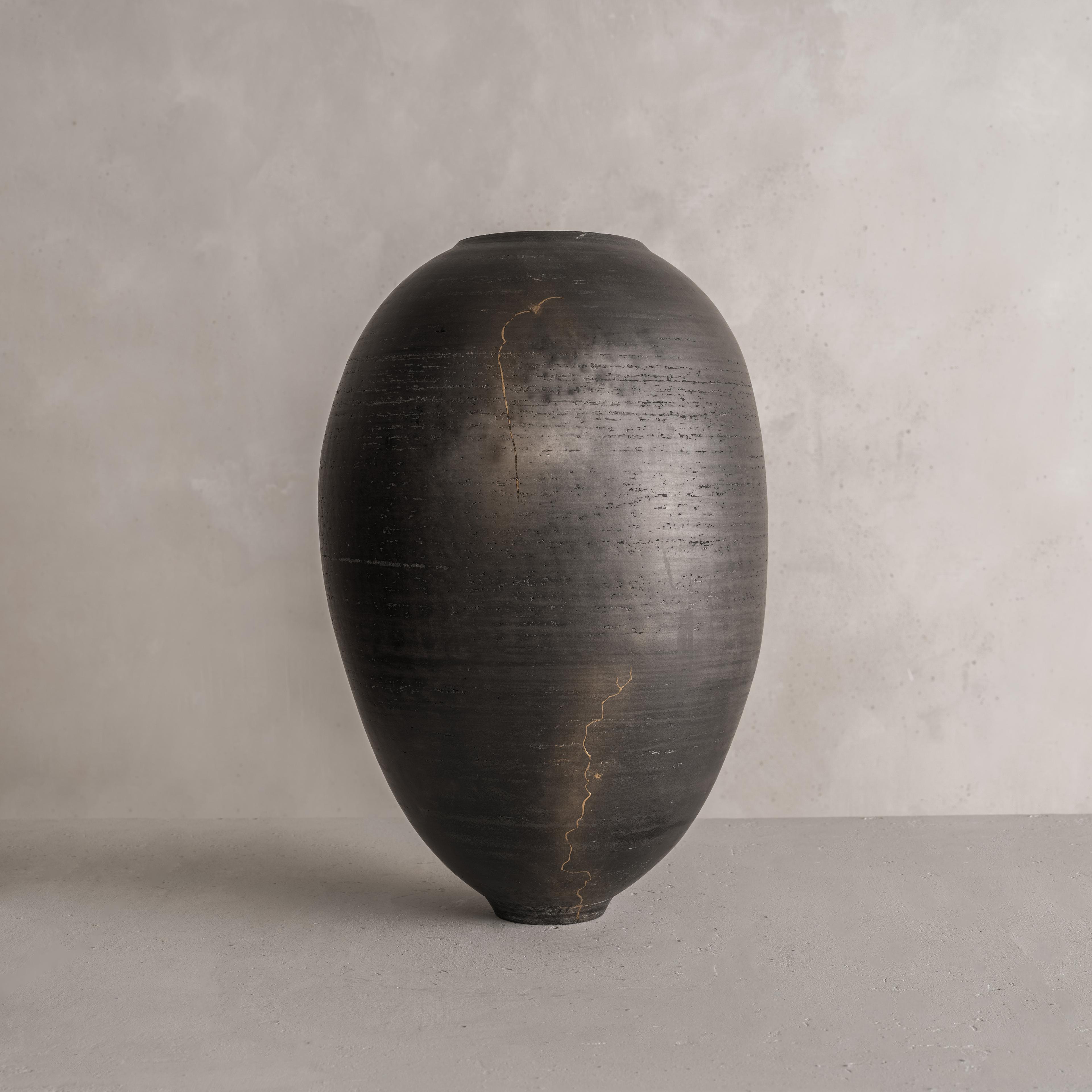 Swami's work is deeply informed by the natural characteristics of the Earth. From its surface down to its deeper stratus, she mimics the parched, cracked, and fractured textures found in nature. The particularity of her work results from the convergence of time-honored techniques from different parts of the world that have inspired the artist; the cobalt blue or celadon-green glazes reveal deep layers of nuanced colors and the simple shapes of her works are reminiscent of Asian and Hellenistic ceramics dating back to the ancient dynasties. To create her unique finish, Swami burnishes each piece with an agate stone, they are then bisque-fired, smoked, waxed, then re-worked often with Urushi lacquer and pure gold in the traditional Japanese Kintsugi technique.
