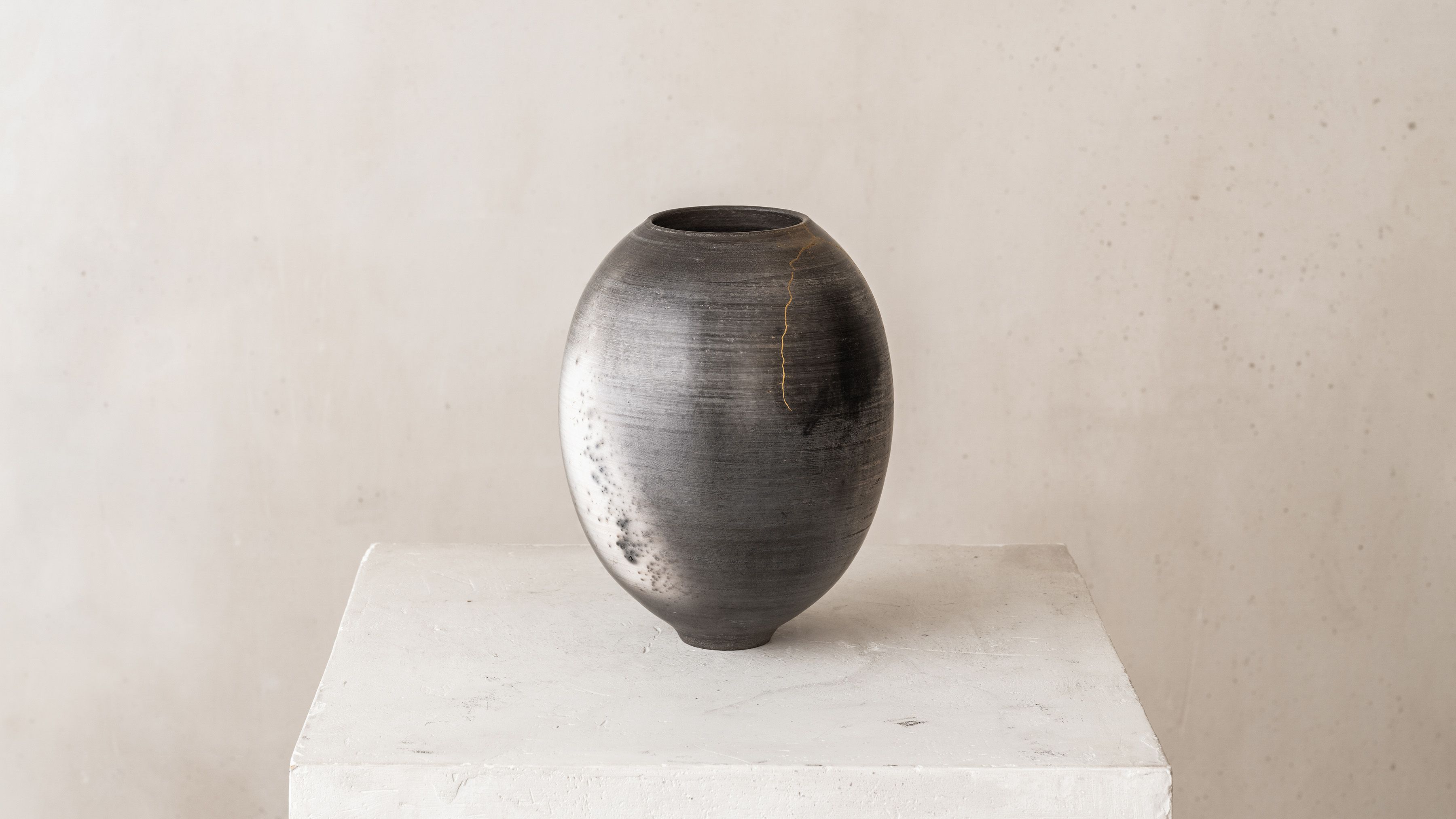Swami's work is deeply informed by the natural characteristics of the Earth. From its surface down to its deeper stratus, she mimics the parched, cracked, and fractured textures found in nature. The particularity of her work results from the convergence of time-honored techniques from different parts of the world that have inspired the artist; the cobalt blue or celadon-green glazes reveal deep layers of nuanced colors and the simple shapes of her works are reminiscent of Asian and Hellenistic ceramics dating back to the ancient dynasties. To create her unique finish, Swami burnishes each piece with an agate stone, they are then bisque-fired, smoked, waxed, then re-worked often with Urushi lacquer and pure gold in the traditional Japanese Kintsugi technique.