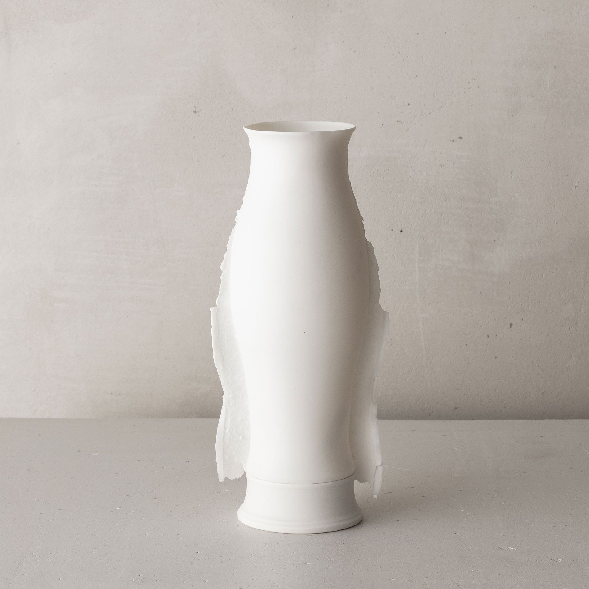 Highly informed by visual arts, including both painting and drawing, her porcelain works explore the contrasts of emphasized organic textures on soft skin-like surfaces. Each of her pieces defies the materiality of the porcelain, stretching the matter to its thinnest; their translucent skin enthralls the natural light, while their silhouettes evoke the artist’s gesture as they quietly embody a movement. All whilst refining her technical dexterity and her artistic signature, Glenday has grown a cohesive body of work comprised of delicate vessels that accentuate the porcelain’s lightness and translucent quality.