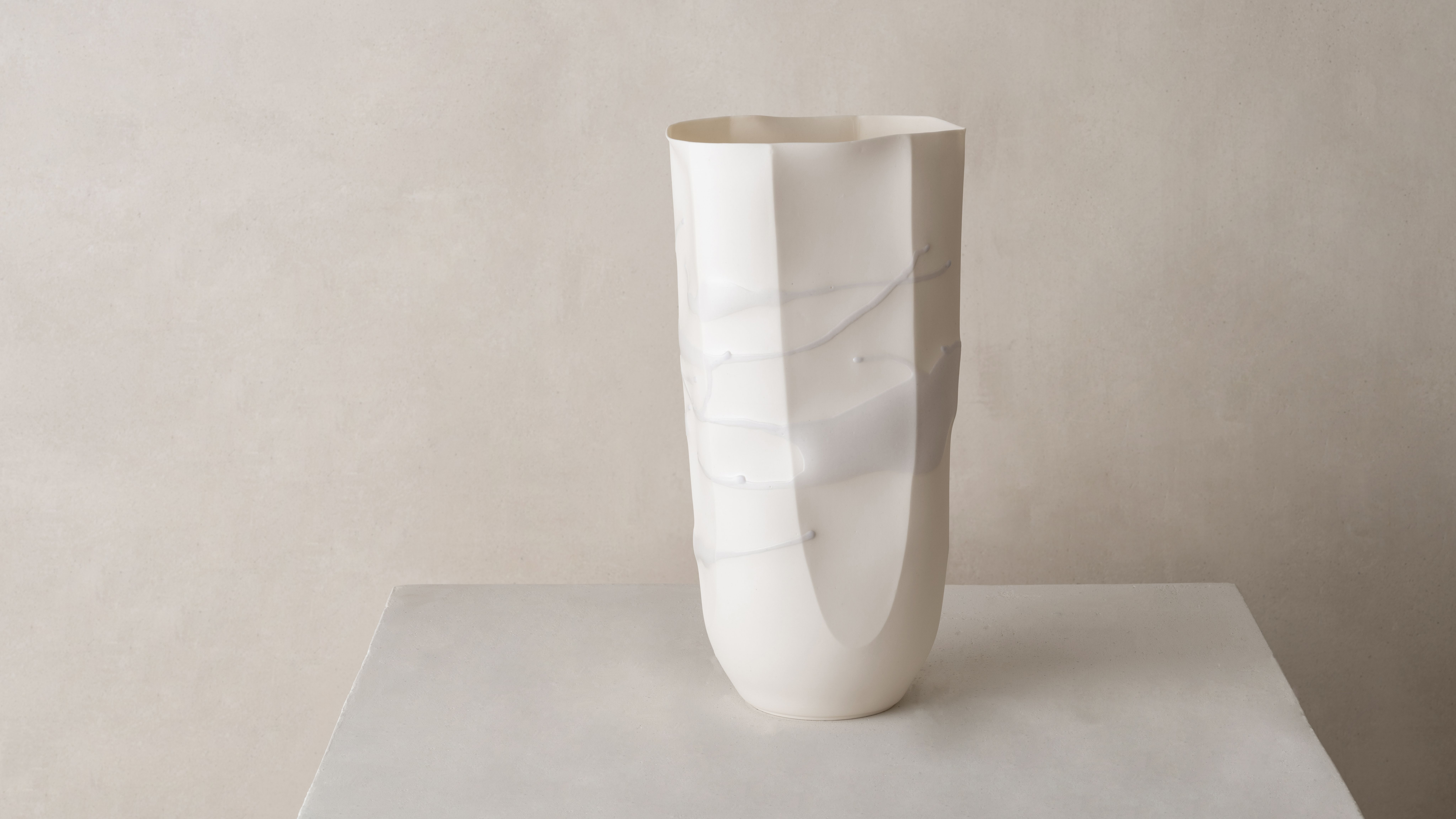 Highly informed by visual arts, including both painting and drawing, her porcelain works explore the contrasts of emphasized organic textures on soft skin-like surfaces. Each of her pieces defies the materiality of the porcelain, stretching the matter to its thinnest; their translucent skin enthralls the natural light, while their silhouettes evoke the artist’s gesture as they quietly embody a movement. All whilst refining her technical dexterity and her artistic signature, Glenday has grown a cohesive body of work comprised of delicate vessels that accentuate the porcelain’s lightness and translucent quality.