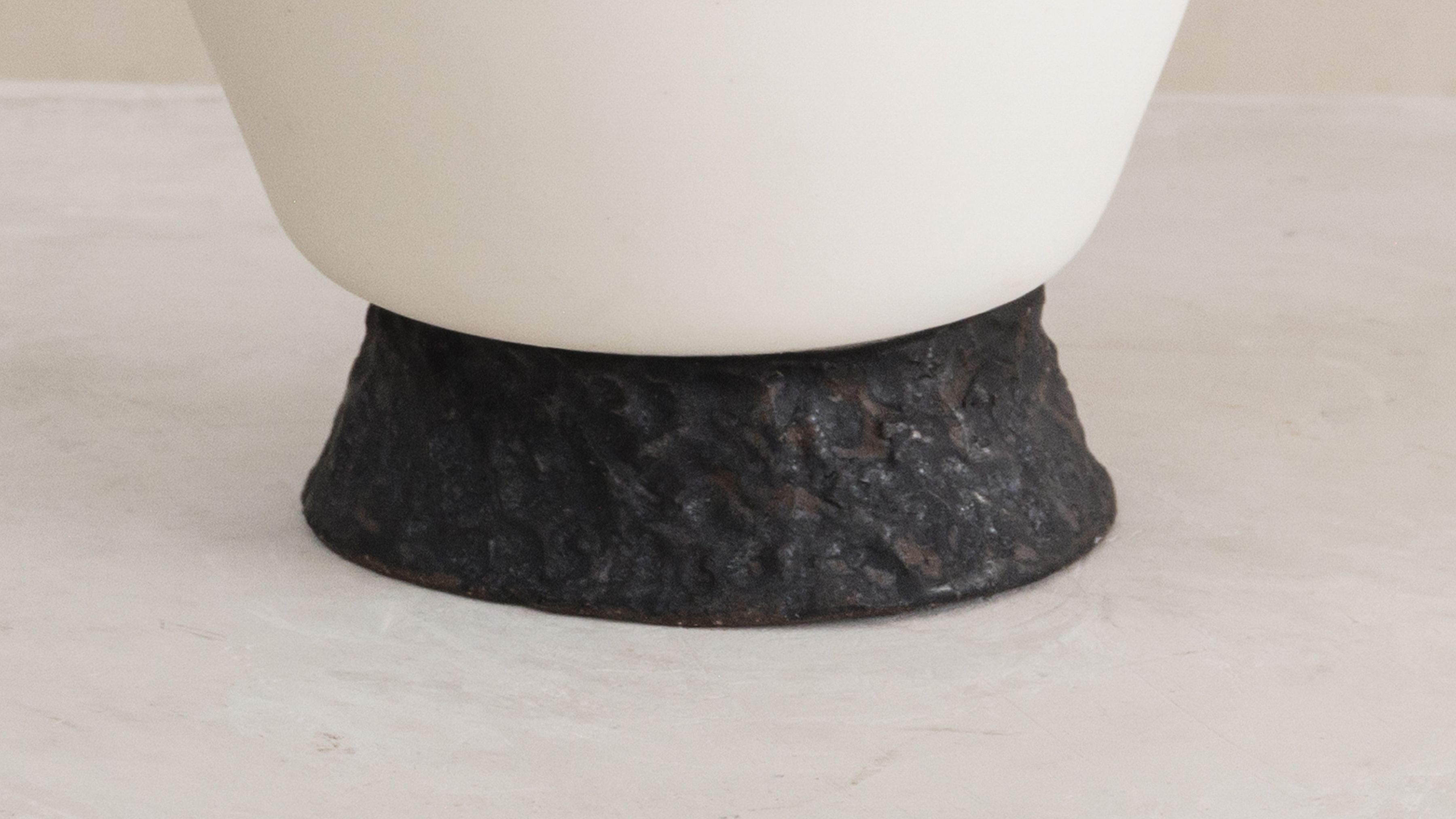 Ateliers Courbet is pleased to unveil IN FLUX, a new series of slip-cast porcelain works by Katherine Glenday. Following her recent focus on coloured cylindrical vessels, Katherine Glenday returns to her roots with white slip-cast porcelain and natural South African oxides, grounding the work in the place she calls home. This series includes slumping sculptural forms — a continuation of a visual language she has long explored — now elevated on hand-formed porcelain bases. Alongside these are vessels with shorn edges, and simpler, more traditional silhouettes, splattered with clay and pigments drawn from the earth.