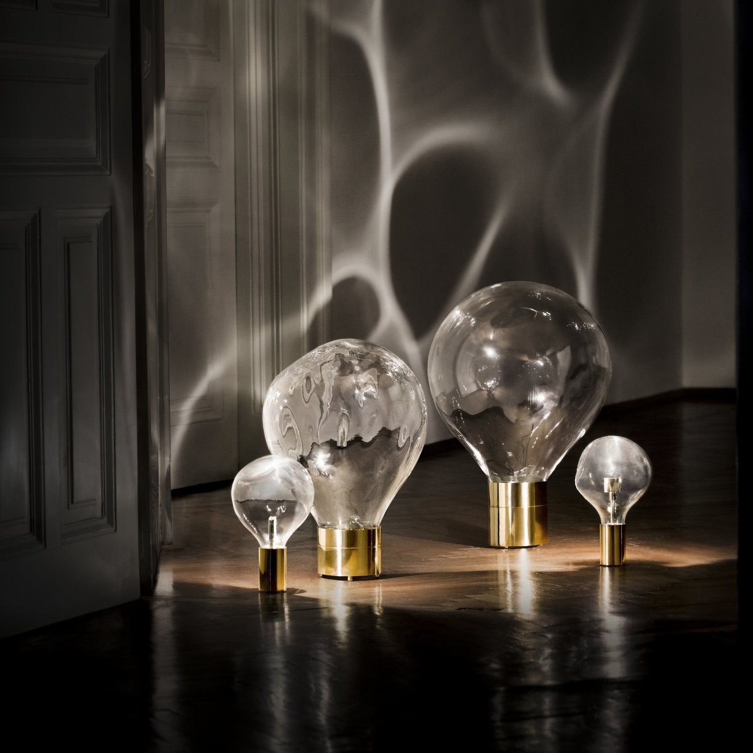 Ripple is a moving light piece that expresses the beauty of the material glass, celebrating the process of its making. Each Ripple set contains a large rotating projection dome and a smaller light dome ensconcing the light source. A focused beam of light projects from the lighting dome through both walls of the mouth-blown, unevenly shaped, and gently rotating projection dome. The effect is a play of shadow and light in an ever-changing, moving ripple pattern – beauty that goes beyond the material itself. Ripple is available in large and medium-size and various surface finishes.