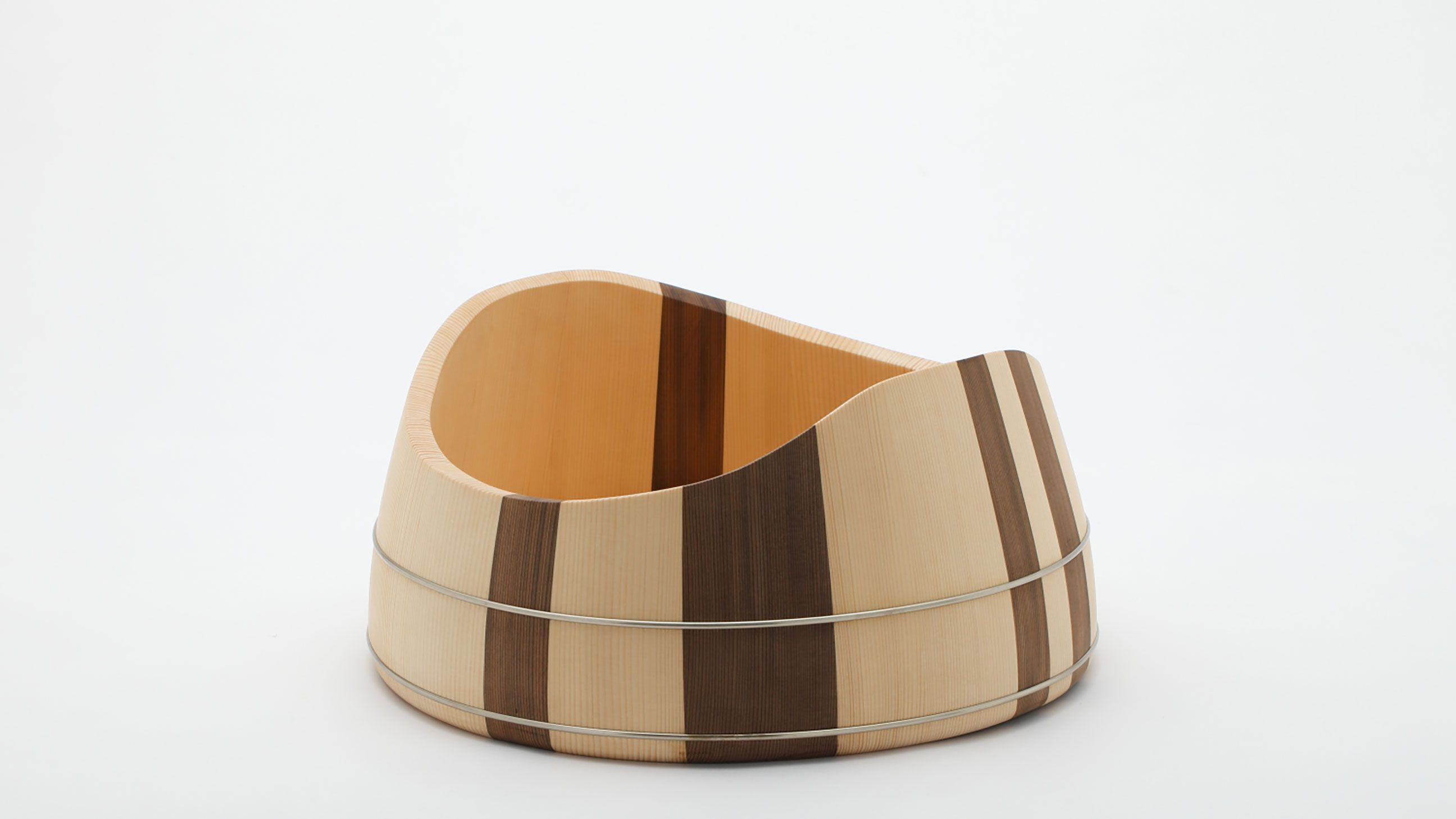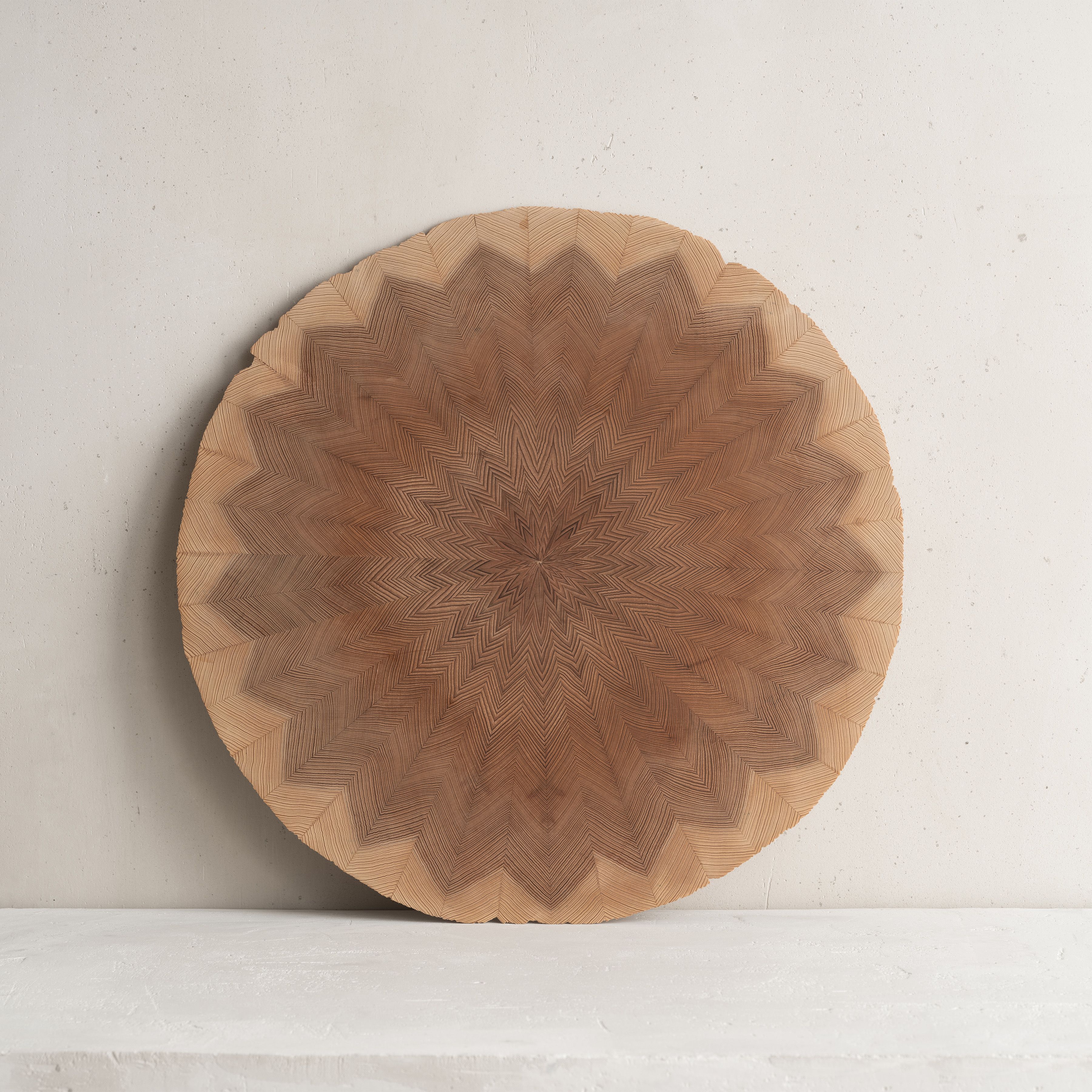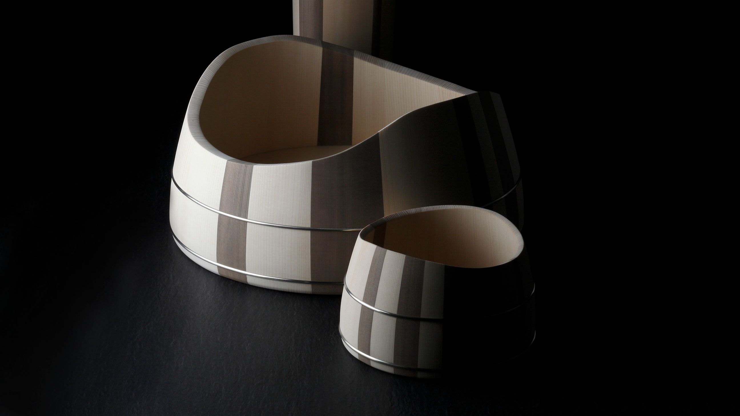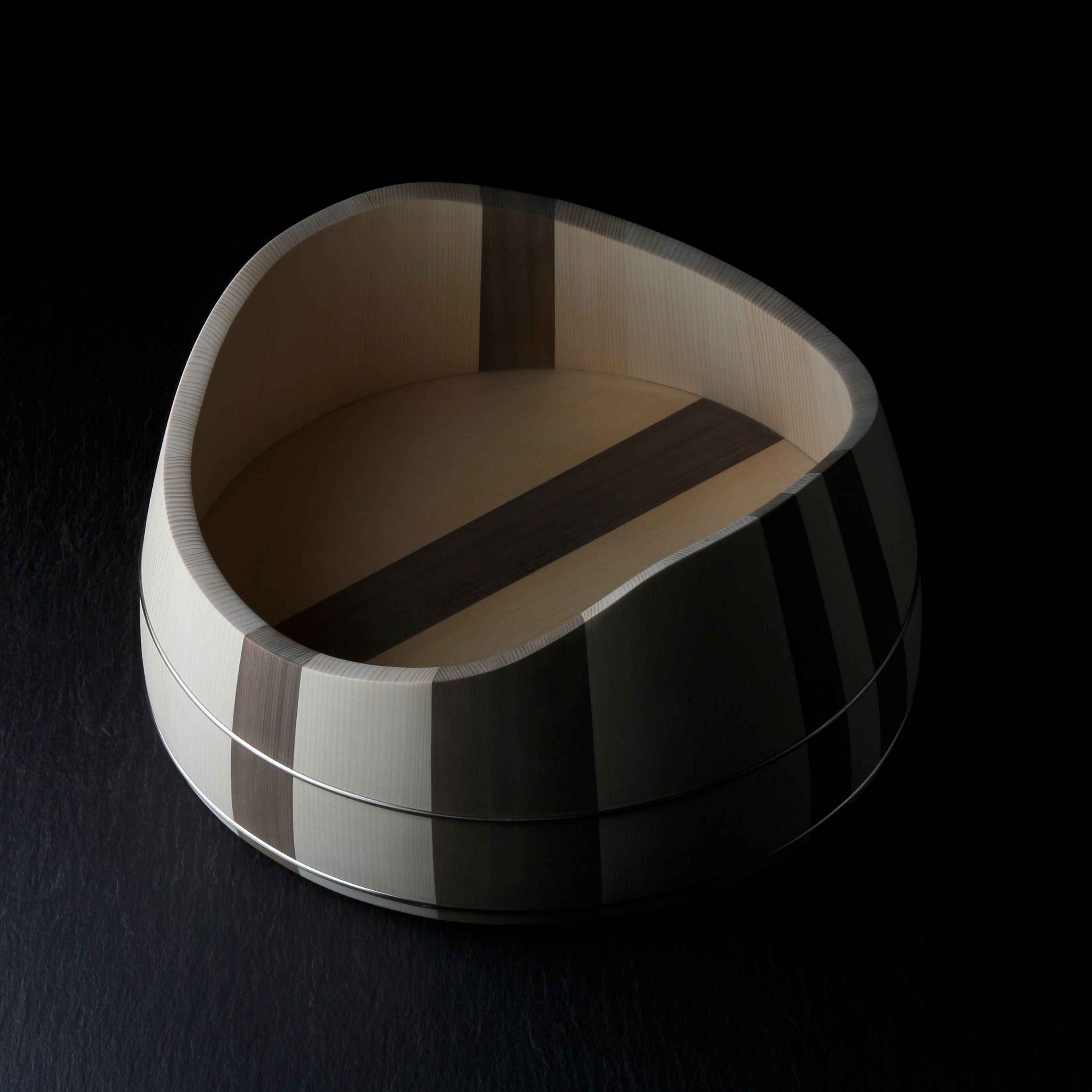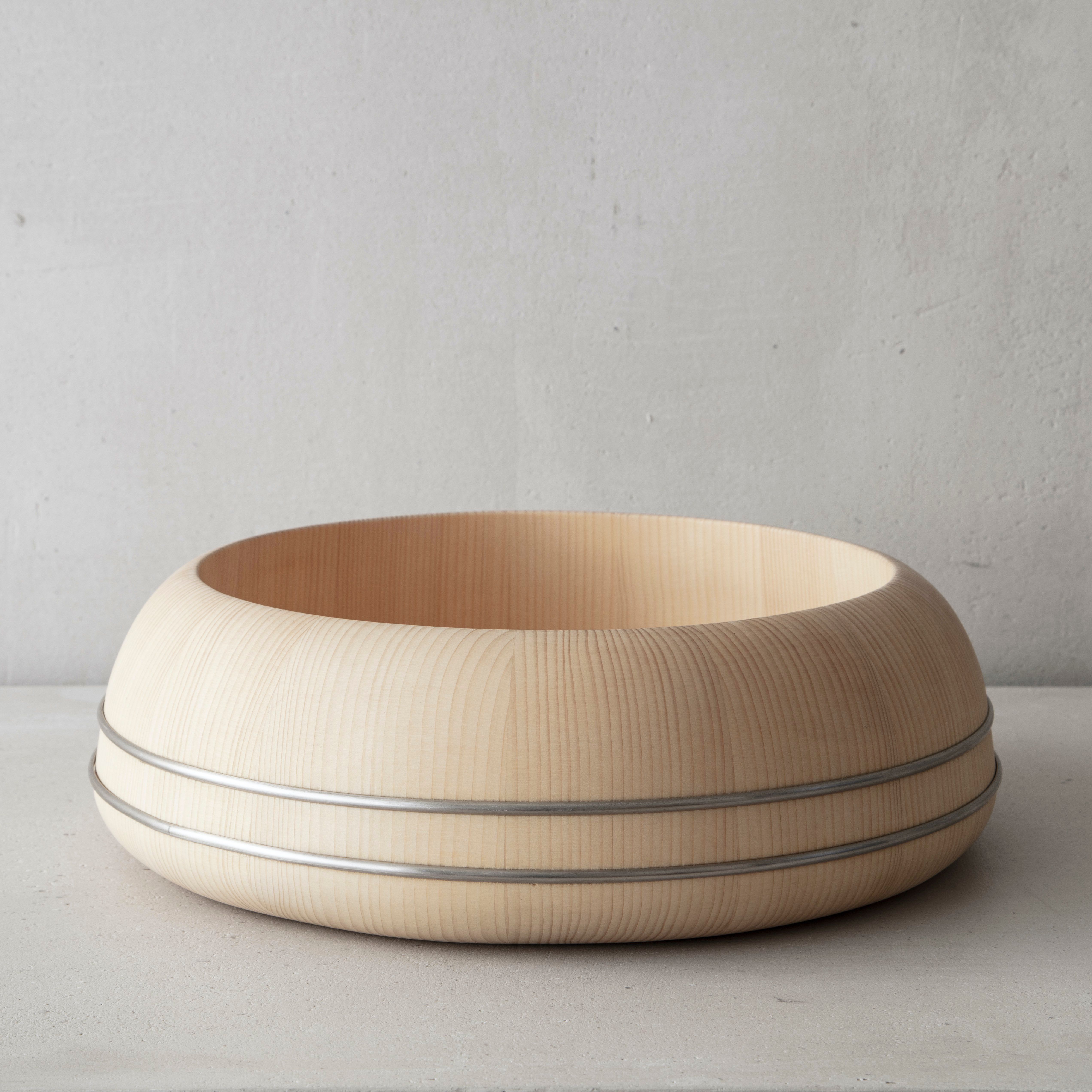 This piece results from the collaboration between Japanese wood crafter Shuji Nakagawa Mokkougei and Shigeo Mashiro of renowned Japanese design studio Sfera. Each piece integrates and juxtaposes two precious woods from Japan; Koya Maki (Japanese umbrella pine) and Jindai-sugi (2000-year-old lignified Japanese cedar).