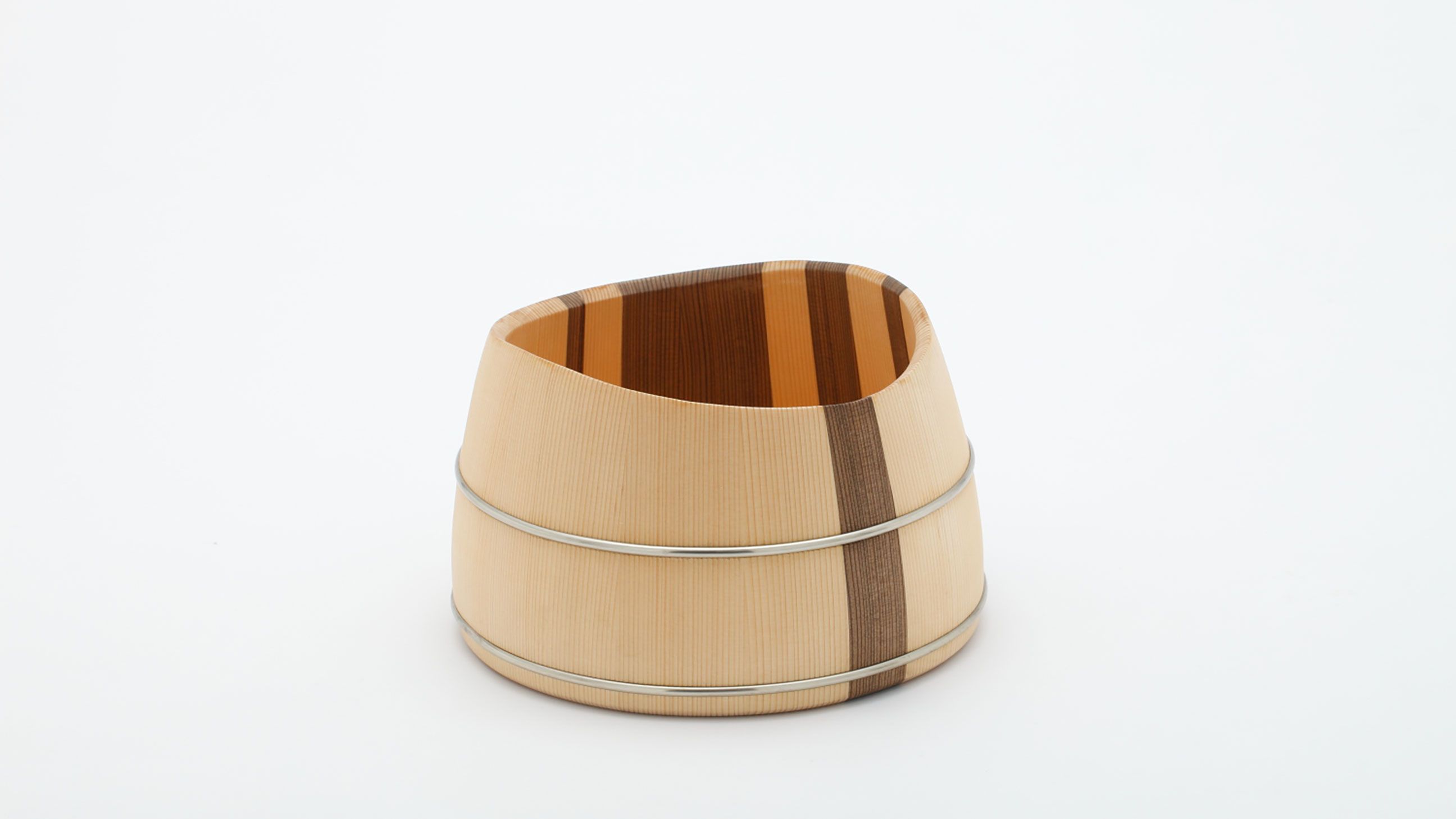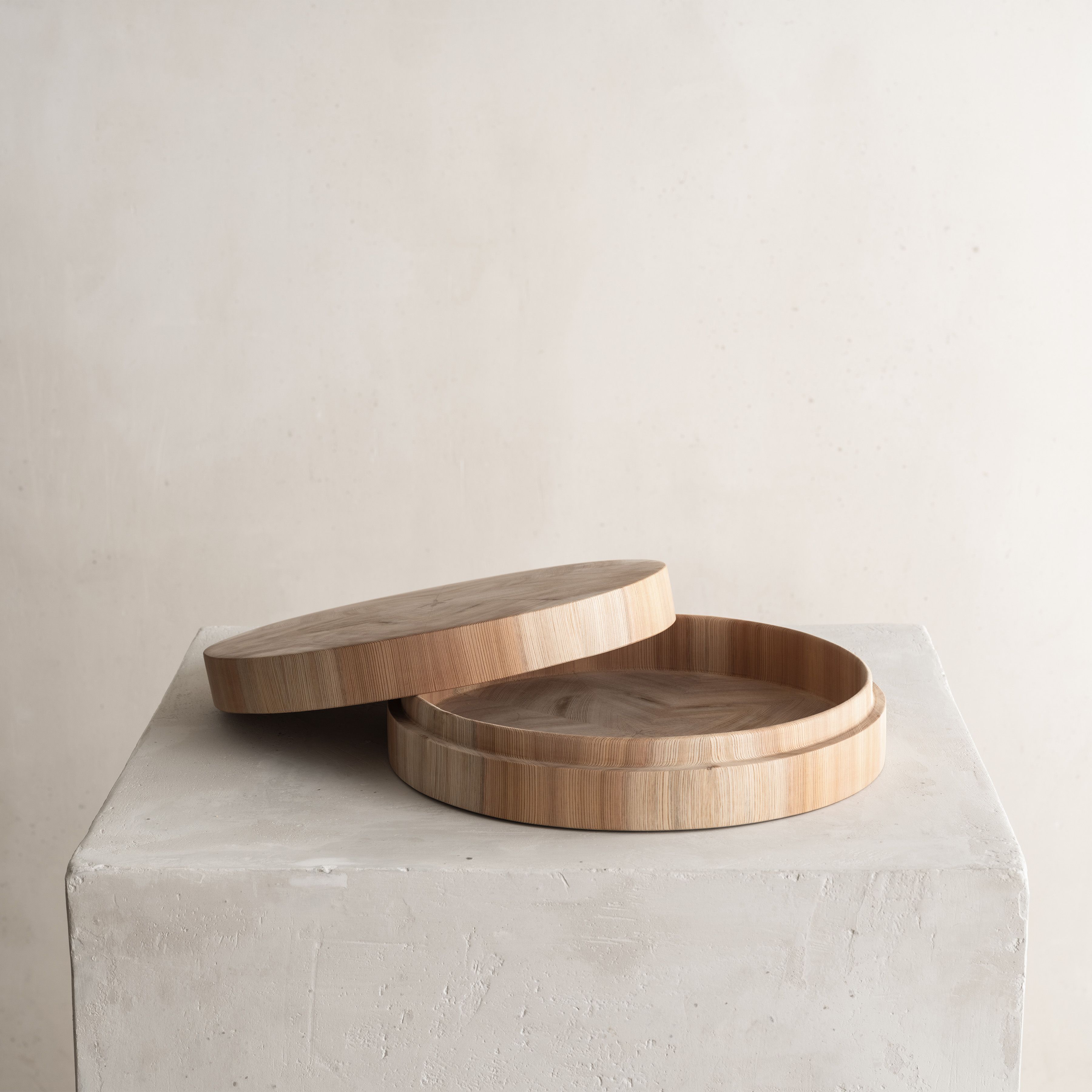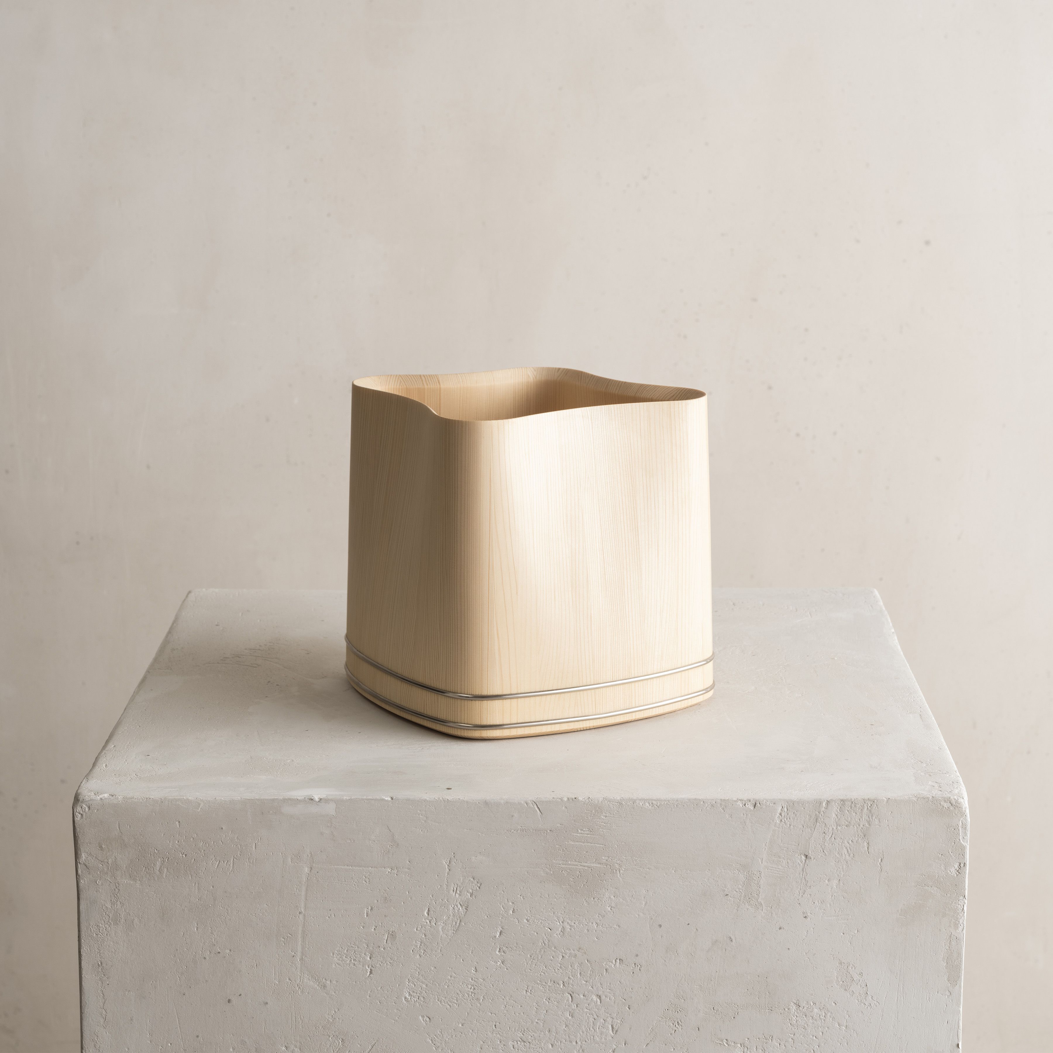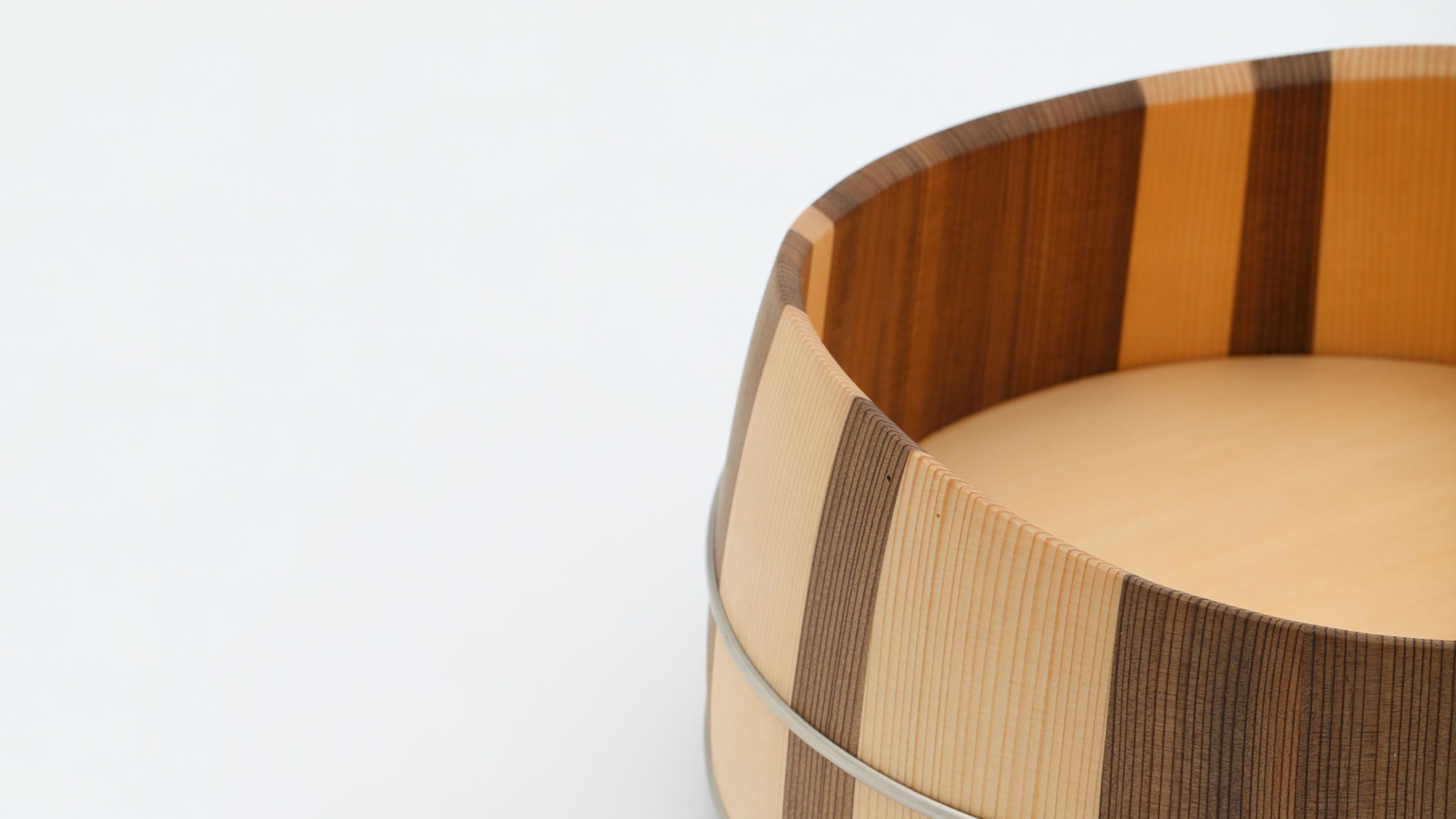This piece results from the collaboration between Japanese wood crafter Shuji Nakagawa Mokkougei and Shigeo Mashiro of renowned Japanese design studio Sfera. Each piece integrates and juxtaposes two precious woods from Japan; Koya Maki (Japanese umbrella pine) and Jindai-sugi (2000-year-old lignified Japanese cedar).