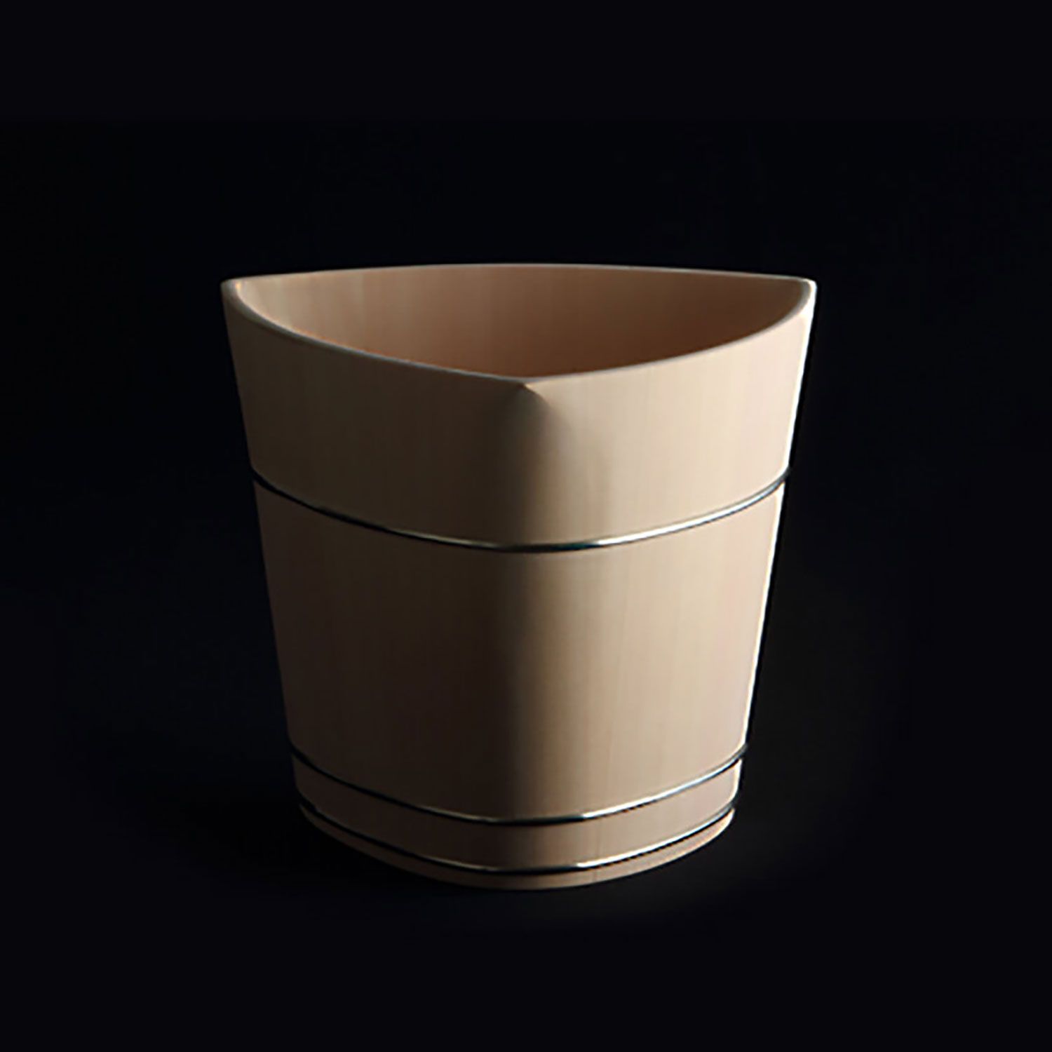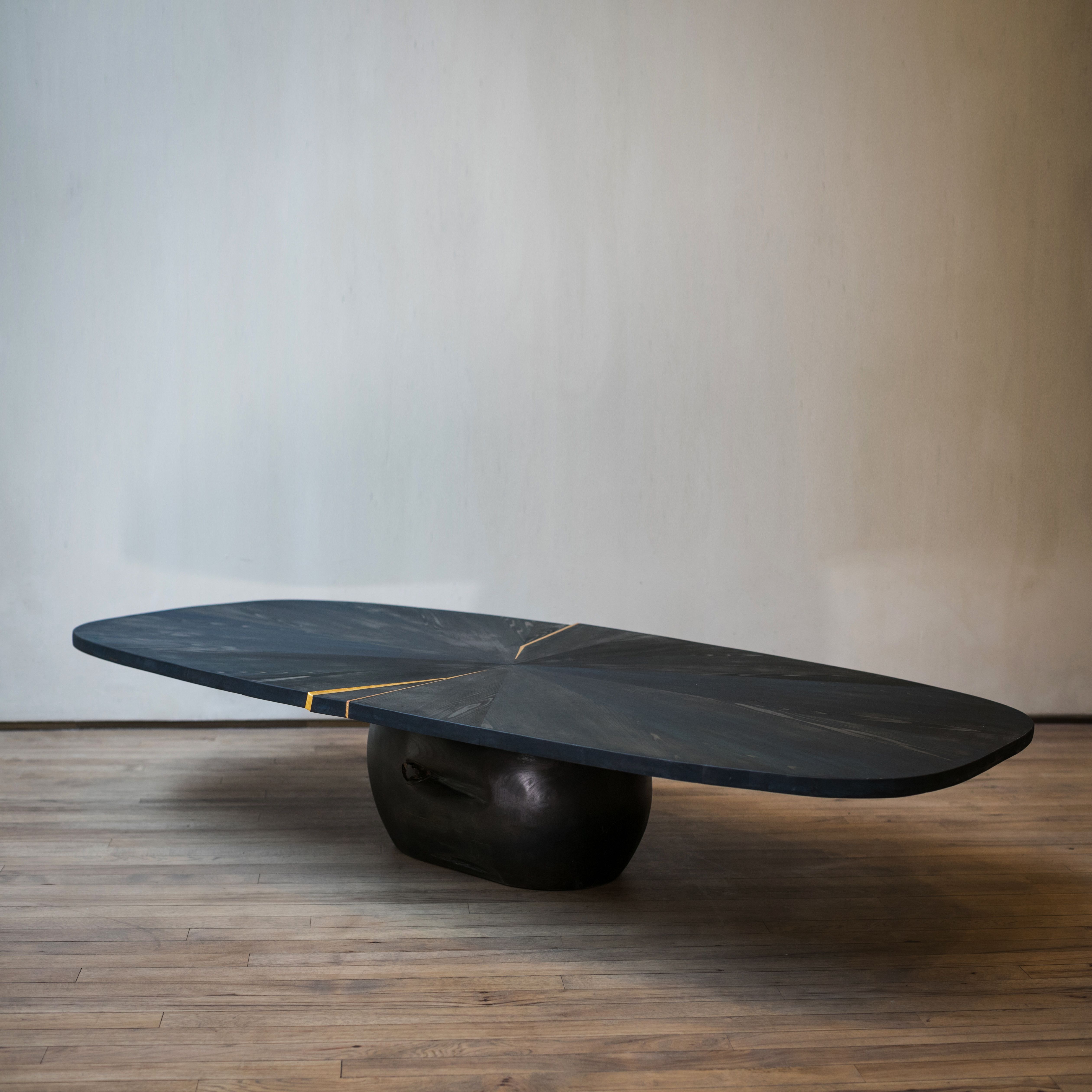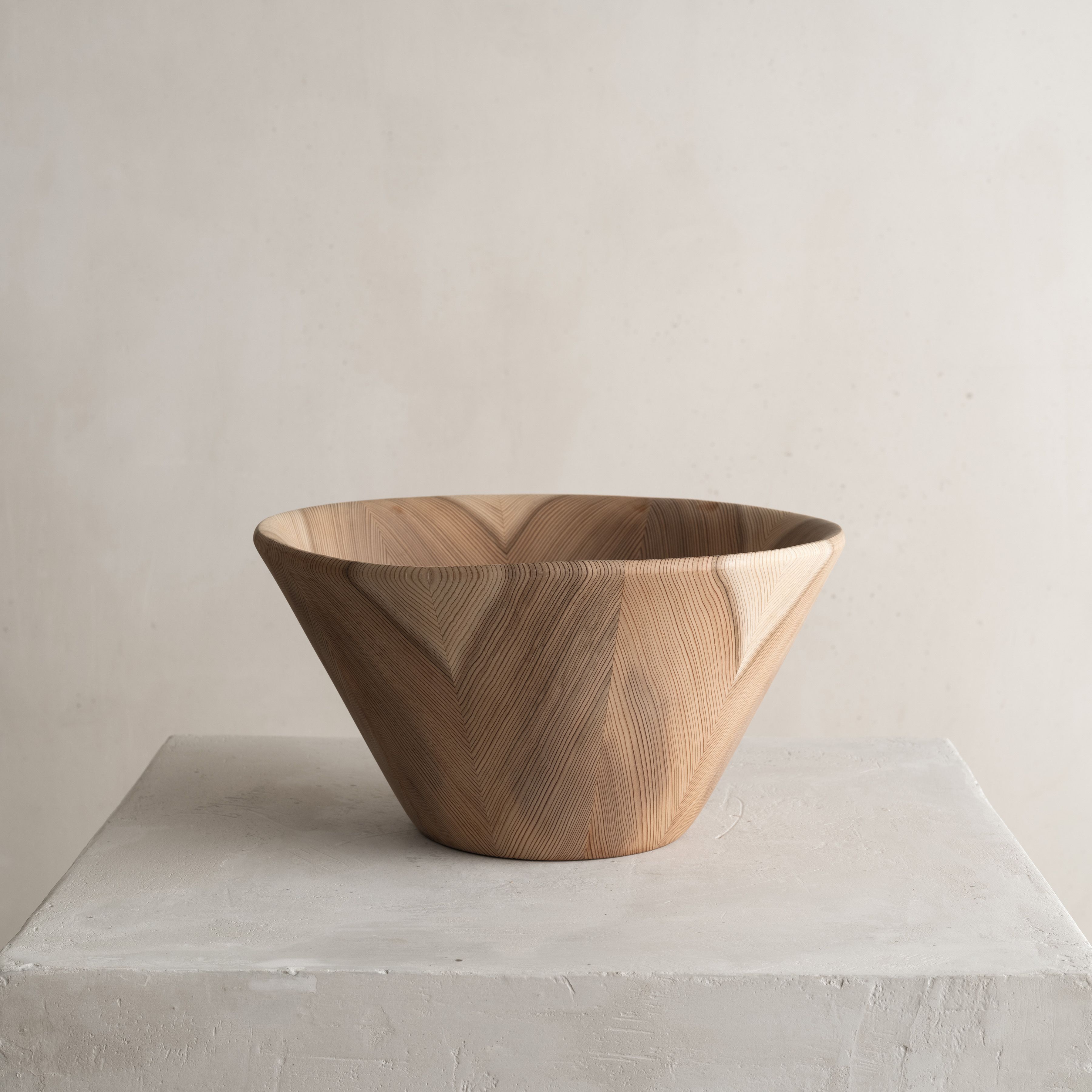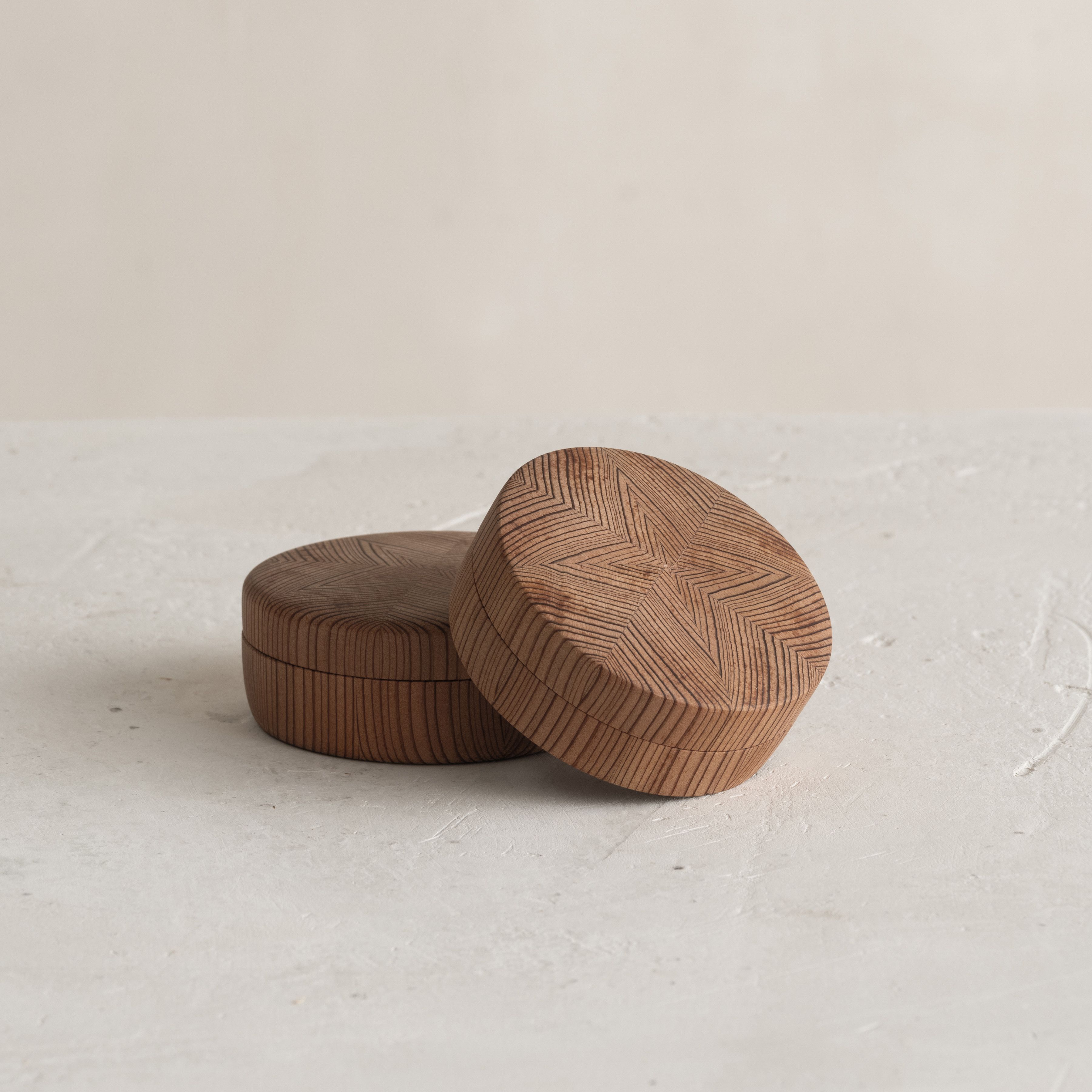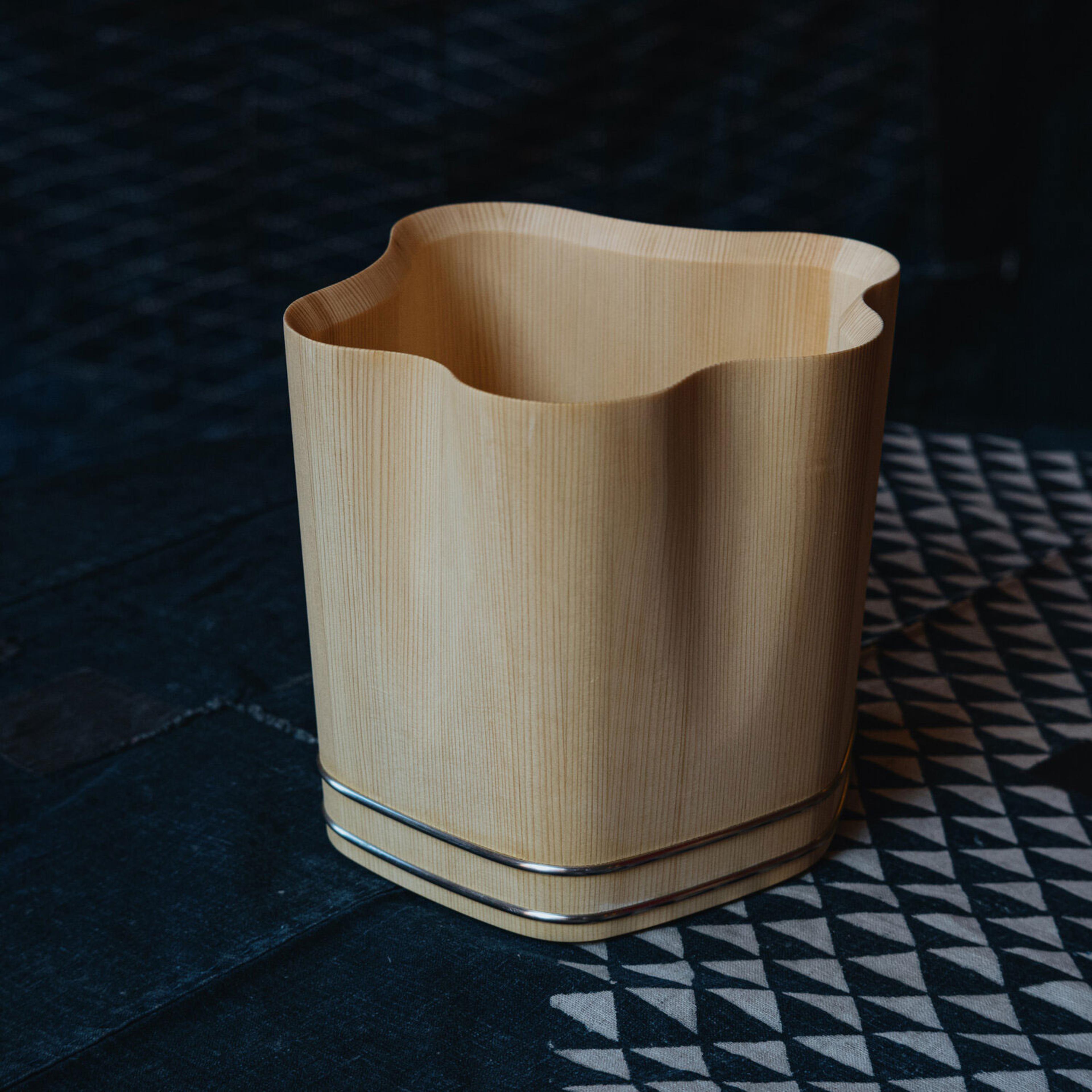 This piece results from the collaboration between Japanese wood crafter Shuji Nakagawa Mokkougei and Shigeo Mashiro of renowned Japanese design studio Sfera. Each piece integrates and juxtaposes two precious woods from Japan; Koya Maki (Japanese umbrella pine) and Jindai-sugi (2000-year-old lignified Japanese cedar).