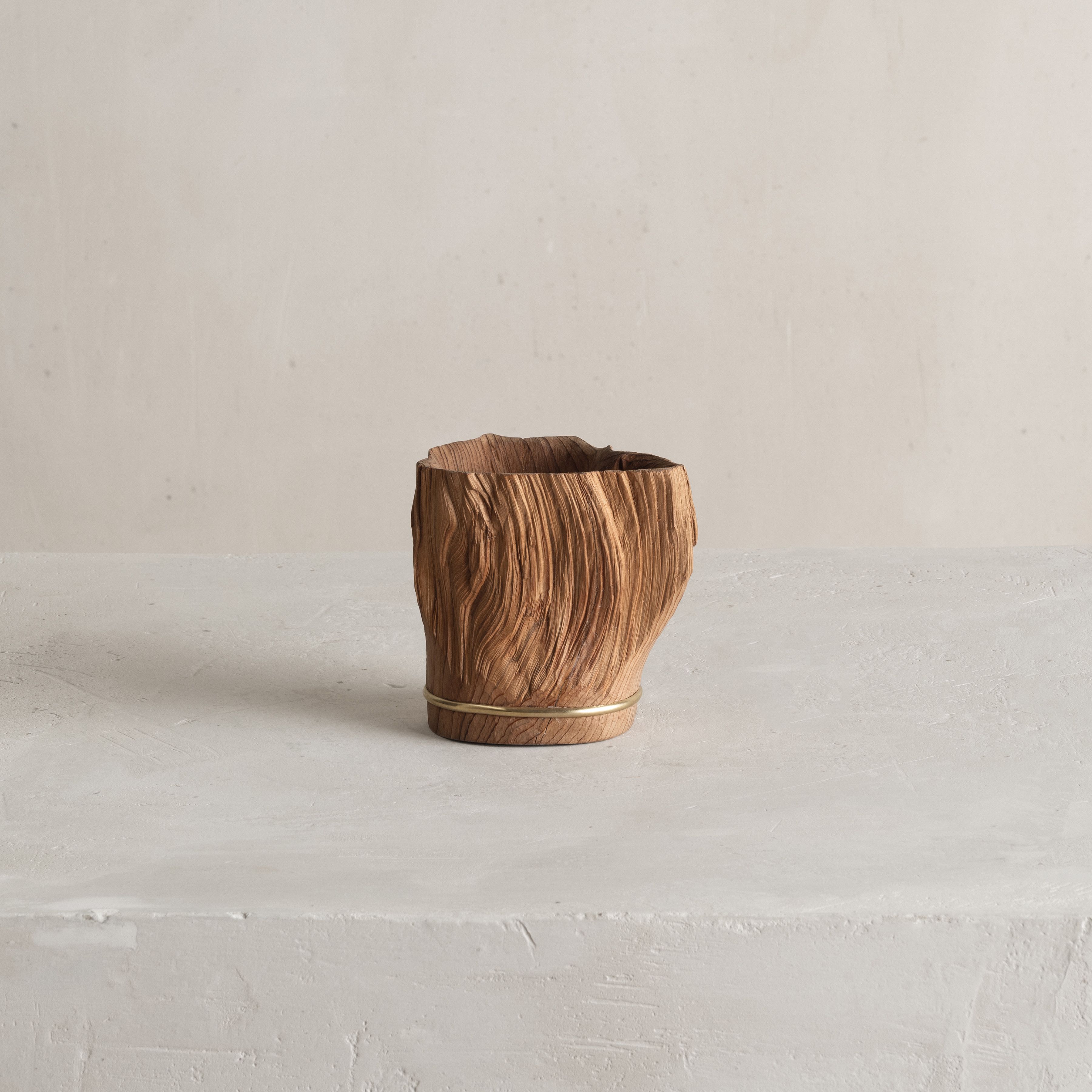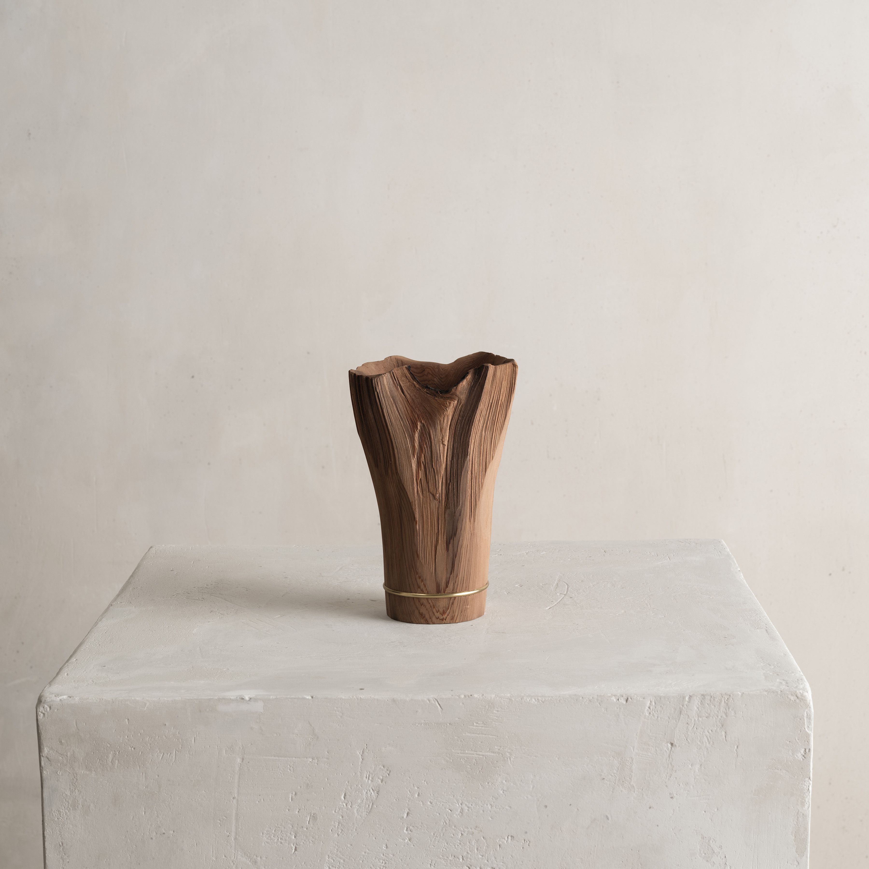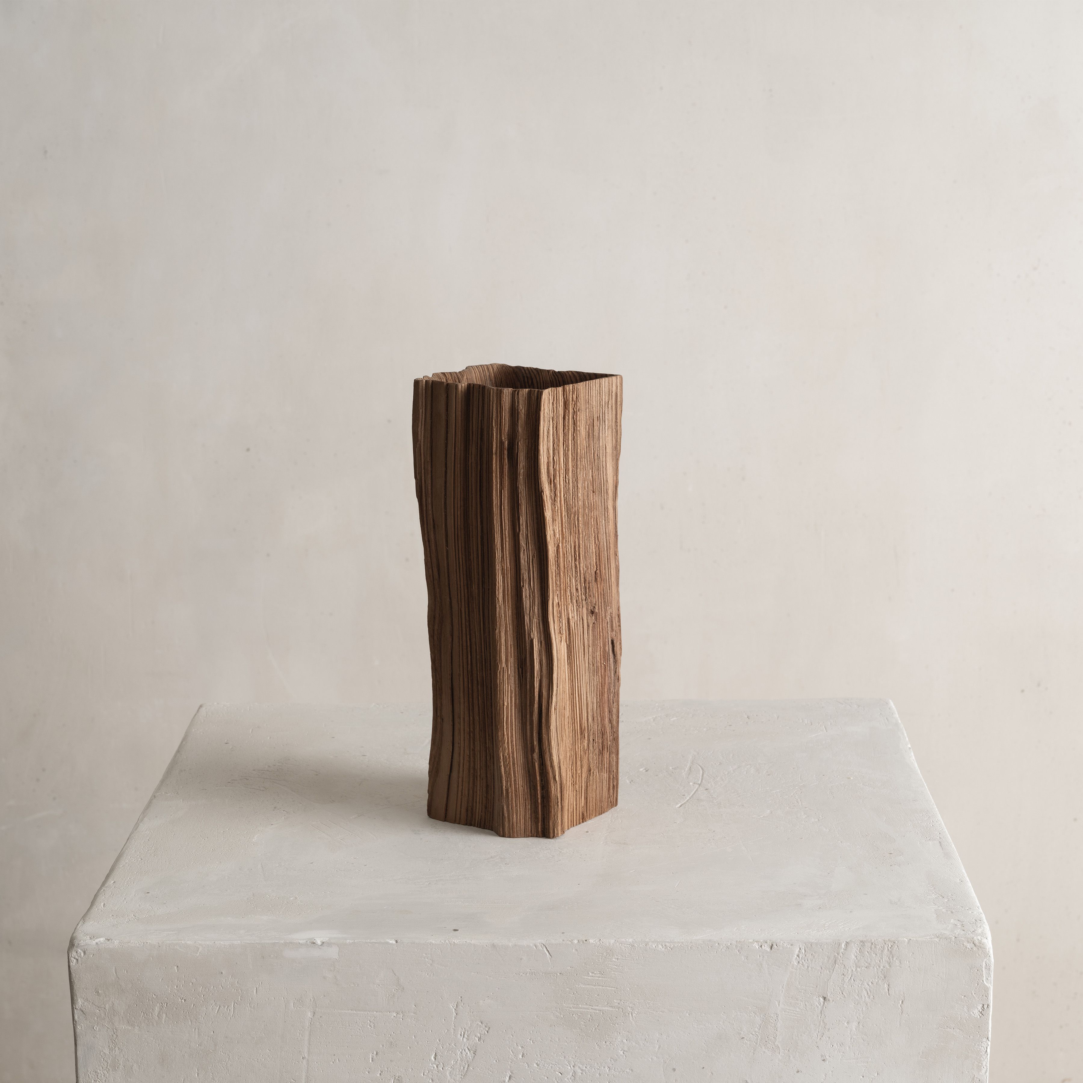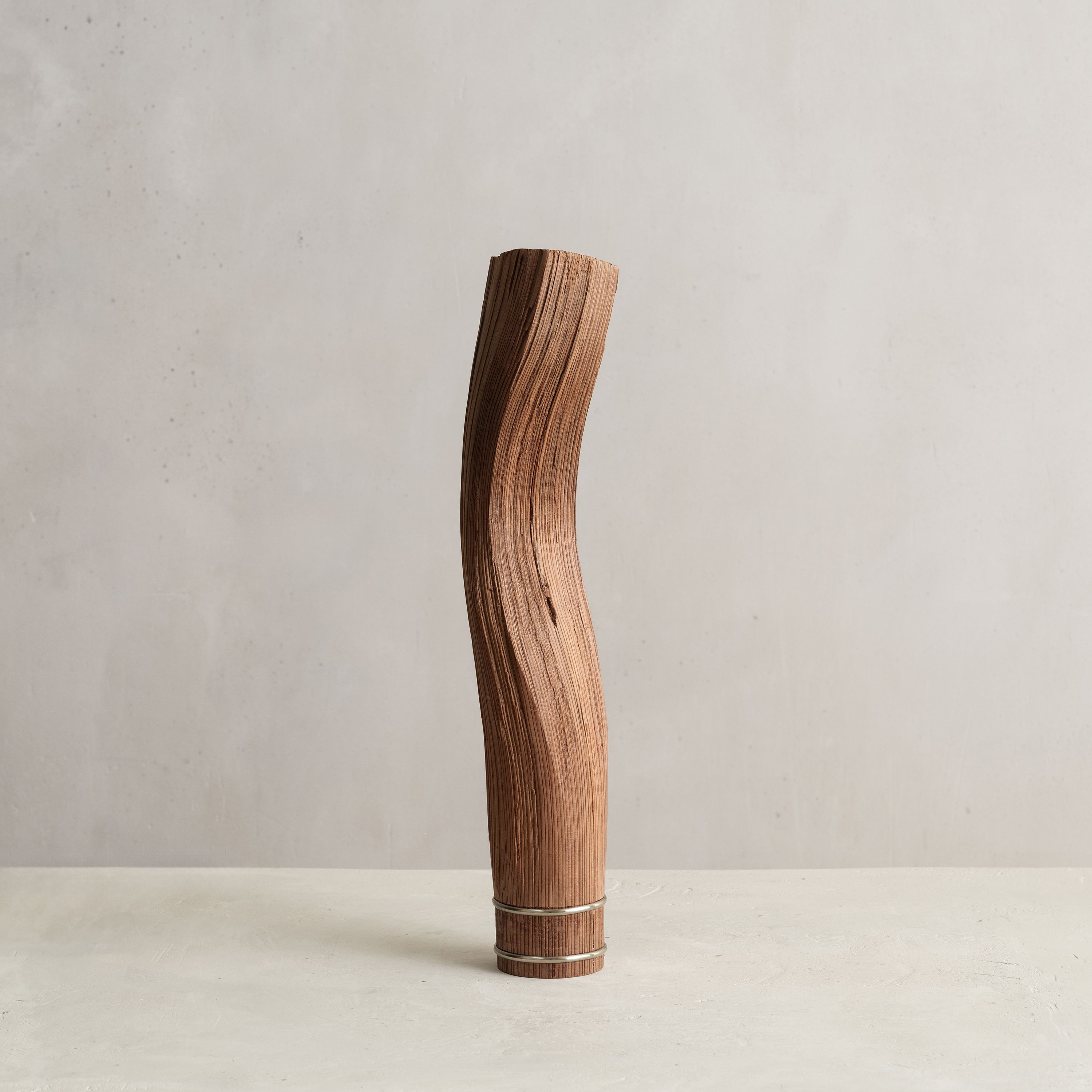 His entire body of work highlights the essence and natural beauty of various local wood species. Often the artist chooses to work with Jindai-Sugi — a Japanese cedar sourced from Northern Japan's forests that symbolizes the interconnectedness of humanity and the natural world. Its weathered bark and intricate patterns evoke a sense of harmony where the passage of time is celebrated rather than feared.