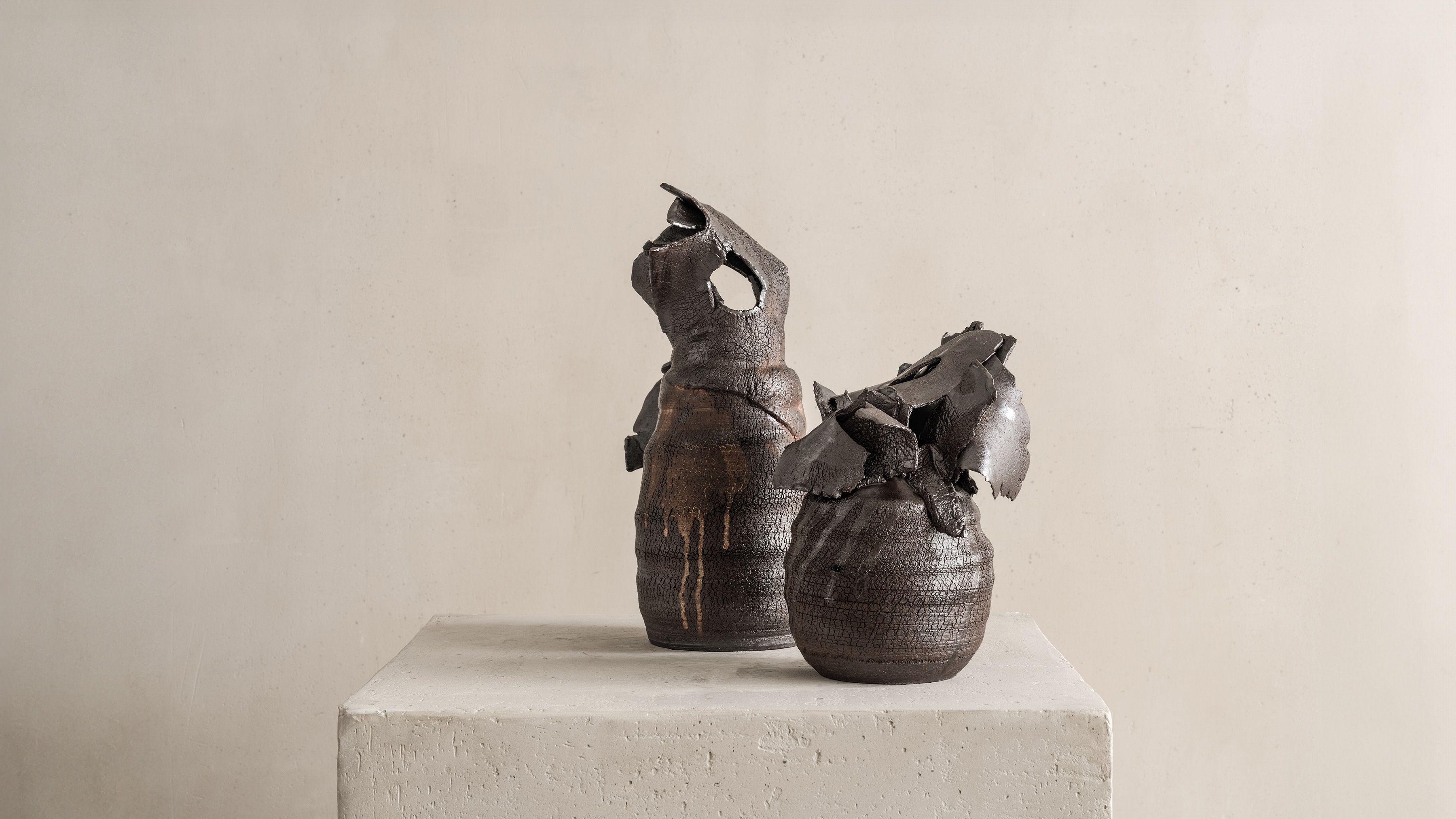 Greek American artist Peter Speliopoulos' most recent series Livani, marks his first foray into traditional wood-firing techniques. Utilizing ancient stoneware clay chosen for its unique properties at high temperatures, these pieces were fired in a Japanese Noborigama kiln through a rigorous two-day process of continuous wood feeding by a team of twelve people in synchronized shifts, followed by a five-day cooling period. The results highlight the transformative power of flame, with each piece internally glazed in Tenmoku and minimally treated exteriors that allowed direct interaction between clay and fire. The artist embraced the serendipitous effects and interplay with the natural element of fire and enabled its unpredictable nature to dictate the vessels' colors, surfaces, and luminosity.