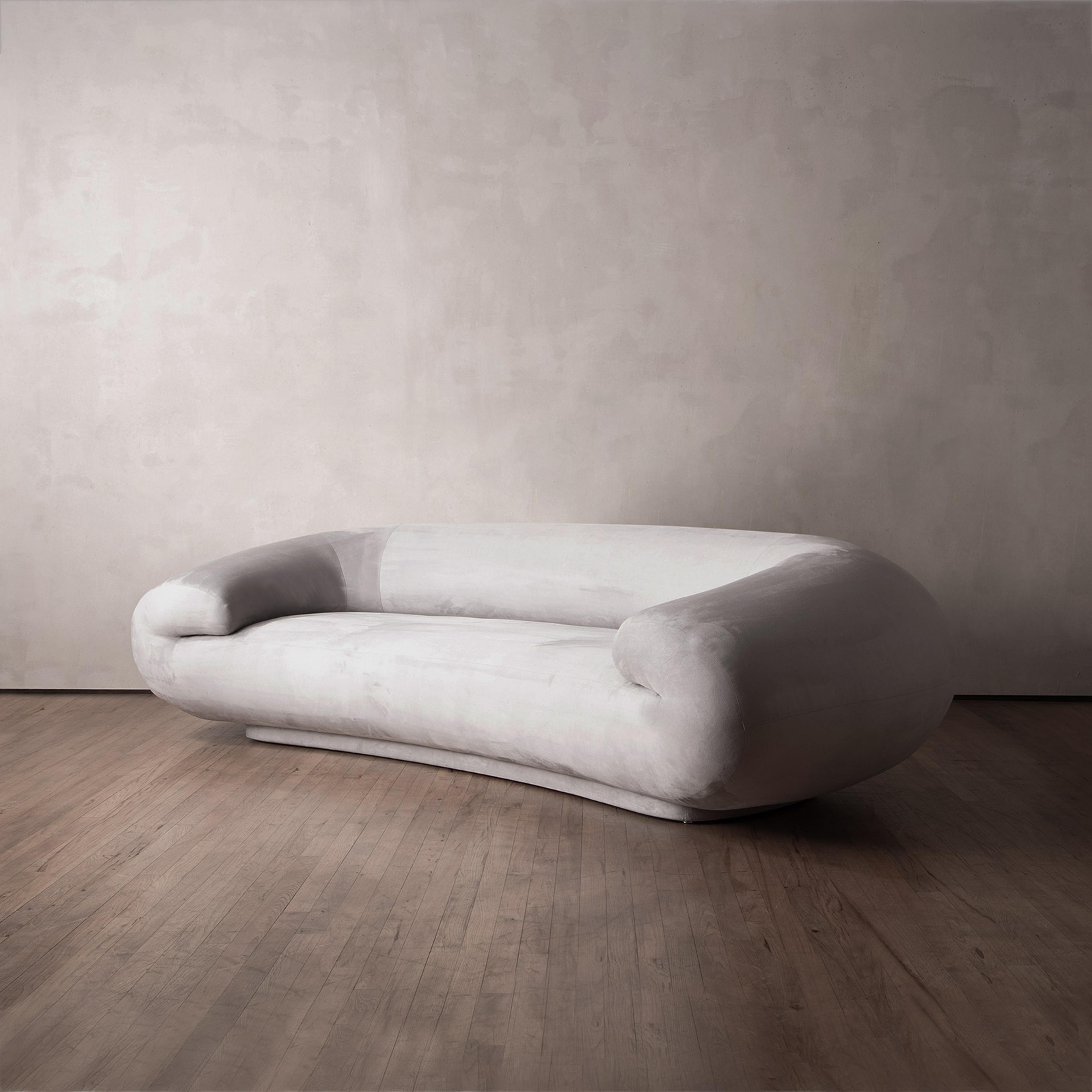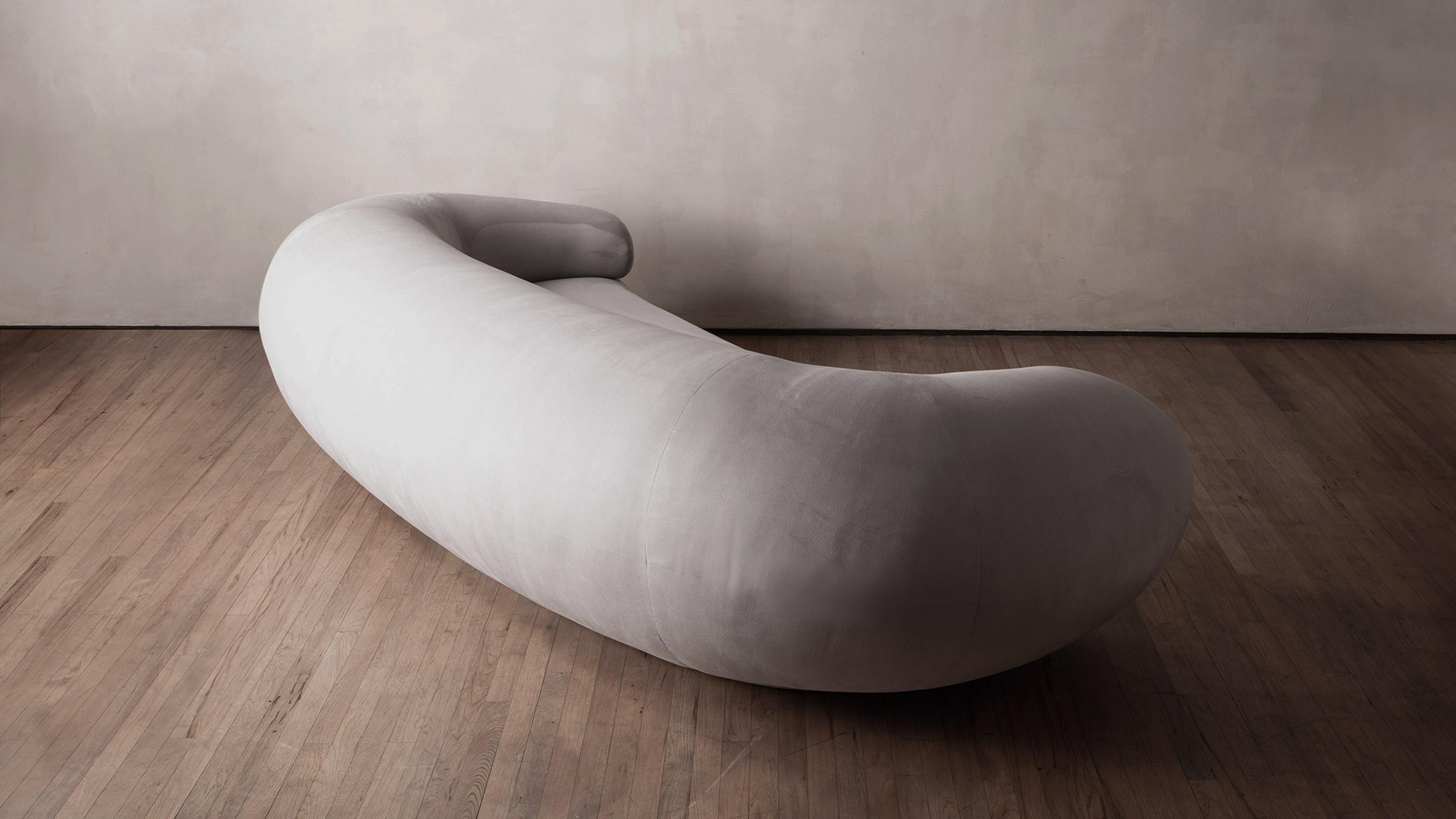 The Fold sofa results from the Editions Courbet program and the collaboration between master upholsterers Phelipeau, Ateliers Jouffres, and the artist Pieter Maes. The piece embodies both the artisans' dexterity and Maes' design vocabulary; A modern take on timeless, archetypal forms executed with time-honored techniques. Maes draws inspiration from the elegant simplicity of monolithic shapes found in the Neolithic and Cycladic Art forms, as well as in the works of 20th-century artists and sculptors.