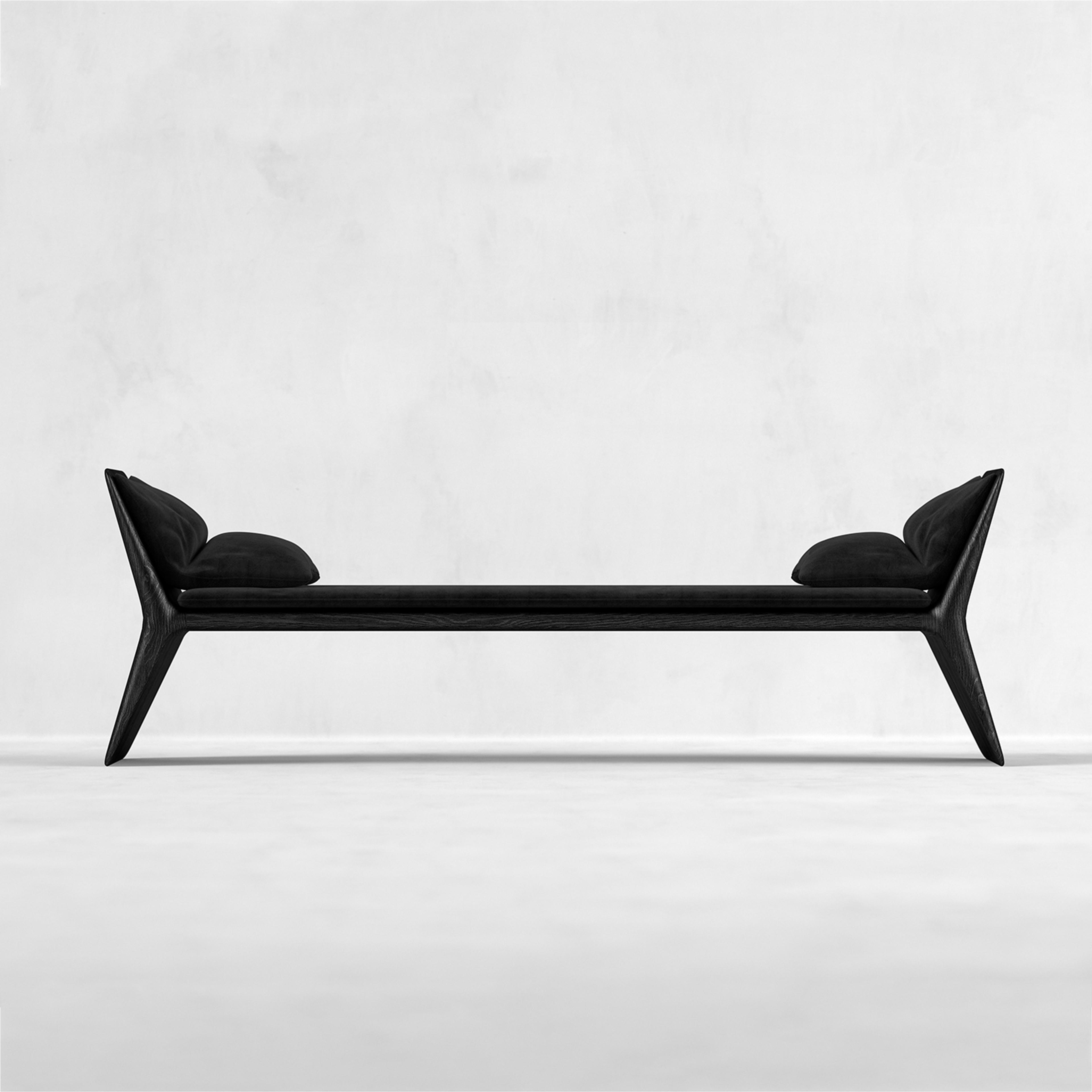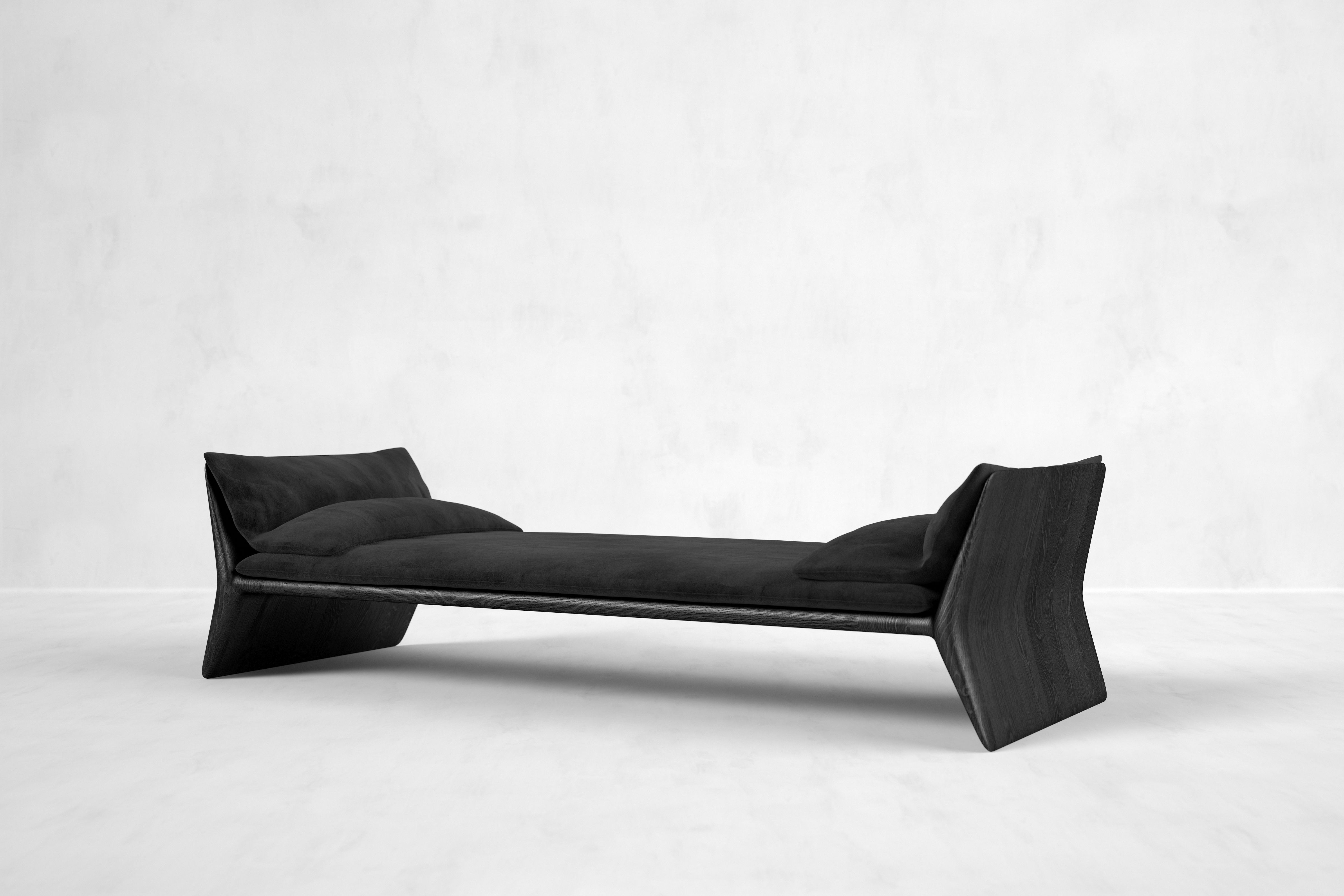 The Palindrome daybed results from the Editions Courbet program and the collaboration between master woodcrafter Rutger Graas, master upholsterers Atelier Phelipeau and Jouffres, and the artist Pieter Maes. The piece embodies both the artisans' dexterity and Maes' design vocabulary; A modern take on timeless, archetypal forms executed with time-honored techniques. Maes draws inspiration from the elegant simplicity of monolithic shapes found in the Neolithic and Cycladic Art forms, as well as in the works of 20th-century artists and sculptors.