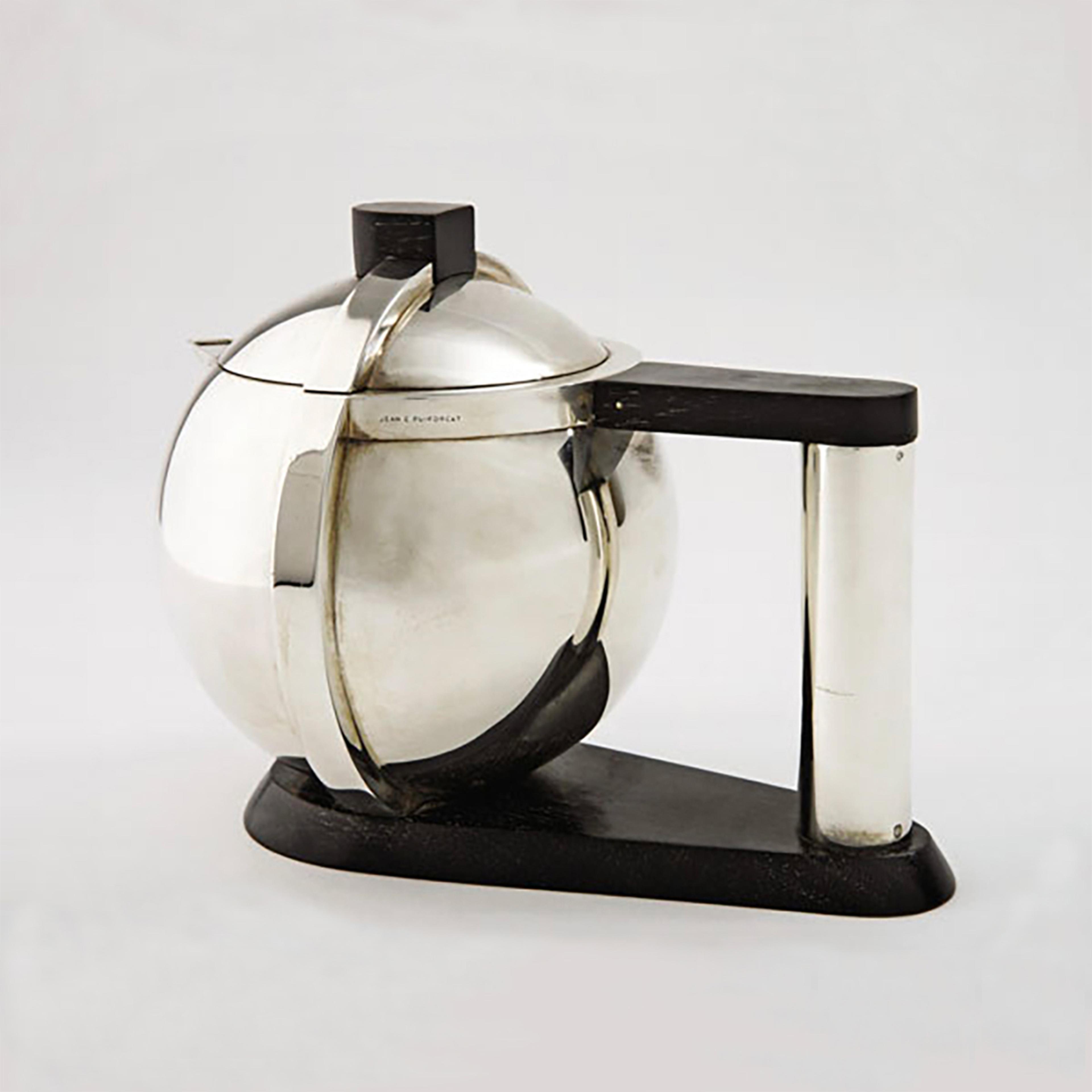 Designed by Jean Elysee Puiforcat in 1928, this set is a nod to his favorite geometrical shape: the sphere. The design evolves around the pure form of a perfect sphere contrasted with straight edges and lines balancing the piece in a studied way so it is both functional and esthetically pleasing. His original design only translated into the two-cup teapot, which has since been revisited by the workshop. It has now evolved into a complete service set that includes a two-cup coffee pot, a six-cup teapot, a creamer, and a sugar bowl.
