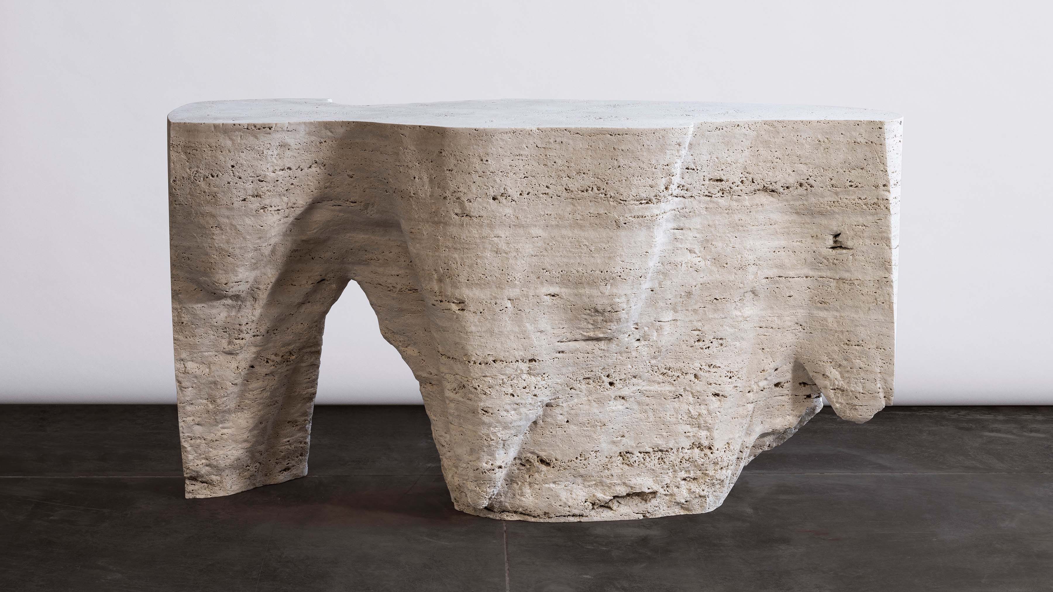 This piece belongs to the Topographic Memories series by designer Raphael Navot and the master-craftsmen of Les Ateliers Saint Jacques as part of the Editions Courbet program. For this capsule collection, Navot draws inspiration both from the material's personality and the time-honored techniques carried on by the Ateliers Saint Jacques master craftsmen. Resulting from a three-year-long collaboration between Courbet, Raphael Navot, and Les Ateliers Saint-Jacques, the collection is informed by Navot’s design vocabulary and his longstanding fascination for traditional crafts, raw materials, their essence, and their stories. Whether carved in stone or cast in bronze, each piece is a sculptural interpretation of topographic landscapes with emphasized details and textures that highlight the artisans’ dexterity.