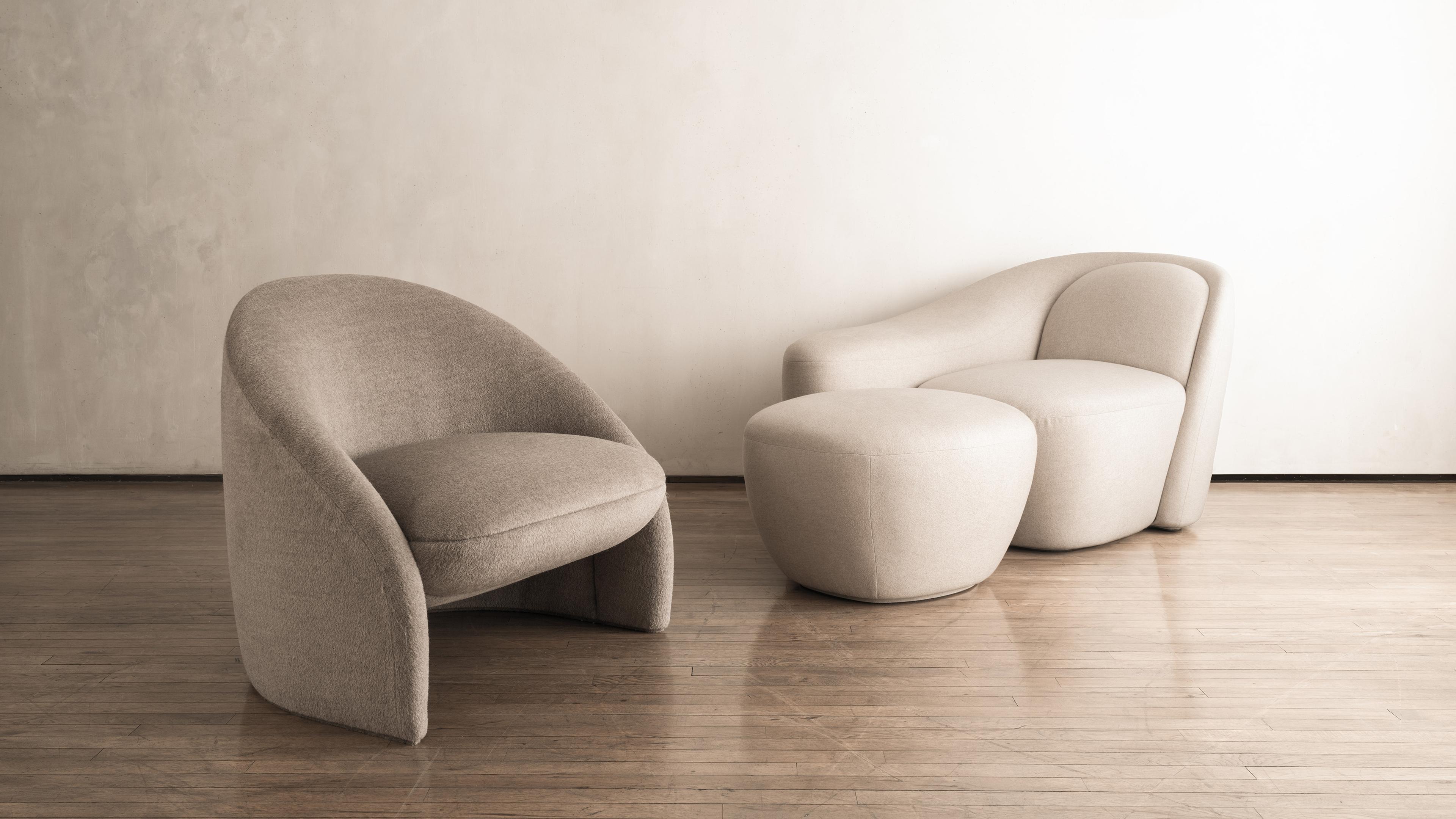 A sculpture, an armchair, a loveseat, or a contemporary interpretation of the traditional chaise lounge. Inspired by the palm of a hand, its pure lines follow a spiral movement with no interruptions and no angles, a feat achieved by esteemed upholsters. Navot's sinuous design language, as can be found in his Moon Sofa, coupled with the precise handiwork of the upholstery result in a work of elegant simplicity.