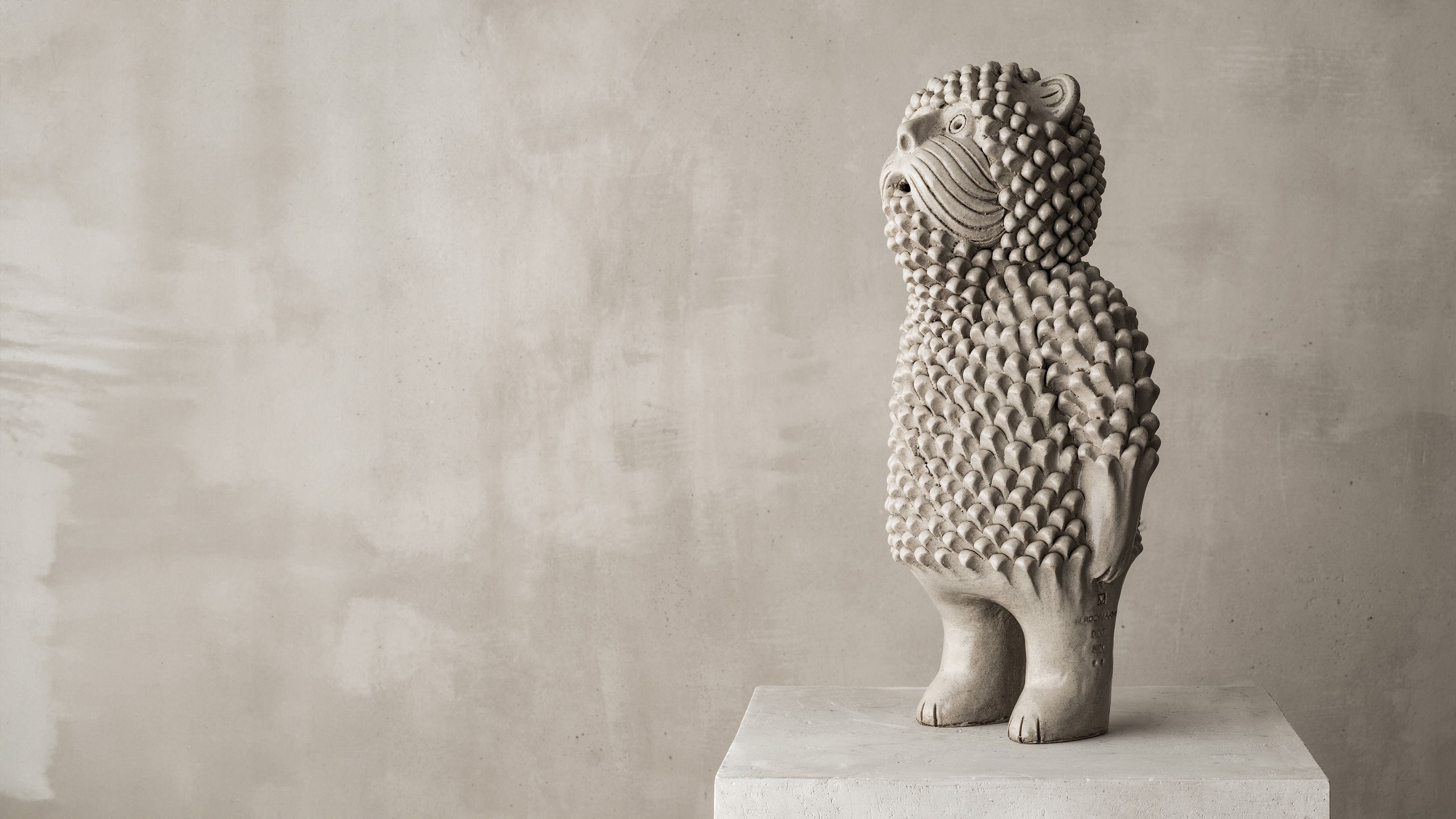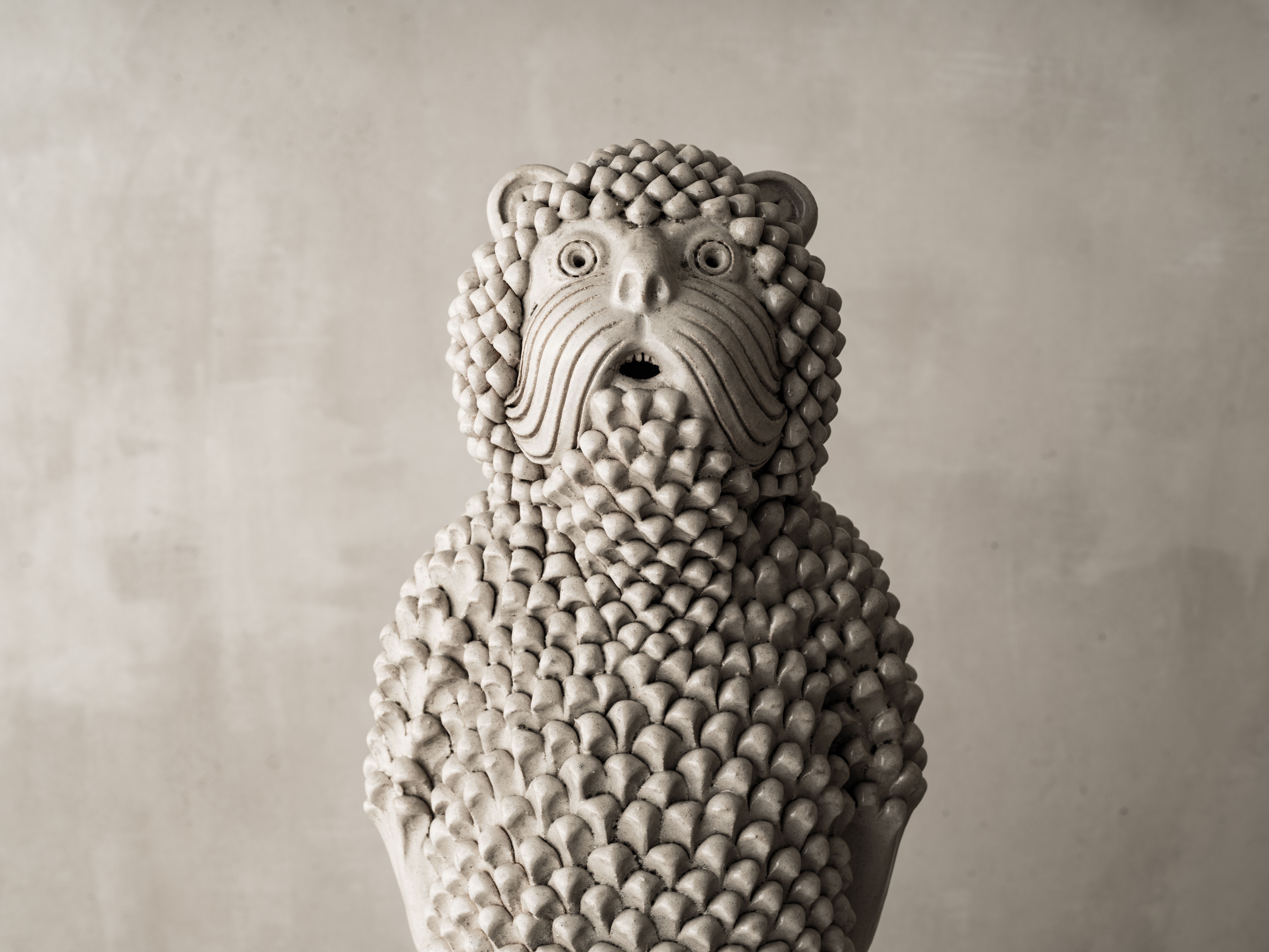 Mykhas belongs to Ukrainian artist-ceramicist Serhii Makhno’s comprehensive DIDO family of unique, imaginary characters, each handcrafted in Kyiv by the artist and his team of master ceramicists. Makhno, whose work is deeply rooted in his in his native country’s cultural heritage, draws inspiration from the folkloric clay animals his grandmother helped him collect as a child and the tales and symbols they embodied.The Didos are the artist’s whimsical, contemporary interpretations of the elf-like figures found in Ukrainian legends and traditional artifacts. Said to be lucky charms or protective spirits, these mythical beings are believed to dwell in the attics or cellars of the homes they choose to guard, offering good omens to their inhabitants.