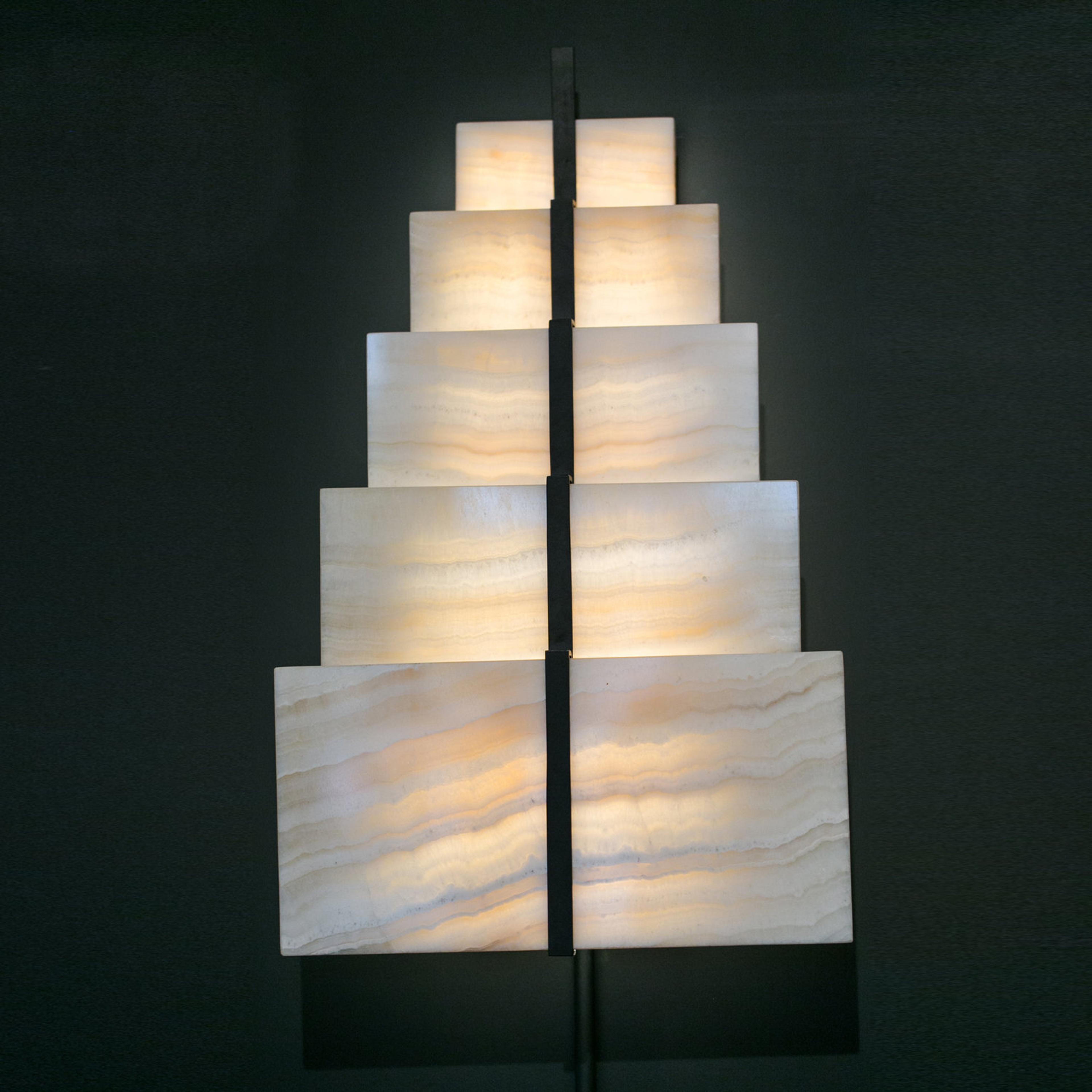 Inspired by the artist's site-specific commission on the facade of a building on 52nd Street in New York, Dreyfus created Lamp 52nd. The light plays with the translucence of luxurious “crystal” stones from Turkey. The piece is made in two editions in two different materials, each of which is limited to 10 pieces + 2 AP. “I was commissioned to create and design a permanent light art installation on the facade of the 52nd Street building by the owner and developer who transformed this hotel into private luxury apartments and offices. A vertical light stripe as a vein in the center of the building, settled from its top to almost bottom, will softly light its surroundings, each night. Warm and peaceful light will appear and disappear as if the building was breathing, in a quiet mood, opposite of the urban restless rhythm. Inspired from this installation and the architectural shape of the building, we have imagined a wall-lamp refining the lines & shapes and replacing the glass with onyx or white marble.”