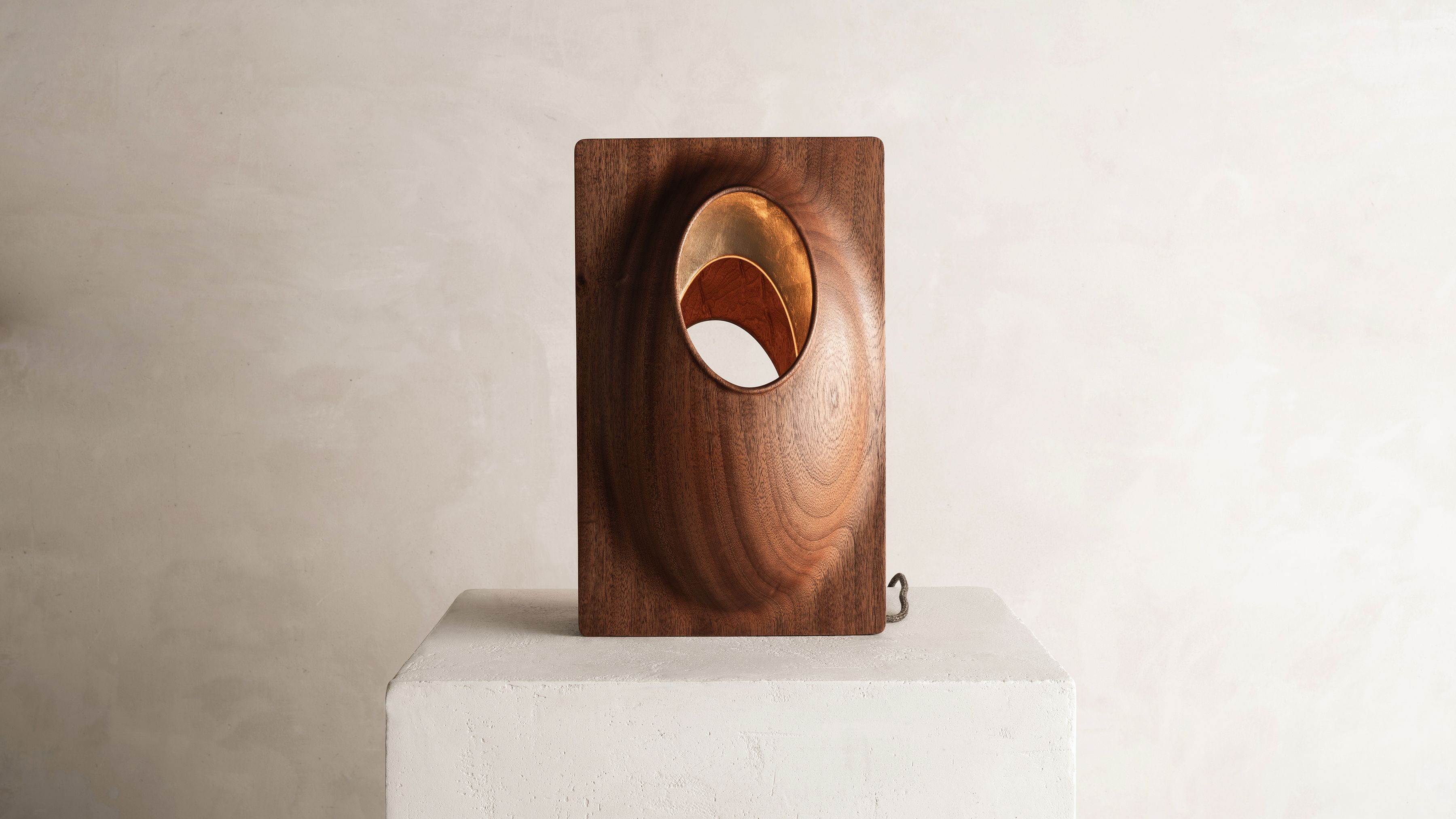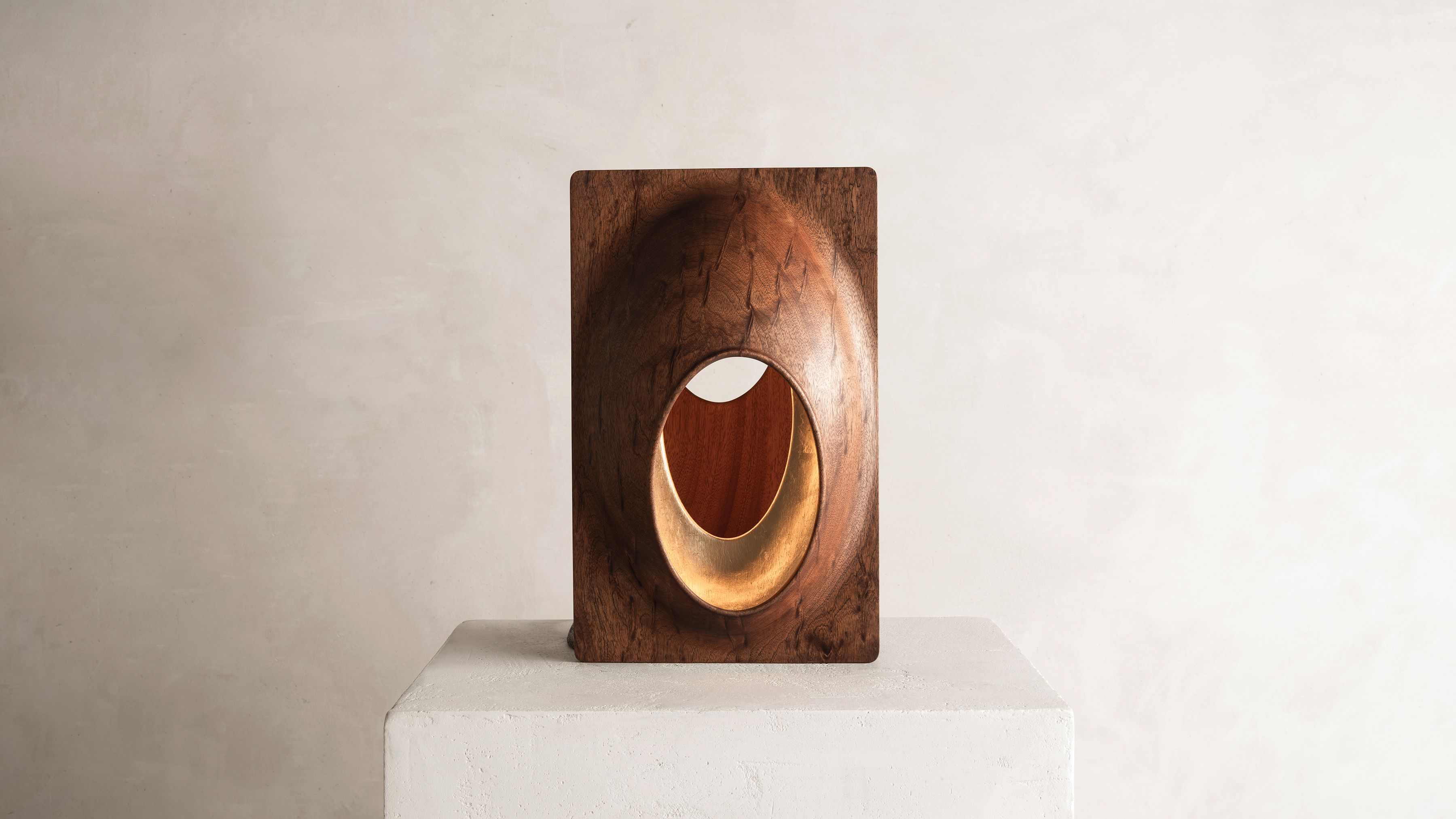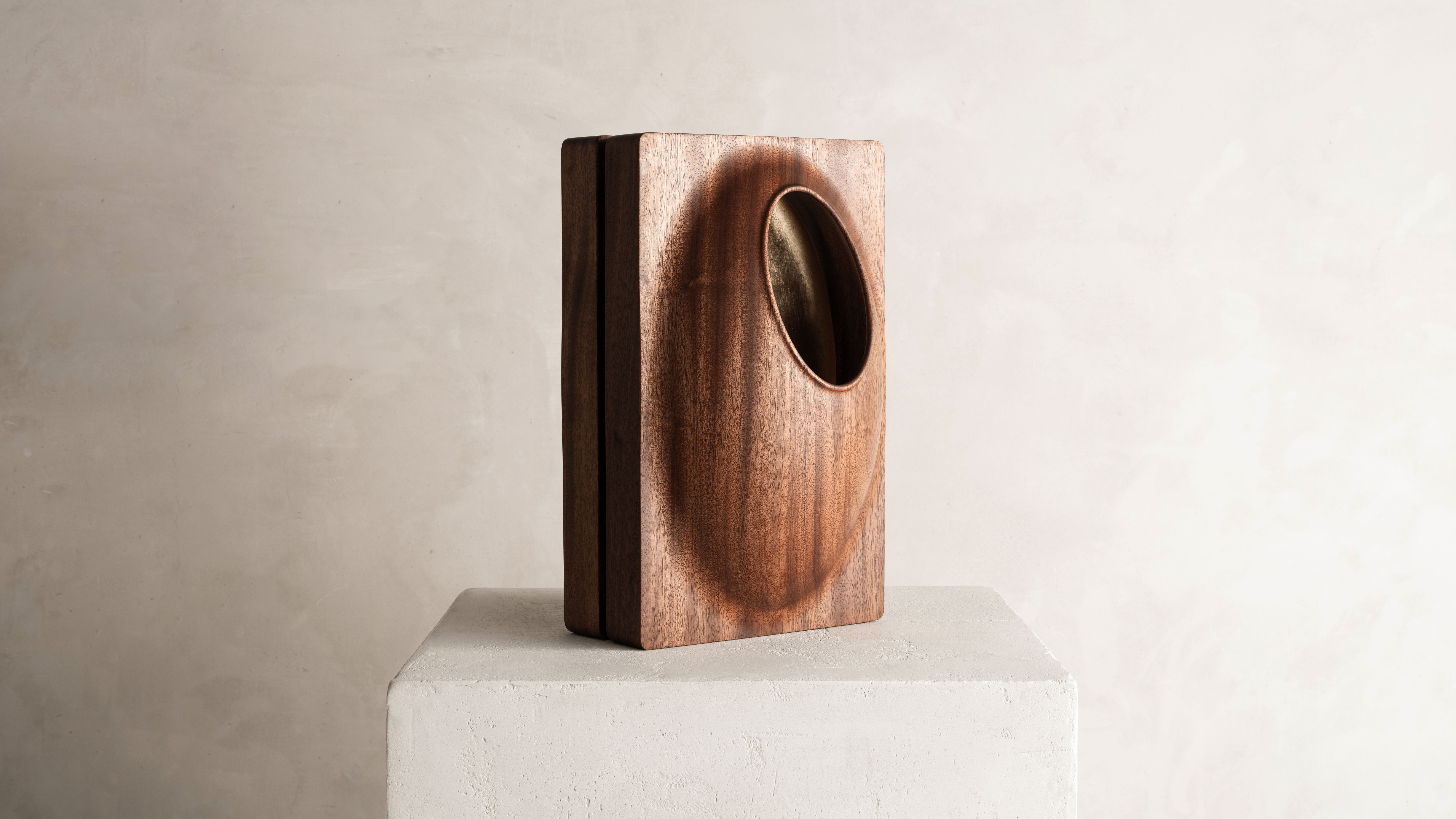 This sculptural light piece by Thierry Dreyfus draws inspiration from the beautiful simplicity and abstract, organic sensuality found in the works of an artist he has long admired, Brancusi. Soft curves carved in solid walnut open up to a 24K gold leaf-gilded womb from which the light emanates. Lamp J edition is part of Thierry Dreyfus' "Objets de Lumiére" catalogue. Conceived in 2020, the piece expands on the artist’s significant body of work and his continuous explorations of light as an ethereal medium allowing sensorial experiences to trigger our thoughts and emotions. Whether exemplified in his monumental public art installations or the ephemeral experiences of his scenography commissions, Dreyfus’s work seems rooted in the dialectic between creating light and creating with light.
