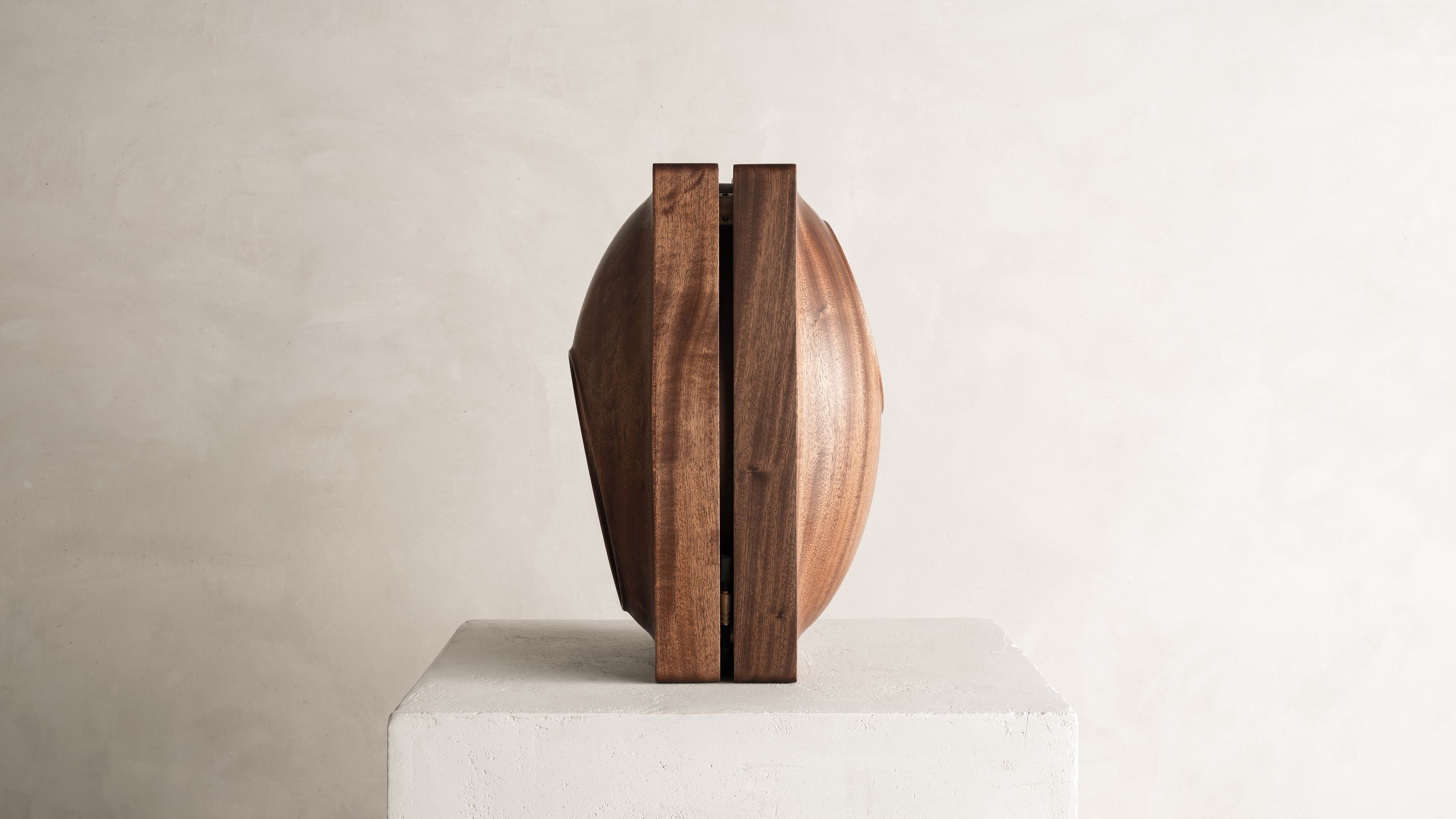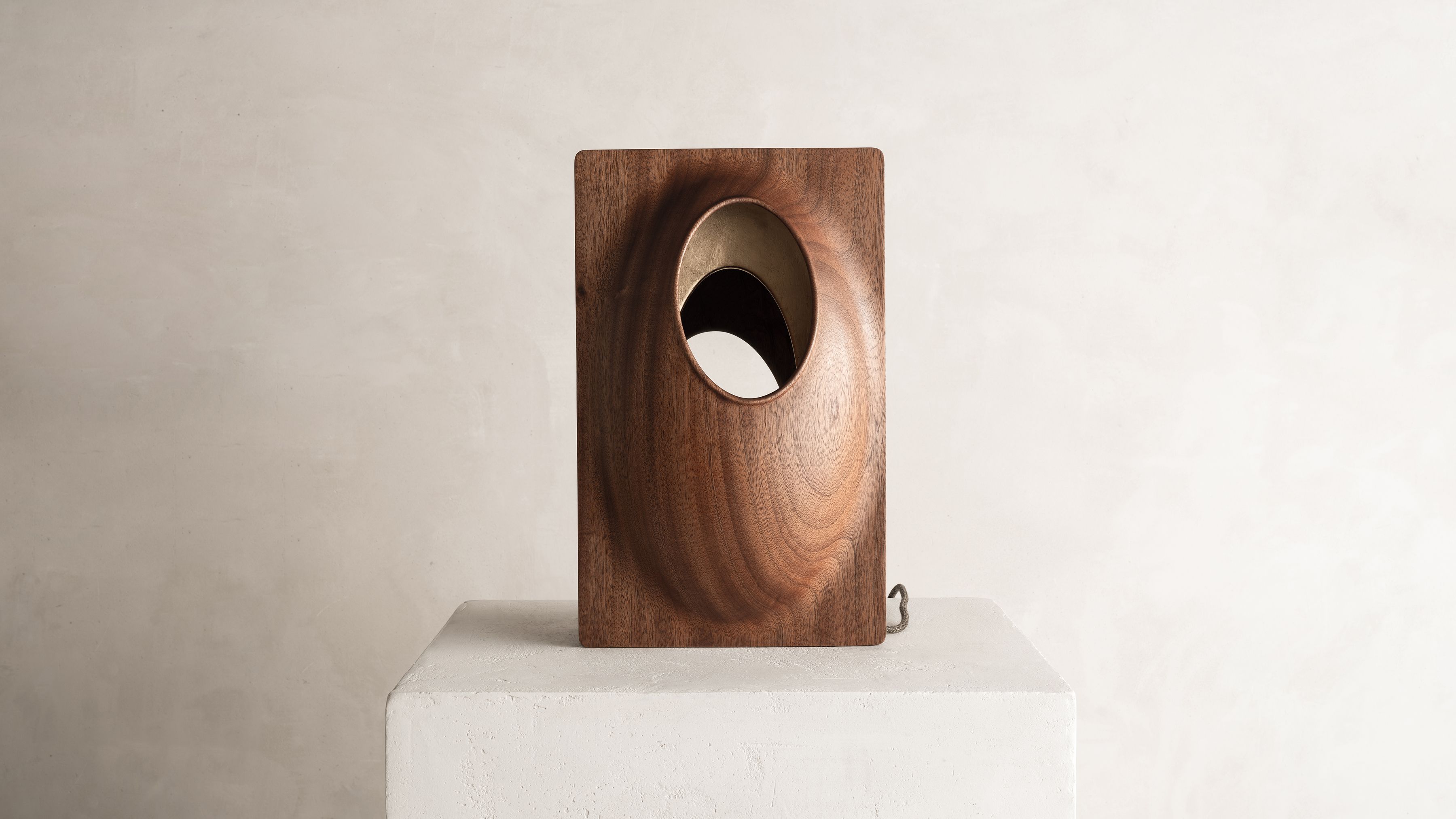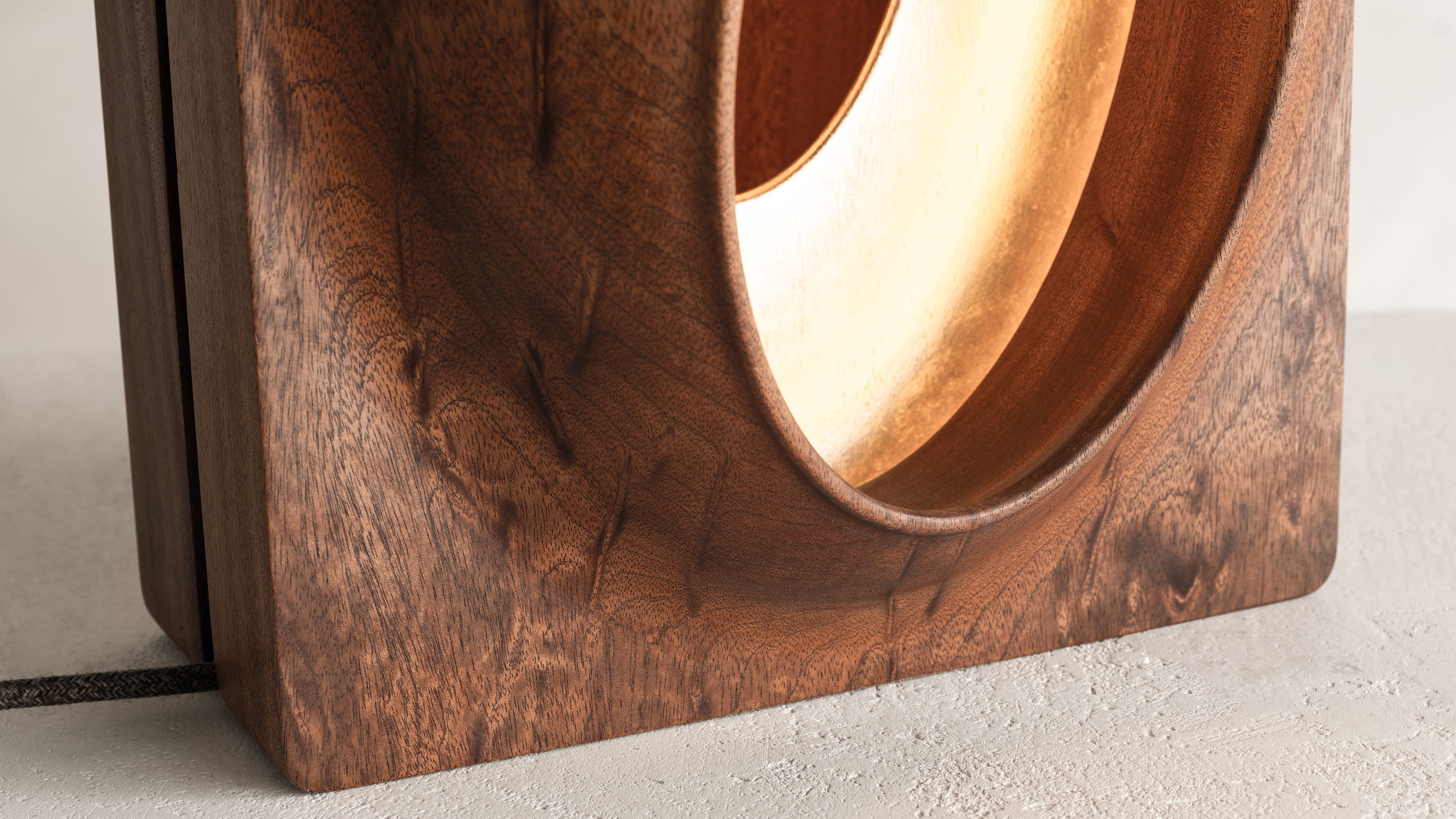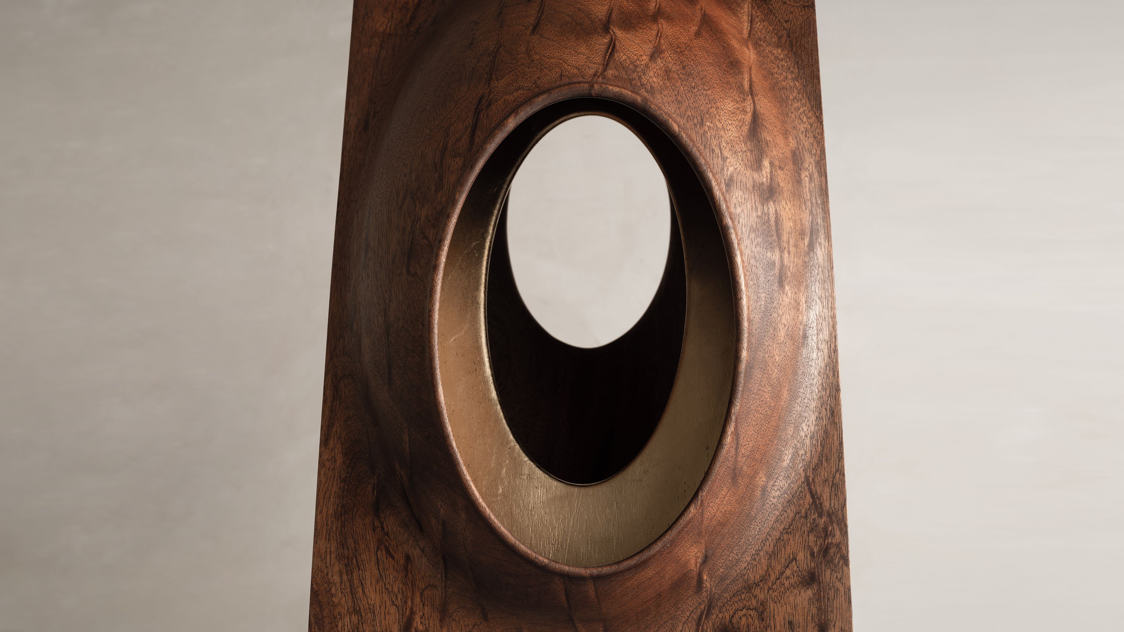 This sculptural light piece by Thierry Dreyfus draws inspiration from the beautiful simplicity and abstract, organic sensuality found in the works of an artist he has long admired, Brancusi. Soft curves carved in solid walnut open up to a 24K gold leaf-gilded womb from which the light emanates. Lamp J edition is part of Thierry Dreyfus' "Objets de Lumiére" catalogue. Conceived in 2020, the piece expands on the artist’s significant body of work and his continuous explorations of light as an ethereal medium allowing sensorial experiences to trigger our thoughts and emotions. Whether exemplified in his monumental public art installations or the ephemeral experiences of his scenography commissions, Dreyfus’s work seems rooted in the dialectic between creating light and creating with light.