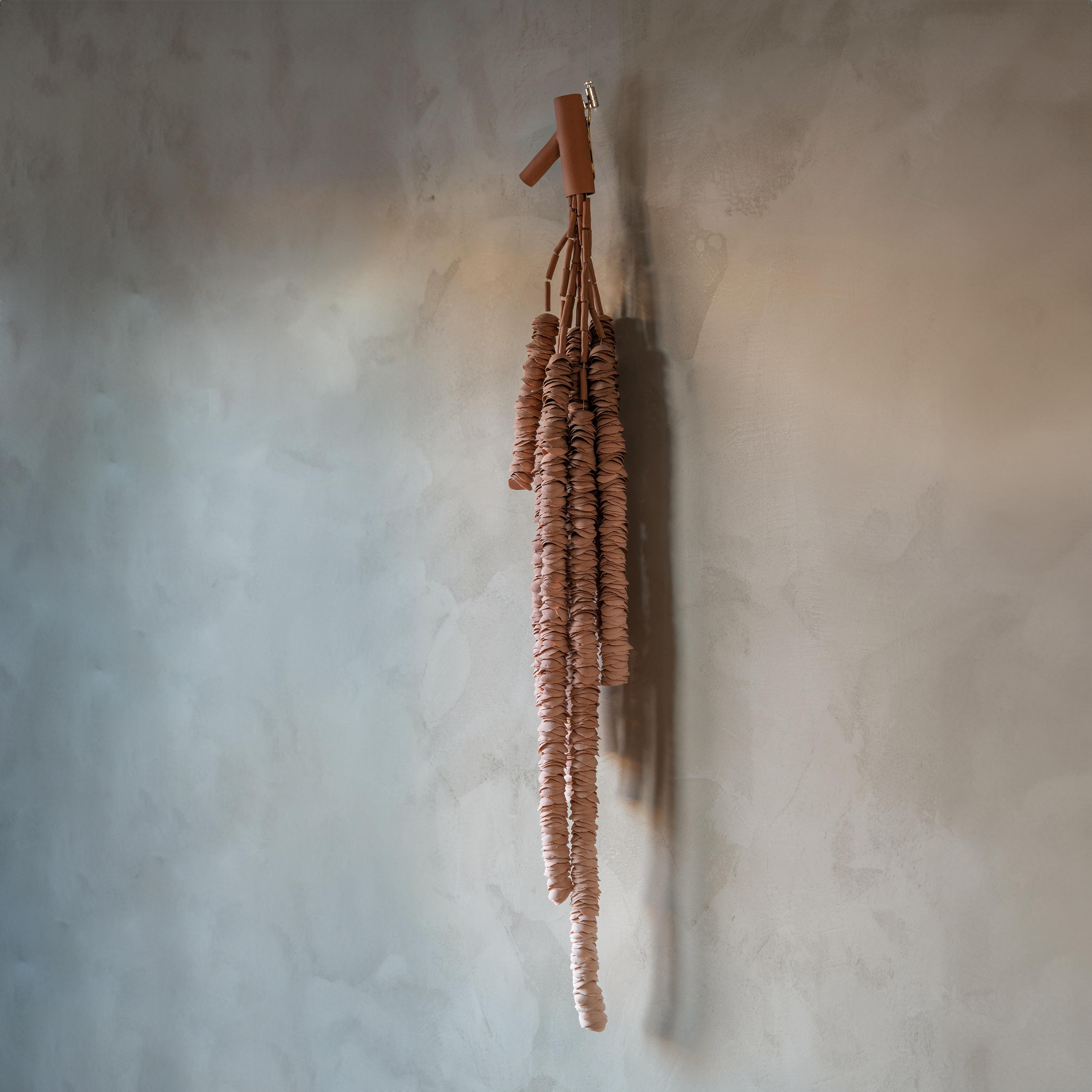 Today, Nascimento has developed a significant body of work, primarily composed of hand-modeled bisque porcelain installations. Her site-specific pieces represent a meticulously mapped ensemble of nature-inspired elements, individually hand-formed by the artist. Each resembles an ethereal mycelium landscape drawing from a confluence of inspirations rooted in the lust nature of her native environment and the urban fabrics she studied in architecture. The individual parts of her pieces are often inspired by botanical elements gathered from nature or collected from childhood memories. Whether framed on a panel or mounted directly onto walls or ceilings, her compositions are made up of organized clusters and sequences of hundreds of delicate organic shapes, whisper-thin petals, seeds, or blossom-like forms, all modeled one by one in her studio.