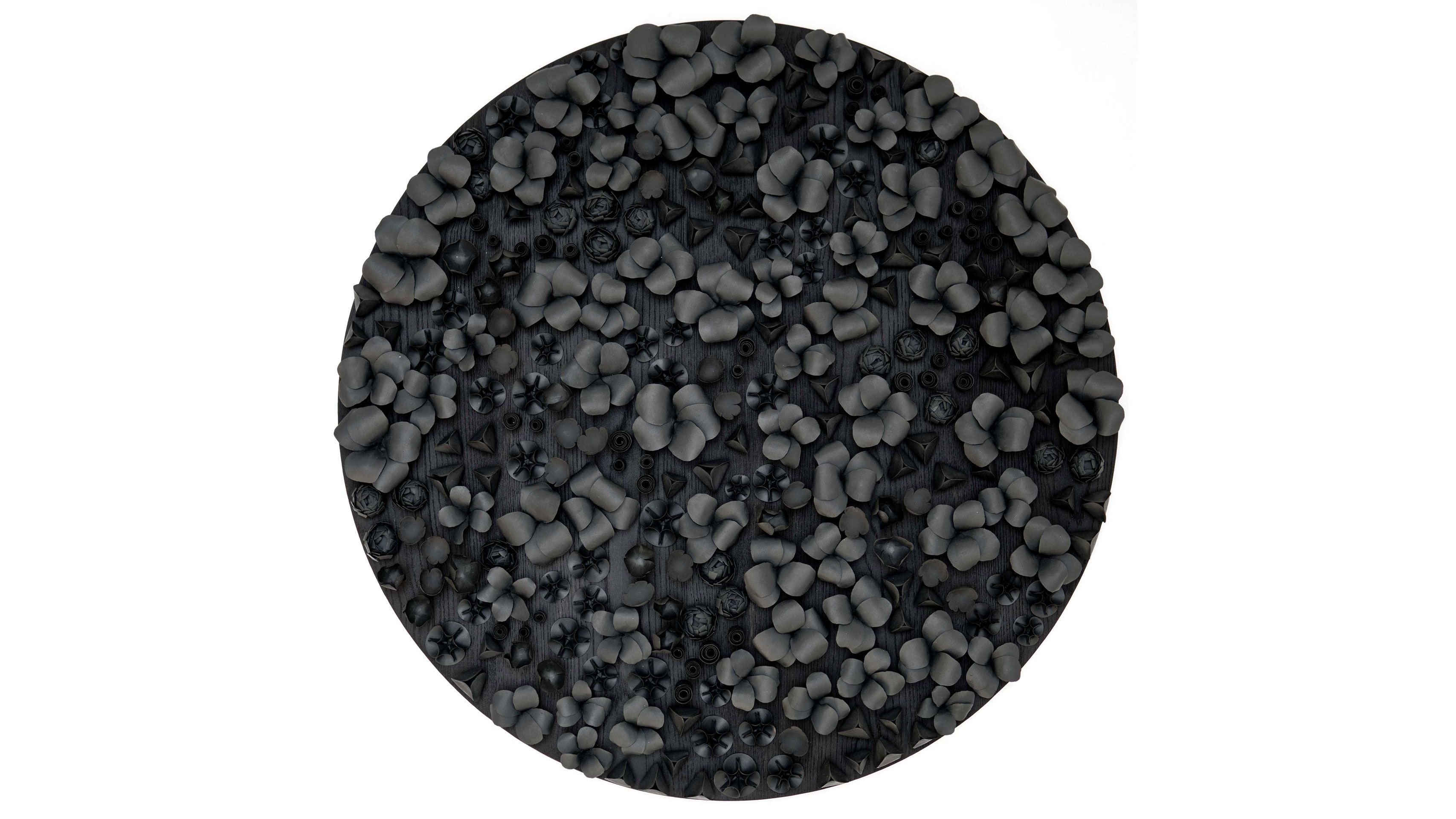 Today, Nascimento has developed a significant body of work, primarily composed of hand-modeled bisque porcelain installations. Her site-specific pieces represent a meticulously mapped ensemble of nature-inspired elements, individually hand-formed by the artist. Each resembles an ethereal mycelium landscape drawing from a confluence of inspirations rooted in the lust nature of her native environment and the urban fabrics she studied in architecture. The individual parts of her pieces are often inspired by botanical elements gathered from nature or collected from childhood memories. Whether framed on a panel or mounted directly onto walls or ceilings, her compositions are made up of organized clusters and sequences of hundreds of delicate organic shapes, whisper-thin petals, seeds, or blossom-like forms, all modeled one by one in her studio.