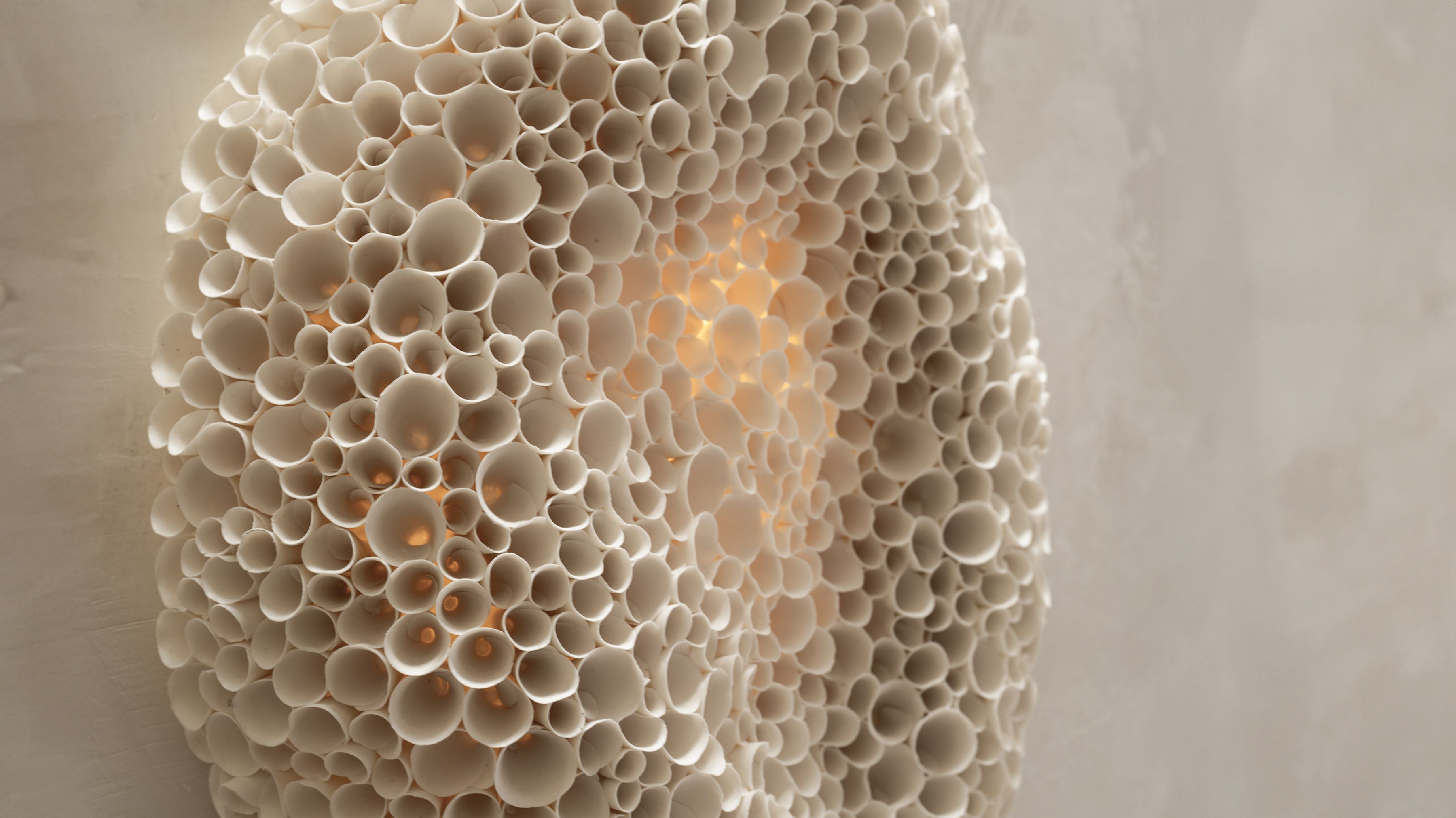 Today, Nascimento has developed a significant body of work, primarily composed of hand-modeled bisque porcelain installations. Her site-specific pieces represent a meticulously mapped ensemble of nature-inspired elements, individually hand-formed by the artist. Each resembles an ethereal mycelium landscape drawing from a confluence of inspirations rooted in the lust nature of her native environment and the urban fabrics she studied in architecture. The individual parts of her pieces are often inspired by botanical elements gathered from nature or collected from childhood memories. Whether framed on a panel or mounted directly onto walls or ceilings, her compositions are made up of organized clusters and sequences of hundreds of delicate organic shapes, whisper-thin petals, seeds, or blossom-like forms, all modeled one by one in her studio.