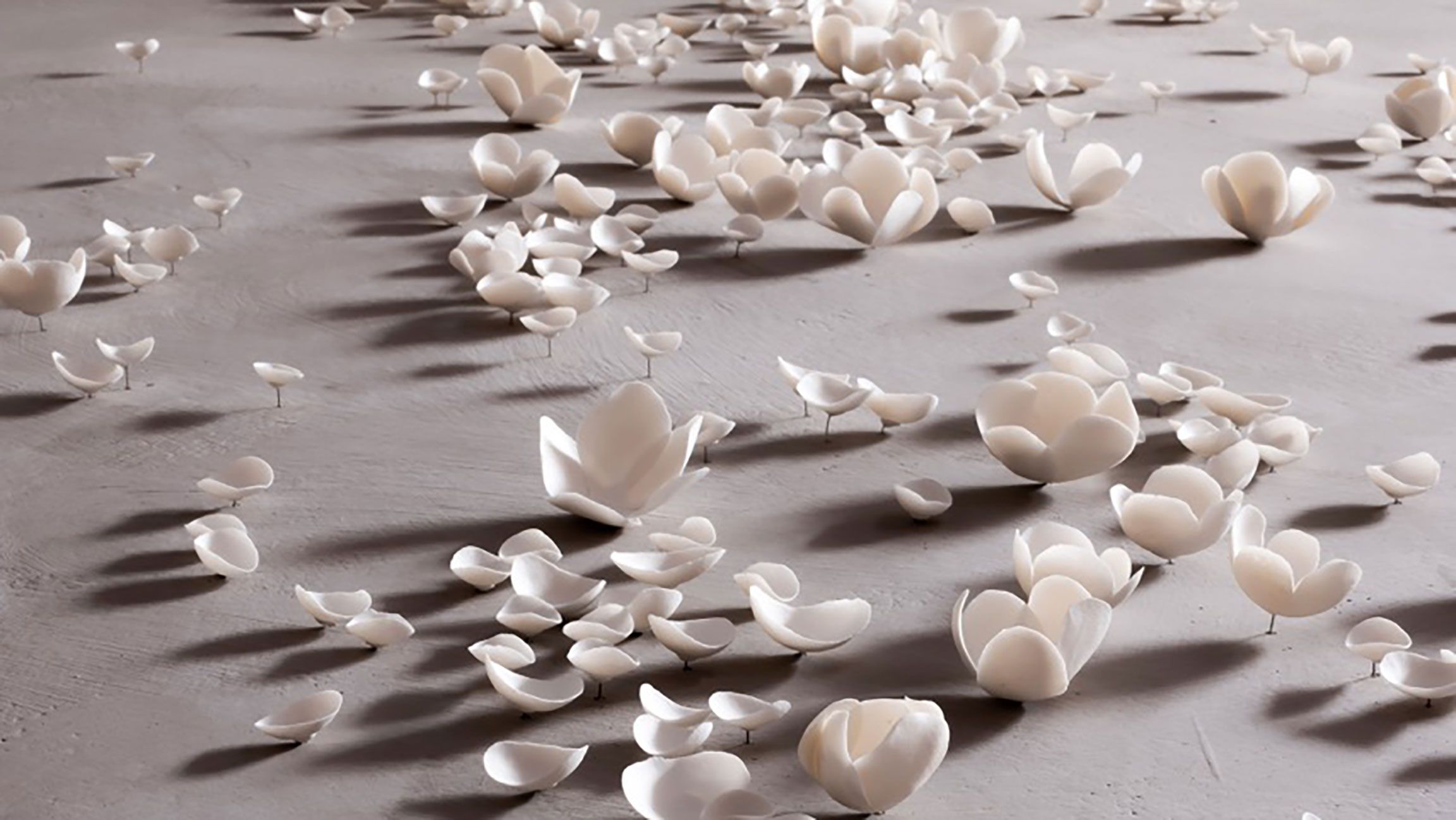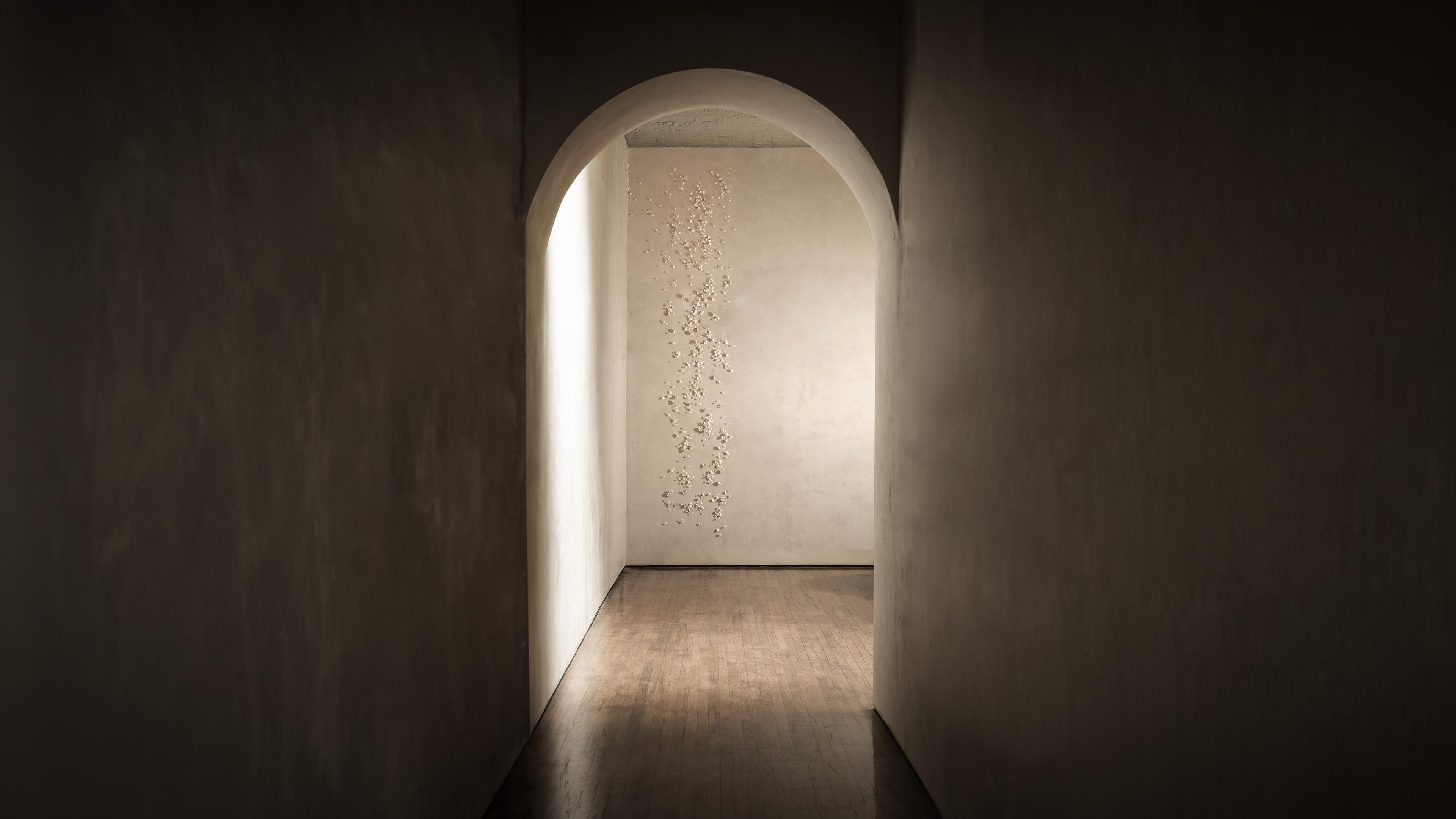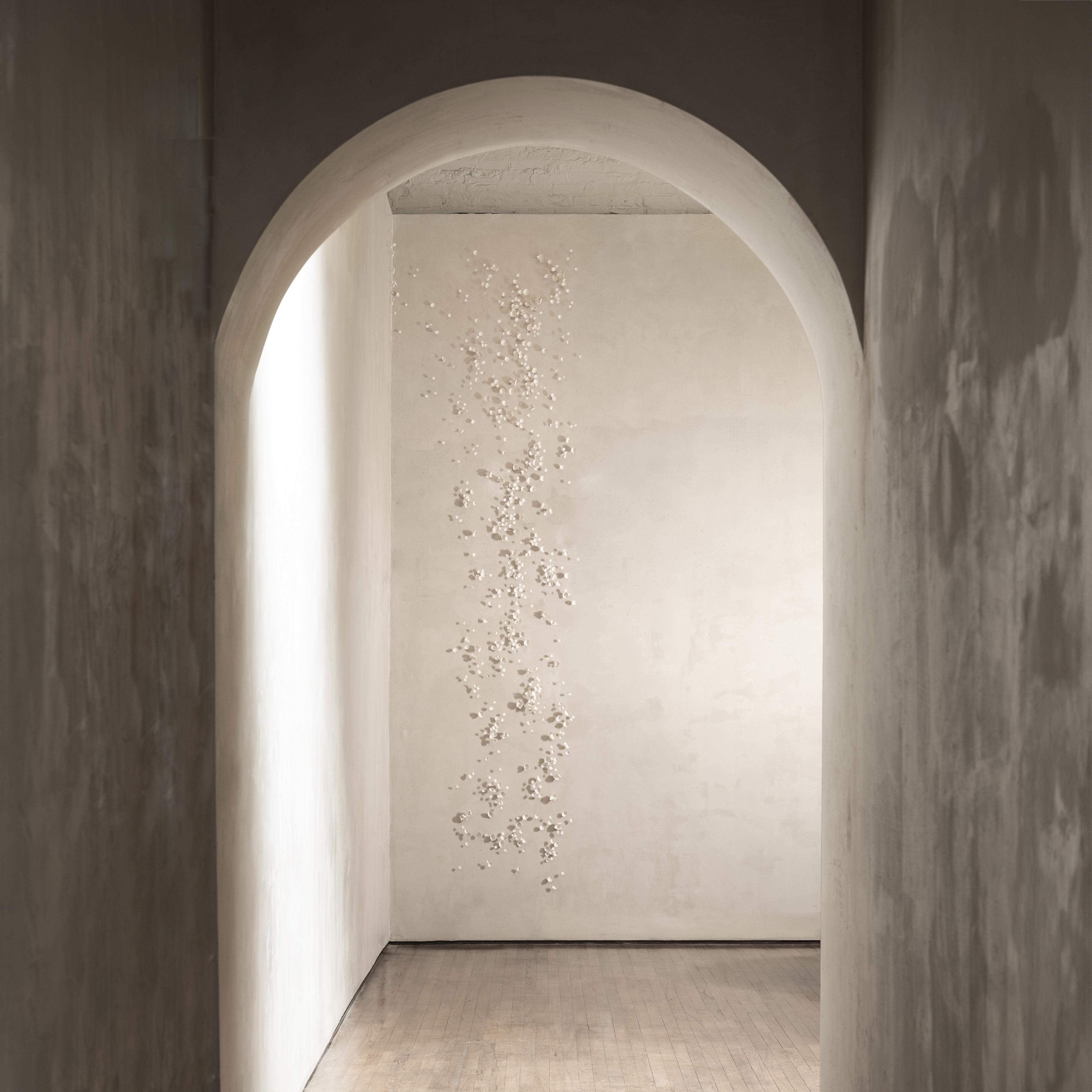 Today, Nascimento has developed a significant body of work, primarily composed of hand-modeled bisque porcelain installations. Her site-specific pieces represent a meticulously mapped ensemble of nature-inspired elements, individually hand-formed by the artist. Each resembles an ethereal mycelium landscape drawing from a confluence of inspirations rooted in the lust nature of her native environment and the urban fabrics she studied in architecture. The individual parts of her pieces are often inspired by botanical elements gathered from nature or collected from childhood memories. Whether framed on a panel or mounted directly onto walls or ceilings, her compositions are made up of organized clusters and sequences of hundreds of delicate organic shapes, whisper-thin petals, seeds, or blossom-like forms, all modeled one by one in her studio.