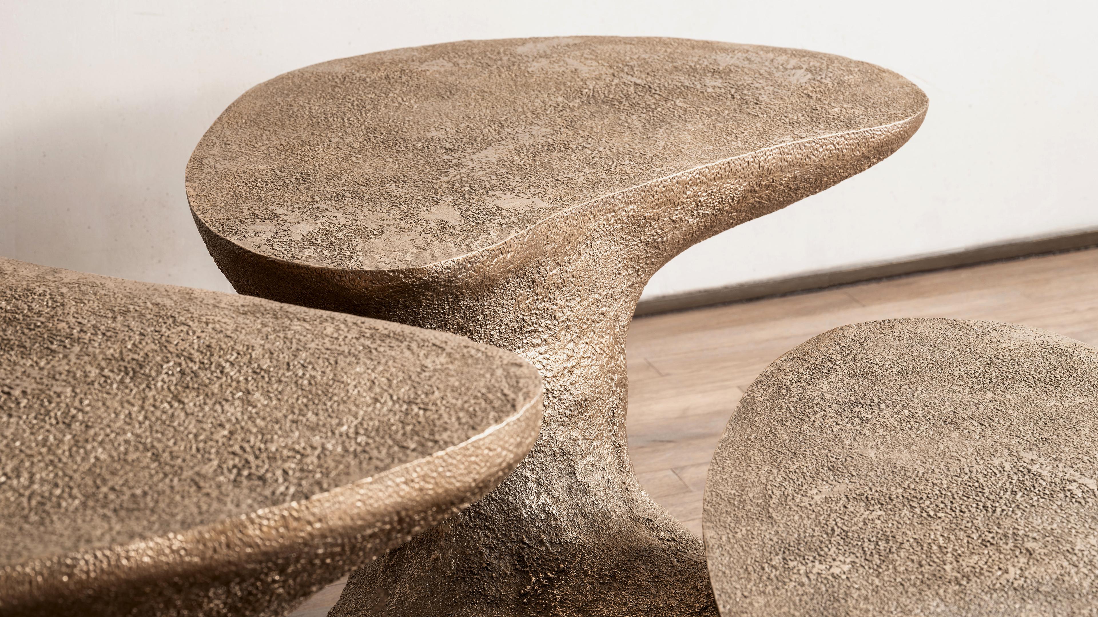 With correlating artistic sensibilities, Cárcamo’s abstract and sensuous forms morphed under the creative direction of Donnersberg – whose personal work draws inspiration from the natural world and translates the sensuous lines of clouds, mushrooms, and Bonsai, amongst others, into functional and sculptural design pieces. The Penzai series showcases this vocabulary with three sculptural tables and two lamps all materialized from a sculptural design that was hand molded in plaster and worked with artisans, primarily in bronze, to complete the designs using the lost-wax technique.